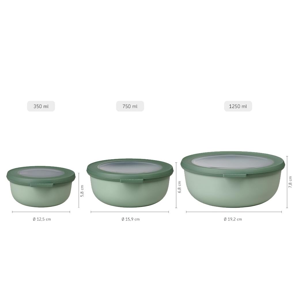 Das Mepal Cirqula Multi-Schüssel-Set in Nordic Lilac ist der ultimative Allrounder für jede Küche. Dieses 3-teilige Set enthält runde Schalen in den Grössen 350 ml, 750 ml und 1250 ml. Die Cirqula Aufbewahrungsboxen können zum Aufbewahren, Einfrieren und Aufwärmen von Lebensmitteln verwendet werden. Die Schalen eignen sich ideal als Frischebox oder Snackbox für die Aufbewahrung von Resten, Suppenportionen, kleinen Salaten oder Babynahrung. Wussten Sie, dass die Behälter auch für die Zubereitung von Mahlzeiten geeignet sind? Die Schalen können z. B. als Behälter für Haferflocken, Brei oder Suppe verwendet werden. Es ist auch möglich, ganze Mahlzeiten wie Nudel- oder Reisgerichte aufzubewahren und wieder aufzuwärmen. Die Cirqula-Schalen sind auslaufsicher und aromadicht. Dank des Sichtfensters im Deckel sehen Sie auf einen Blick, was Sie im Kühl- oder Gefrierschrank haben. Ausserdem sind die Aufbewahrungsschalen spülmaschinenfest. Die Schalen können ineinander gestapelt werden, um mehr Platz im Küchenschrank zu schaffen. Es ist auch gut zu wissen, dass die Einmachgläser in verschiedenen Farben und Grössen erhältlich sind!