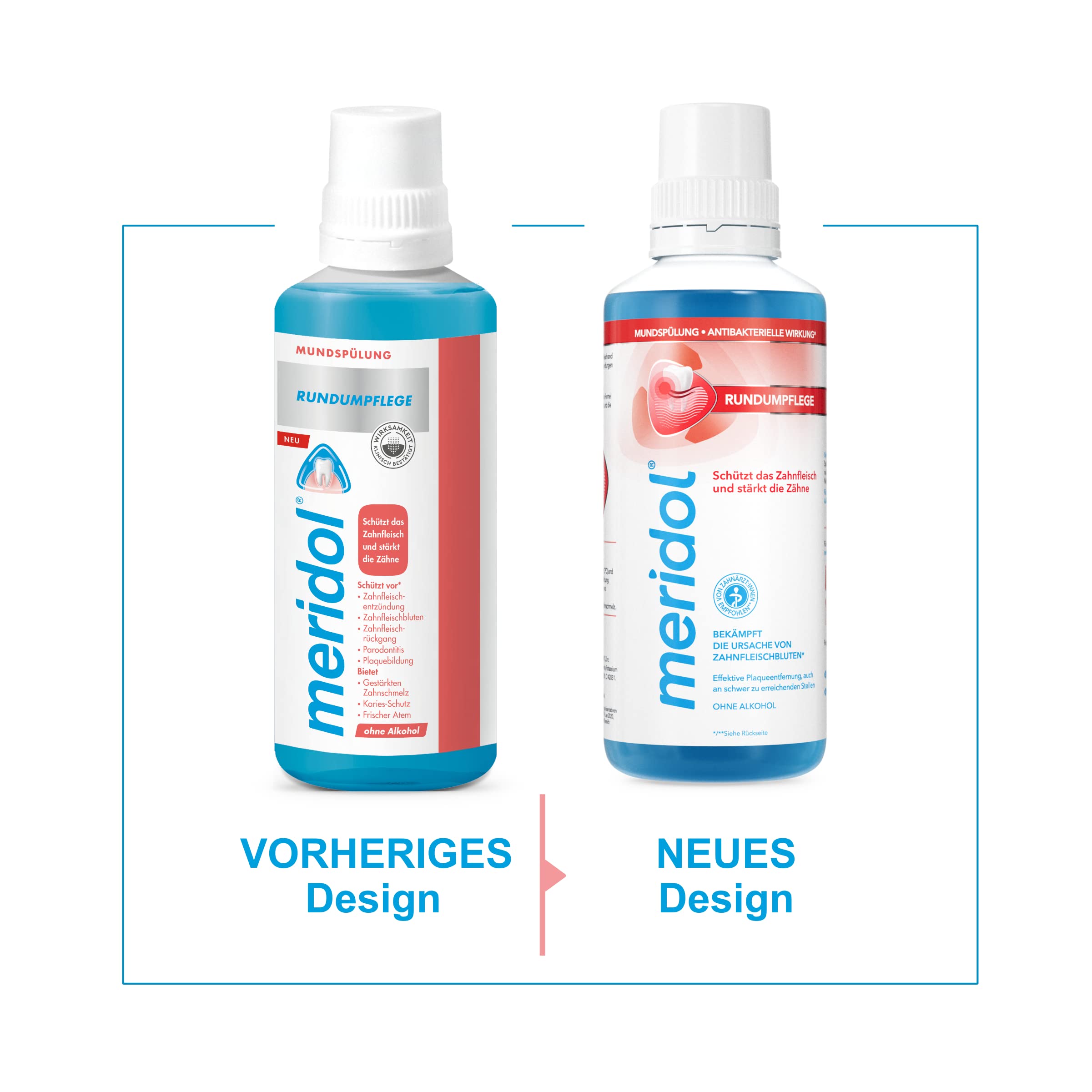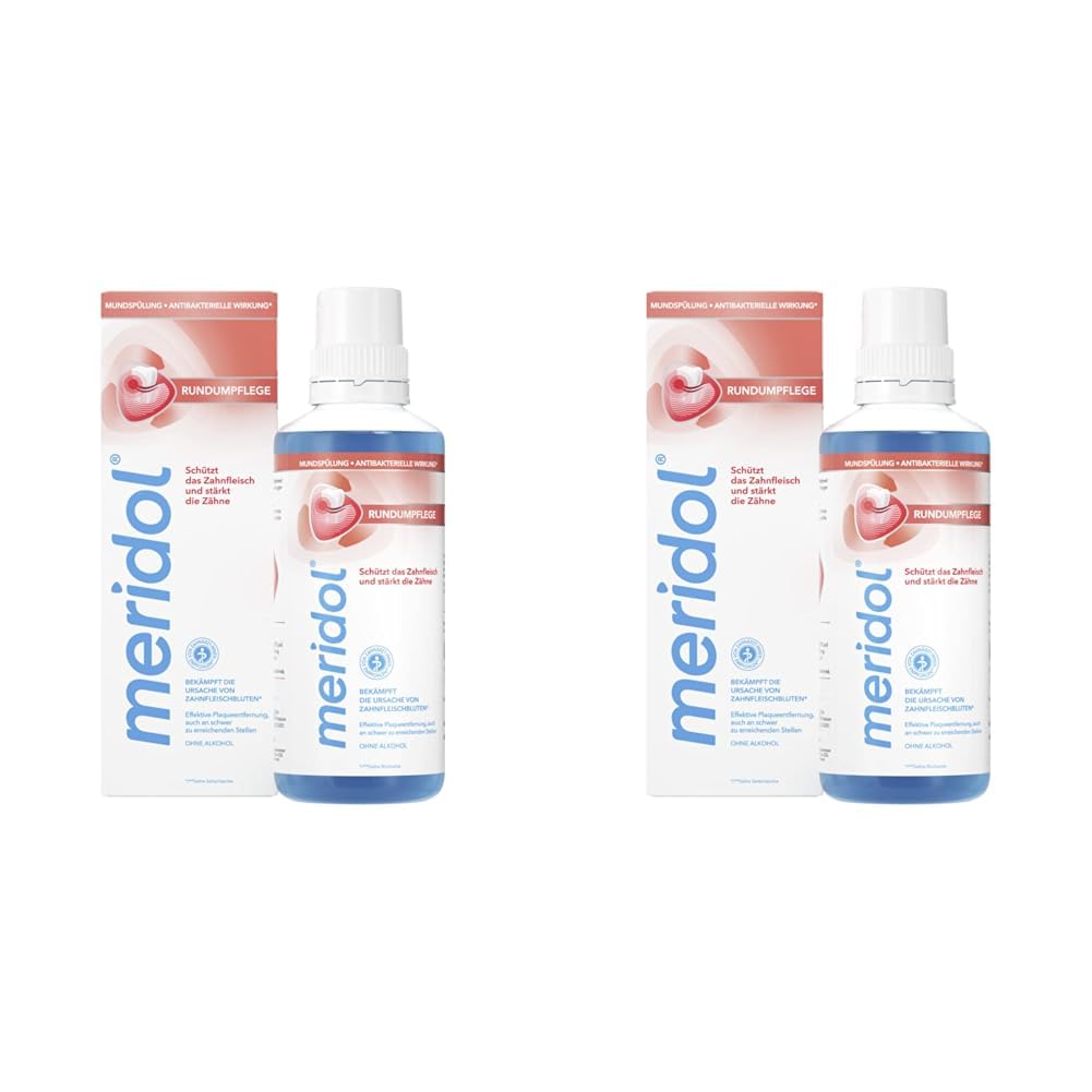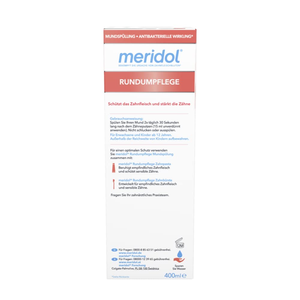 Schützen Sie Ihr Zahnfleisch und stärken Sie Ihre Zähne mit der meridol® Rundumpflege Mundspülung. Diese Zahnfleischschutz Mundspülung wurde von Experten entwickelt, um die Ursache* von Zahnfleischbluten zu bekämpfen. Die Mundspülung schützt auch Ihr Zahnfleisch und stärkt Ihre Zähne und hat eine wirksame 2-fach Wirkformel, die eine lang anhaltende antibakterielle Wirkung** bietet. Sie beugt Karies und schlechtem Atem vor und stärkt den Zahnschmelz. Die 2-fach Wirkformel in dieser Mundspülung für Zahnfleischprobleme schützt auch Ihr Zahnfleisch mit CPC und Zink, die eine lang anhaltende antibakterielle Wirkung** haben, während Fluorid hilft, geschwächten Zahnschmelz zu stärken. Diese Zahnfleisch Mundspülung hilft nicht nur, die Zähne sauber und das Zahnfleisch gesund zu halten, sondern schützt auch vor:• Zahnfleischentzündungen• Zahnfleischbluten• Zahnfleischrückgang• Parodontitis• Plaque• ZahnsteinFür den optimalen Schutz verwenden Sie die meridol Complete Care Mundspülung als Teil Ihrer täglichen Mund und Zahnpflege mit der meridol Complete Care Zahnpasta für schmerzempfindliches Zahnfleisch und sensible Zähne, der meridol Complete Care Zahnbürste und der meridol Zahnseide.*Bekämpft Plaquebakterien, bevor Zahnfleischbluten entsteht, bei regelmässiger Anwendung. **Die meridol-Produktfamilie ist eine Empfehlung bei einer repräsentativen telefonischen Umfrage bei 300 Zahnärzt:innen im Dez 2019/ Jan 2020, gefragt nach Marken-Empfehlungen für Mundspülungen im Bereich Zahnfleischentzündung.