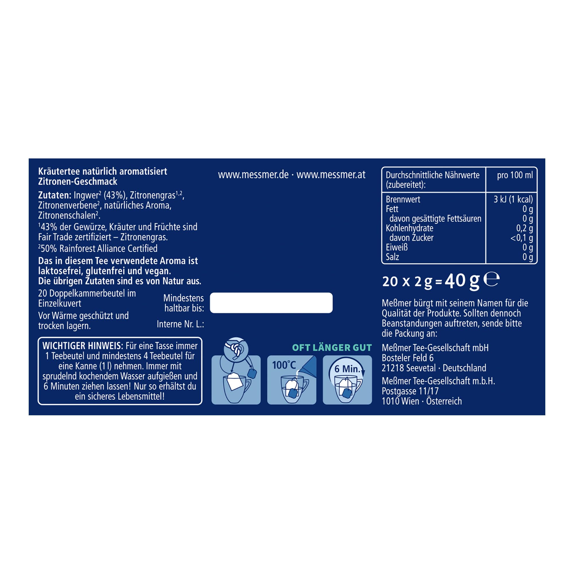 Messmer Ingwer-Zitrone | 20 Teebeutel | Vegan | Glutenfrei | Laktosefrei