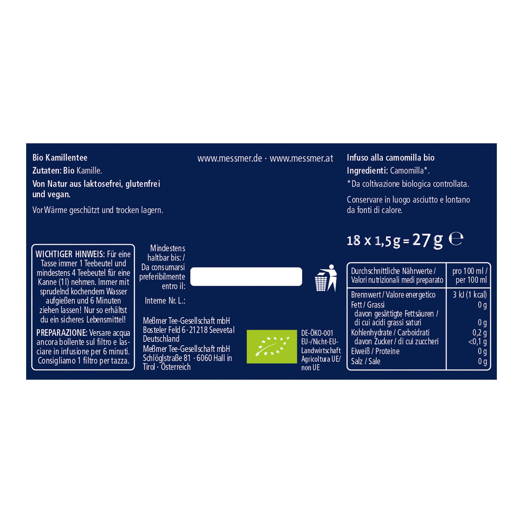 Messmer Bio Kamille | mild | 18 Teebeutel | Vegan | Glutenfrei | Laktosefrei