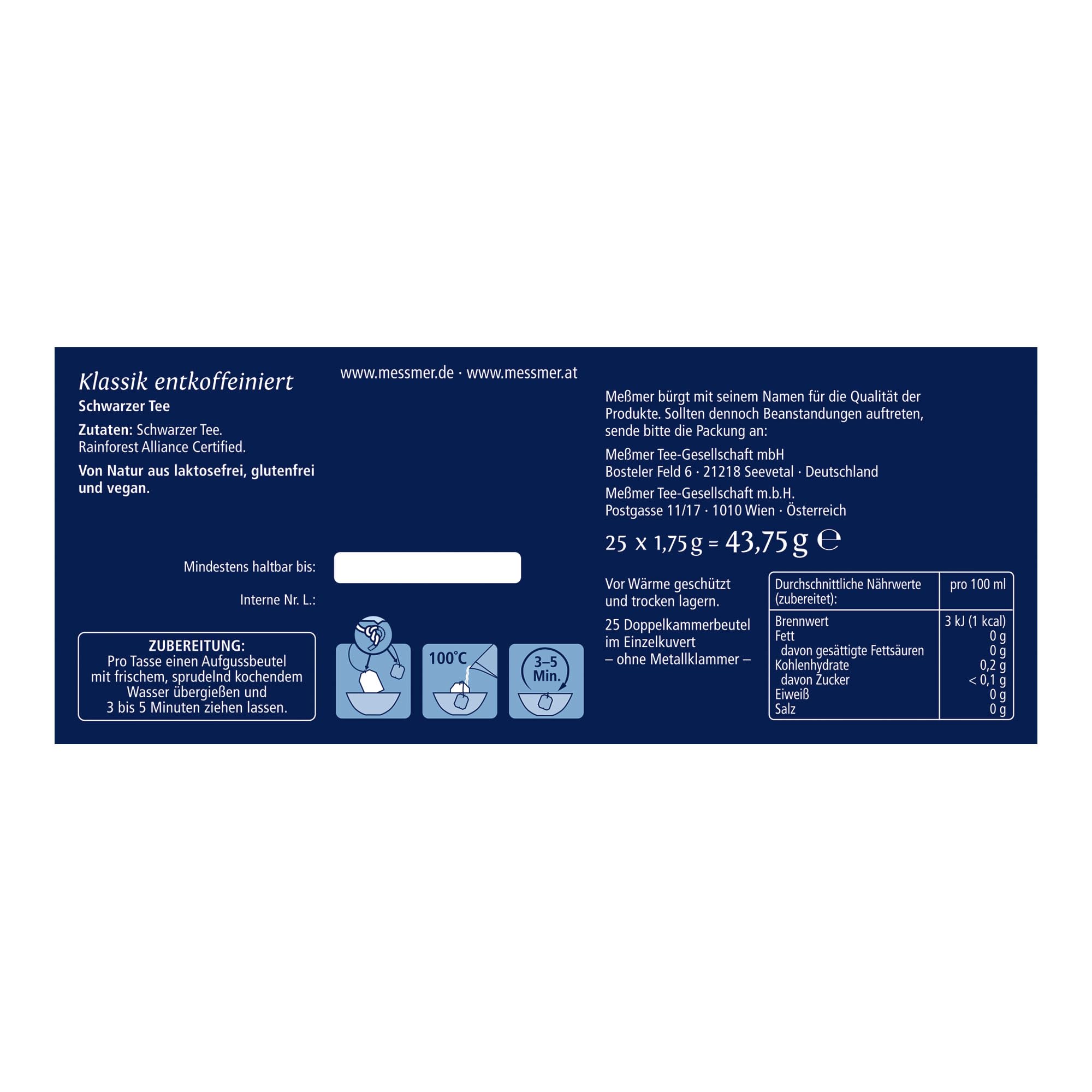 Meßmer Klassik entkoffiniert | fein-aromatisch | 25 Teebeutel | Vegan | Glutenfrei | Laktosefrei, 0,043 kg