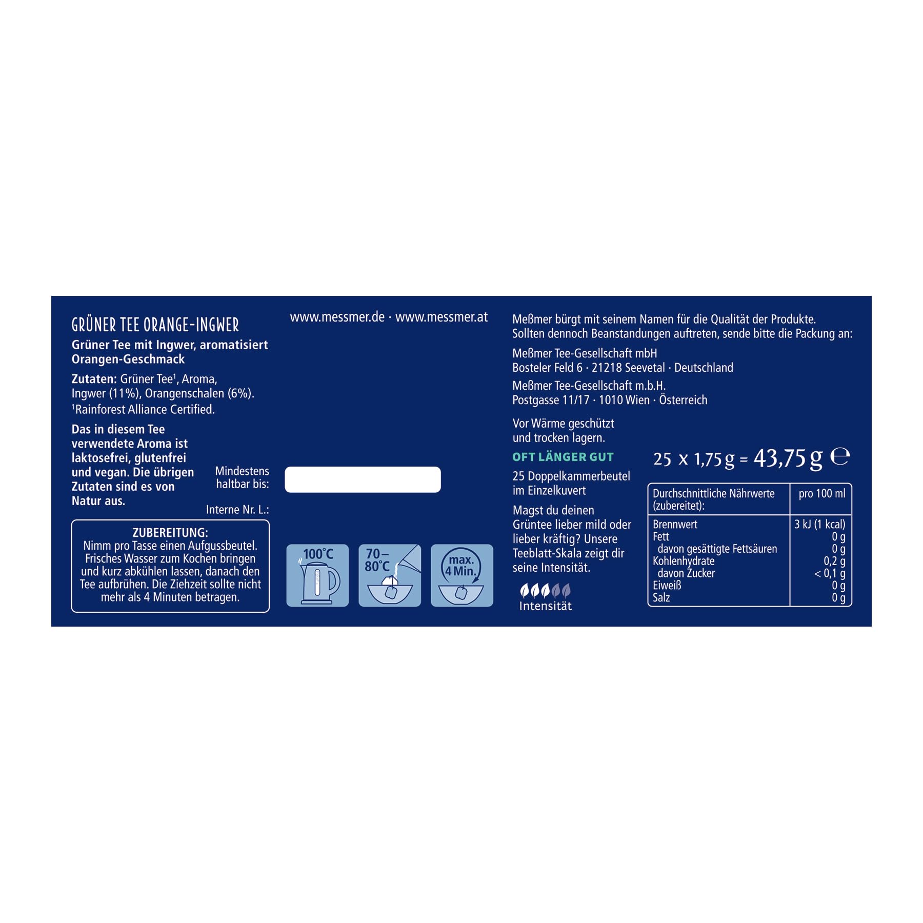 Messmer Grüner Tee Orange Ingwer | 25 Teebeutel | Vegan | Glutenfrei | Laktosefrei