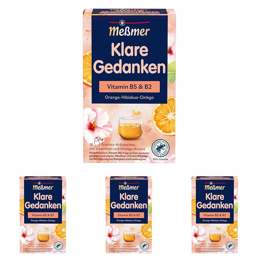 Messmer Klare Gedanken | Früchte-Kräutertee mit Orangen-Aroma und Vitaminen B5 & B2 | Orange-Hibiskus-Ginkgo | 16 Teebeutel (Packung mit 4)