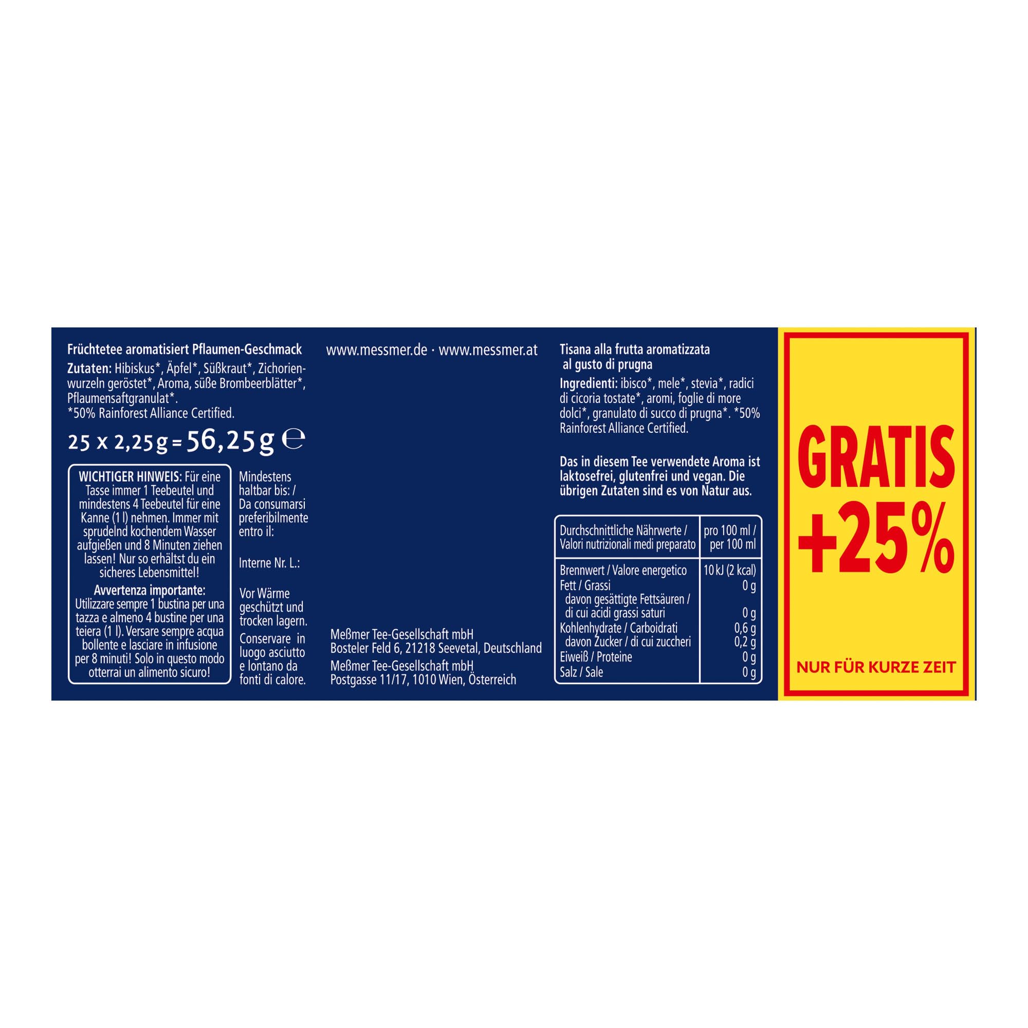 Mindestanzahl für die Bestellung von "Messmer Ländertee Französische Pflaume | Vorteilspackung 20+5 Teebeutel | Früchtetee mit Pflaumen-Aroma" ist 1.