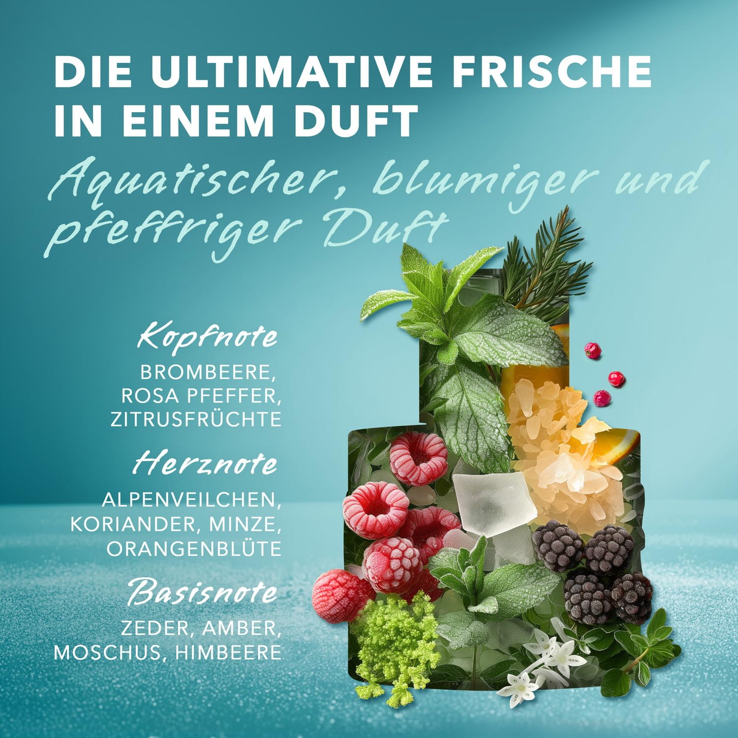 • Brombeere, Zitrusfrüchte und ein belebender Hauch schwarzen Pfeffers werden von zarten Blüten, frischer Minze und einer Basis aus Zedernholz, Amber, Moschus und Himbeere begleitet