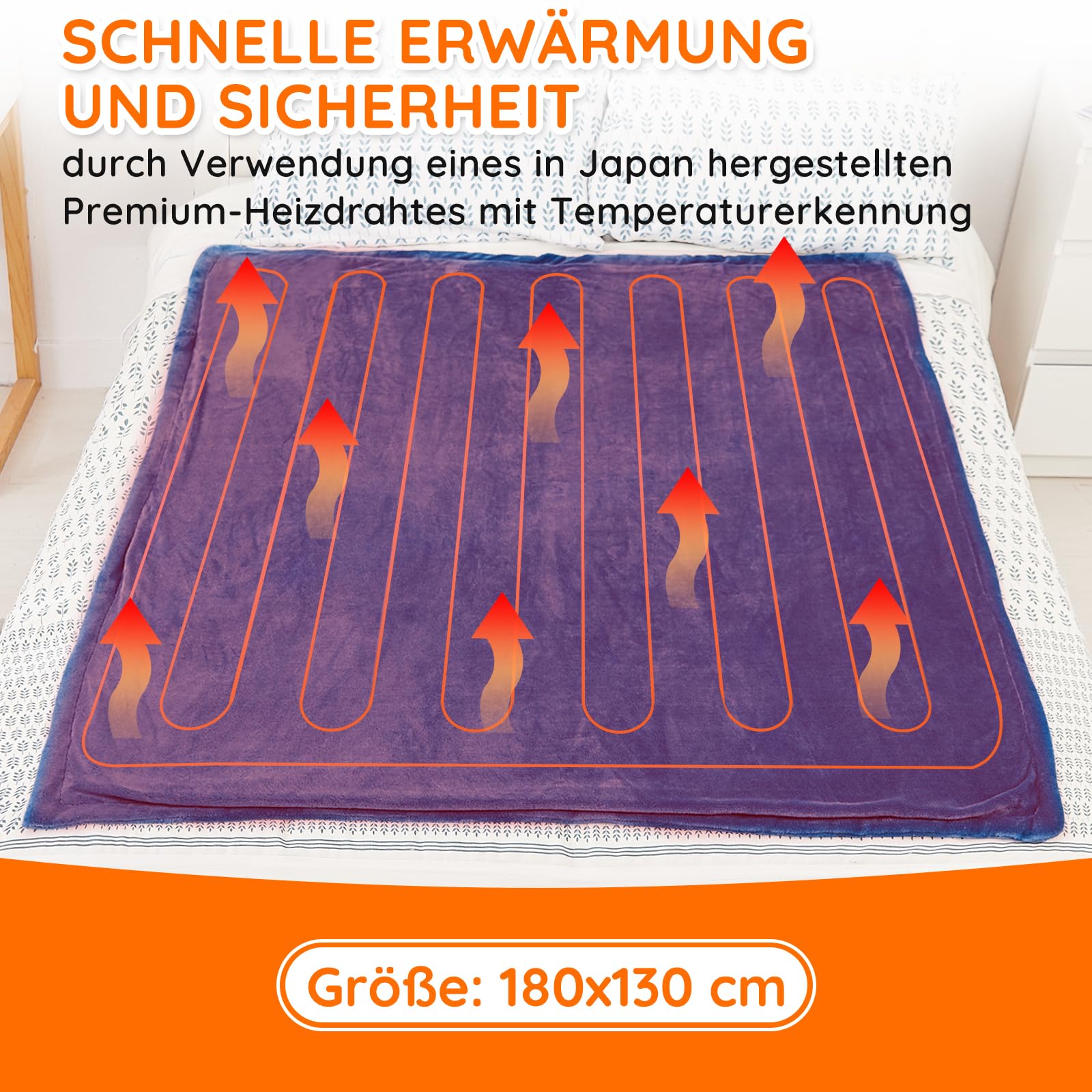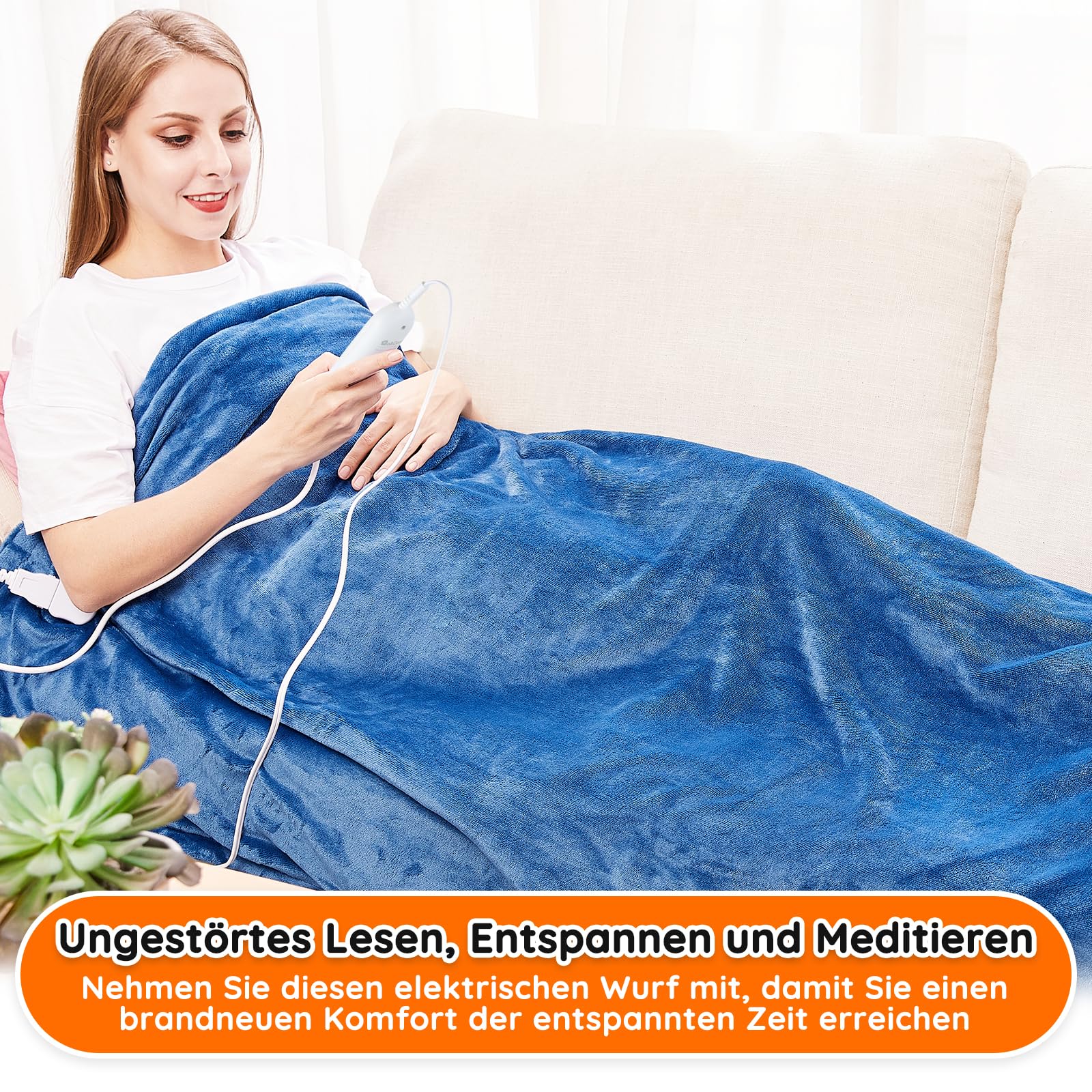 Heizdecke mit Abschaltautomatik, 130x180cm 10 Heizstufen 1~9 Stunden Auto-Off-Timer Überhitzungsschutz, Elektrische Wärmedecke Bett Wärme Decke ETL für Home & Office Schnelle Flanell Waschbar Blau