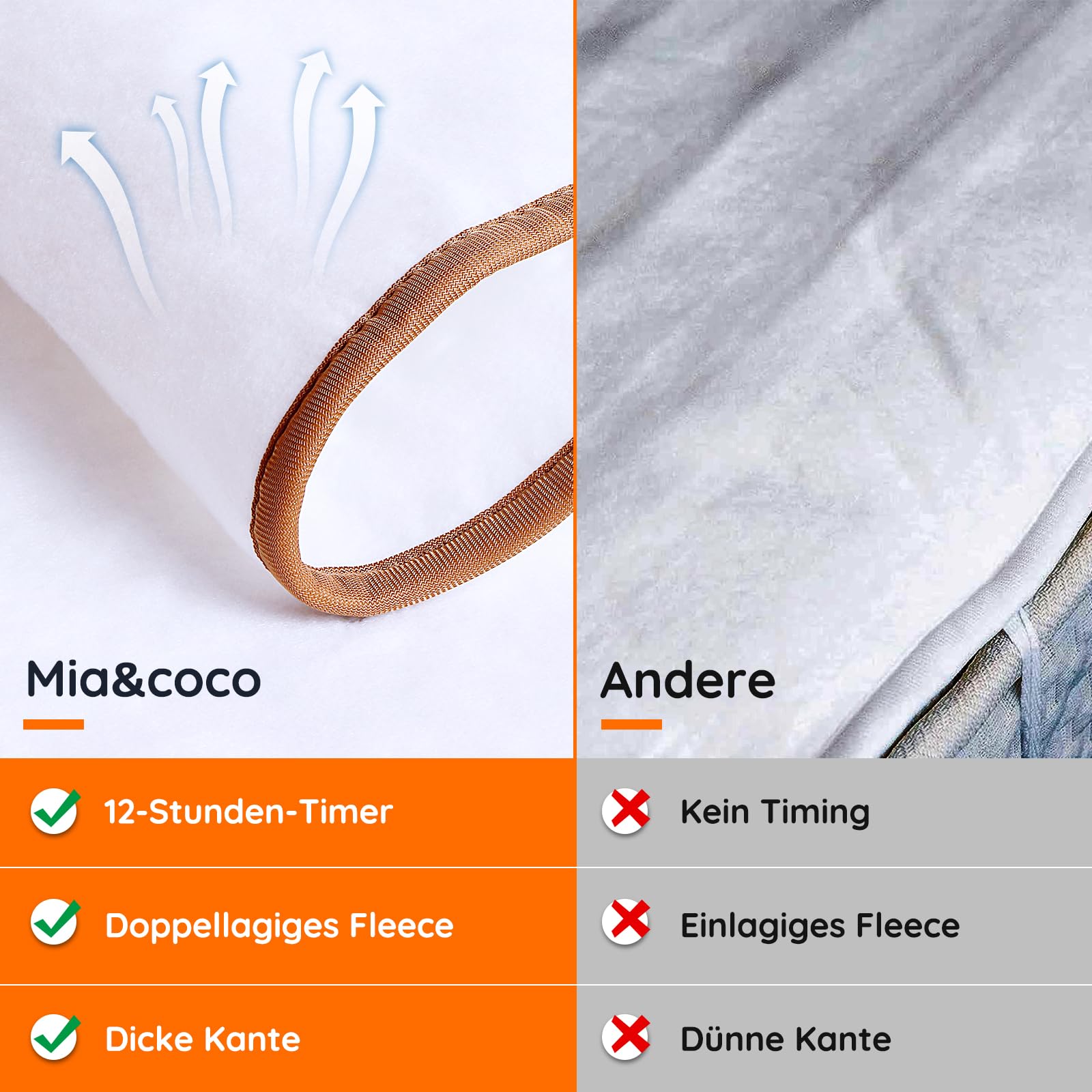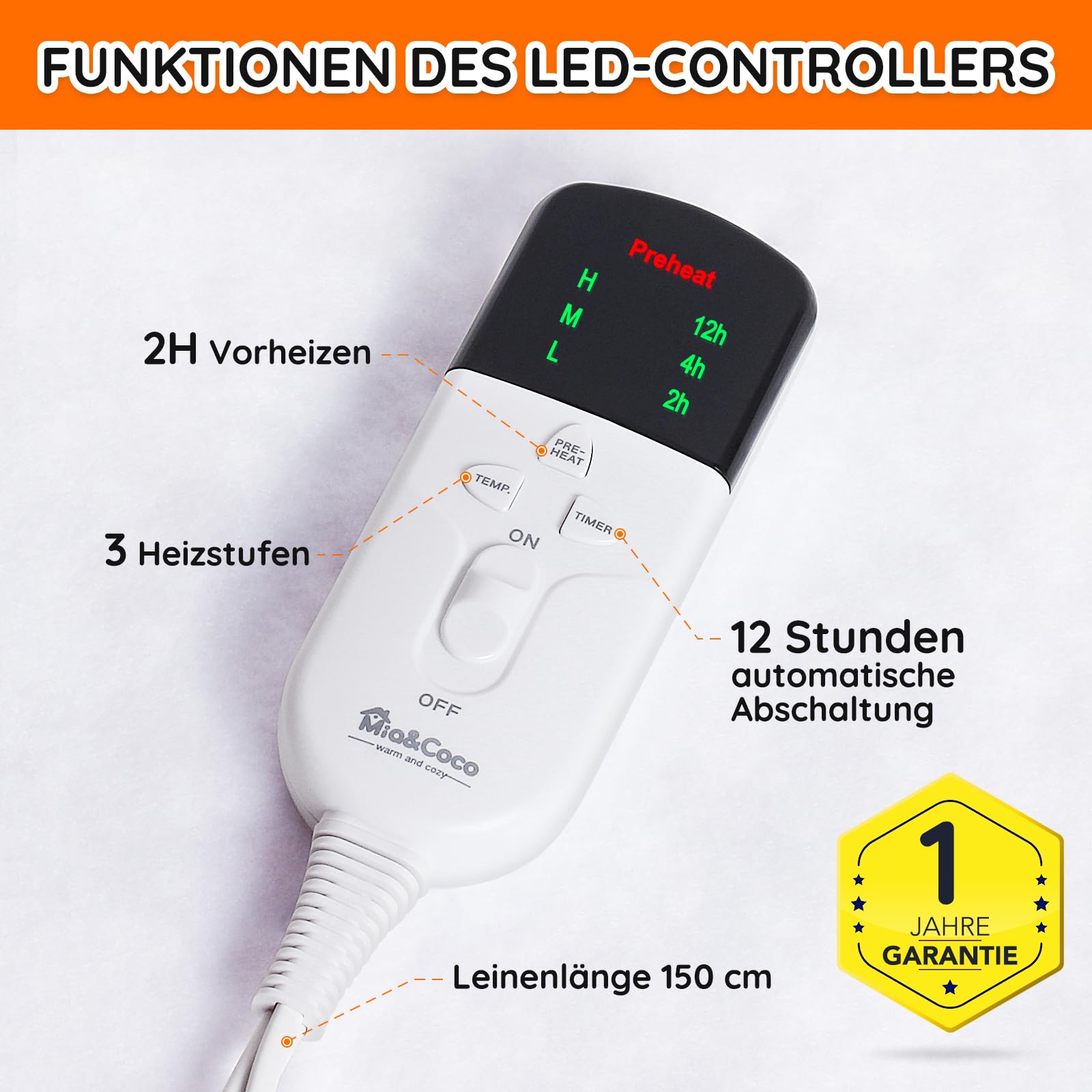 Mia&Coco Heizdecke mit Abschaltautomatik, 150 x 80 cm, Wärmeunterbett mit 12-Stunden-Timer und 3 Wärmestufen, LED-Anzeige, Überhitzungsschutz, Wärmedecke für Gängigen Matratzen,Maschinenwaschbar