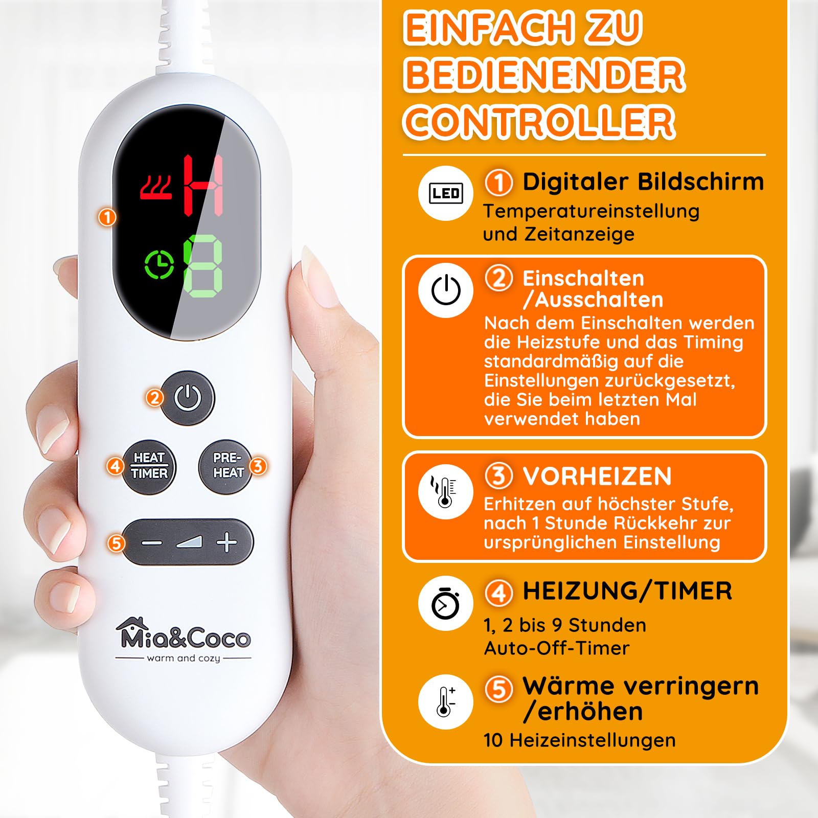 Wohlige Wärme – flexibel, schnell & sicher. Die Mia&Coco Heizdecke mit Abschaltautomatik spendet angenehme Wärme für kalte Nächte, entspannte Fernsehabende oder Lesestunden. Mit dem fortschrittlichen PTC+NTC Dual-Draht-Heizsystem heizt sie schnell auf und hält die Temperatur konstant: PTC-Drähte steuern die Temperatur präzise und halten sie stabil, während NTC-Drähte Überhitzung verhindern, indem sie die Temperatur überwachen und anpassen – für gleichmässige, sichere Wärme die ganze Nacht. Individuelle Einstellung – 10 Heizstufen & Timer. Stellen Sie die Temperatur zwischen ca. 25–53 °C ein und nutzen Sie den bis zu 9 Stunden einstellbaren Timer für sorgenfreies Entspannen – auch im Schlaf. Ergonomischer Controller mit LED-Anzeige. Der abgerundete Controller liegt angenehm in der Hand, mit gut angeordneten, leicht versenkten Tasten, die versehentliches Drücken verhindern. Das LED-Display zeigt Temperatur in Rot und Timer in Grün mit grossen Ziffern – alles auf einen Blick. Extra langes Kabel & sicherer EU-Stecker. Mit 263 cm Kabel und sicherem EU-Stecker geniessen Sie maximale Bewegungsfreiheit – ideal für Bett, Sofa oder gemütliche Filmabende. Hautfreundlich & flauschig weich. Aus hochwertigem Flanell und Sherpa gefertigt, bietet die Decke ein angenehmes Hautgefühl und speichert Wärme effektiv – auch ohne Heizung. Leicht zu reinigen – maschinenwaschbar. Das Kabel lässt sich abnehmen, sodass Sie die Decke bequem in der Waschmaschine reinigen können – für dauerhafte Hygiene und Komfort. Sicher & zertifiziert. Die Decke ist ETL- und CE-zertifiziert und mit integriertem Überhitzungsschutz ausgestattet, der auch über Nacht Sicherheit bietet.