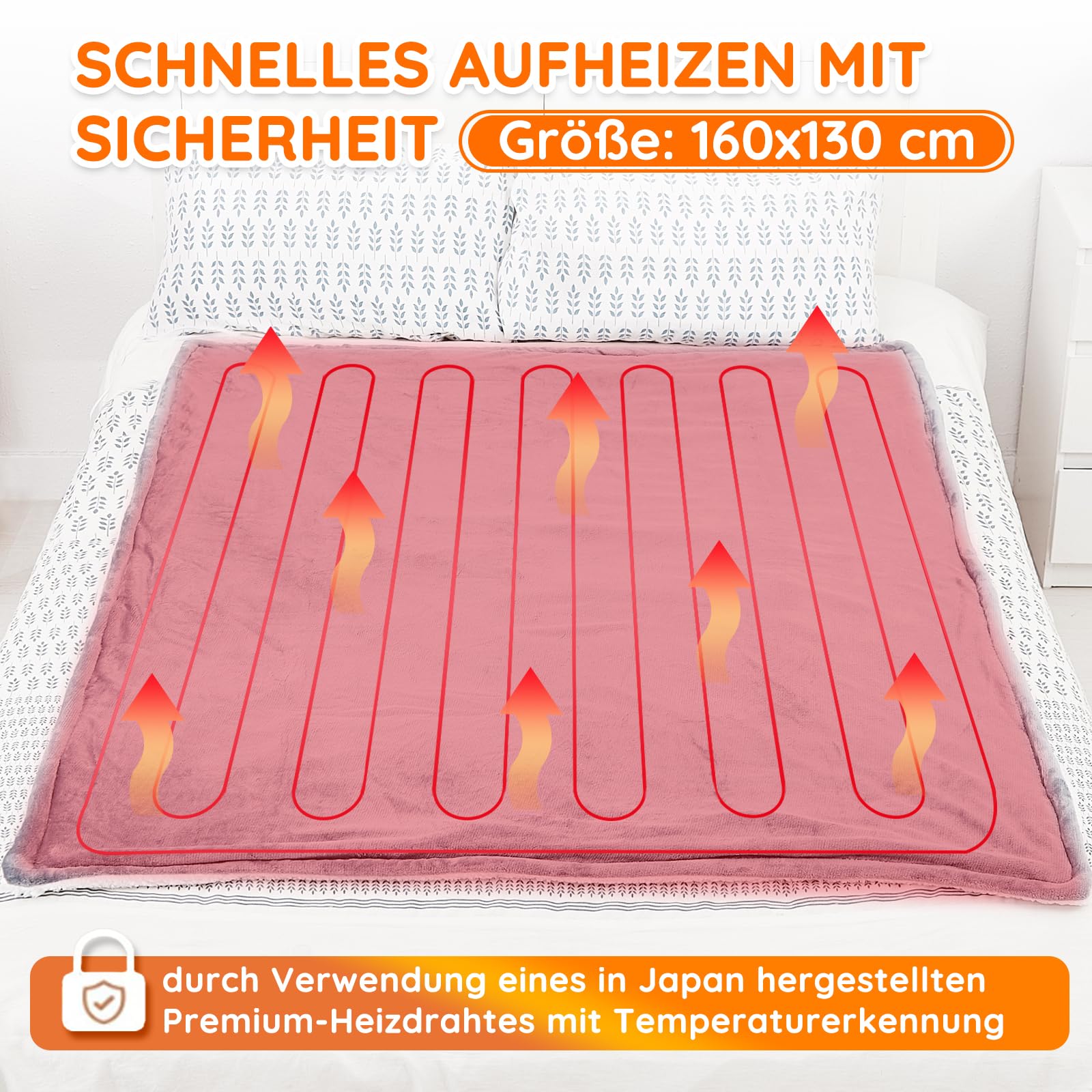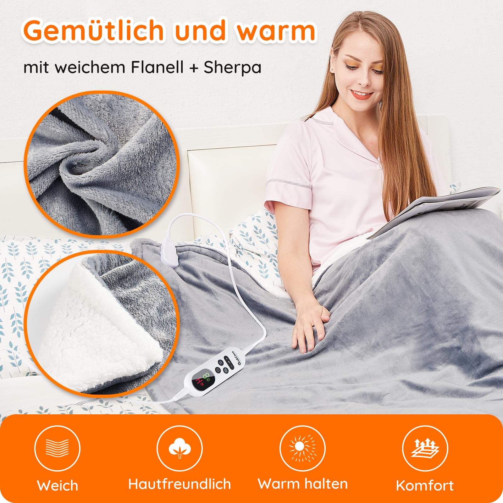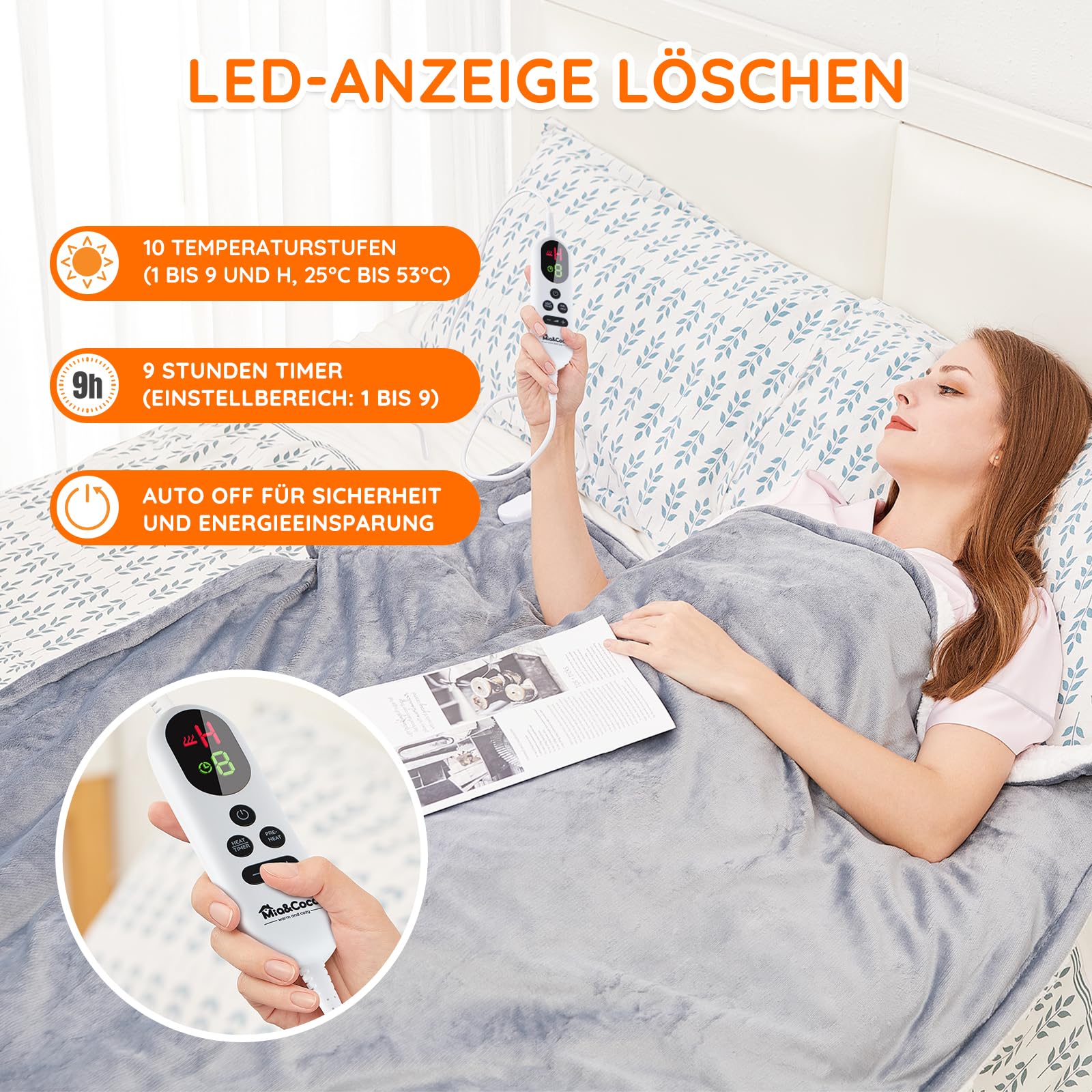 Mia&Coco Heizdecke mit Abschaltautomatik 160x130 cm, 10 Heizstufen, 9 Std. Auto-Off Timer, Überhitzungsschutz, maschinenwaschbar, elektrische Wärmedecke aus Flanell für Bett, Sofa & Wohnzimmer, Grau