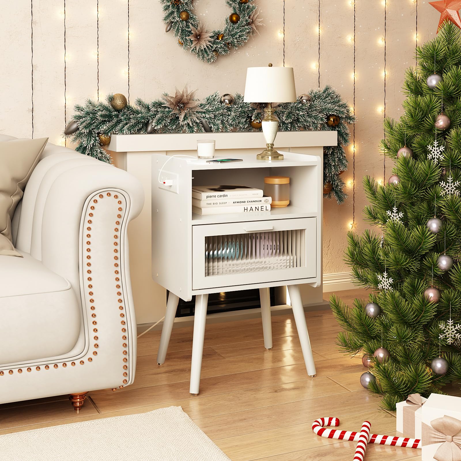 Mid Century Moderner Nachttisch mit Ladestation, Nachttische mit Glasschublade, Beistelltisch mit 2 Etagen Stauraum, für Schlafzimmer, Wohnzimmer, Weiss