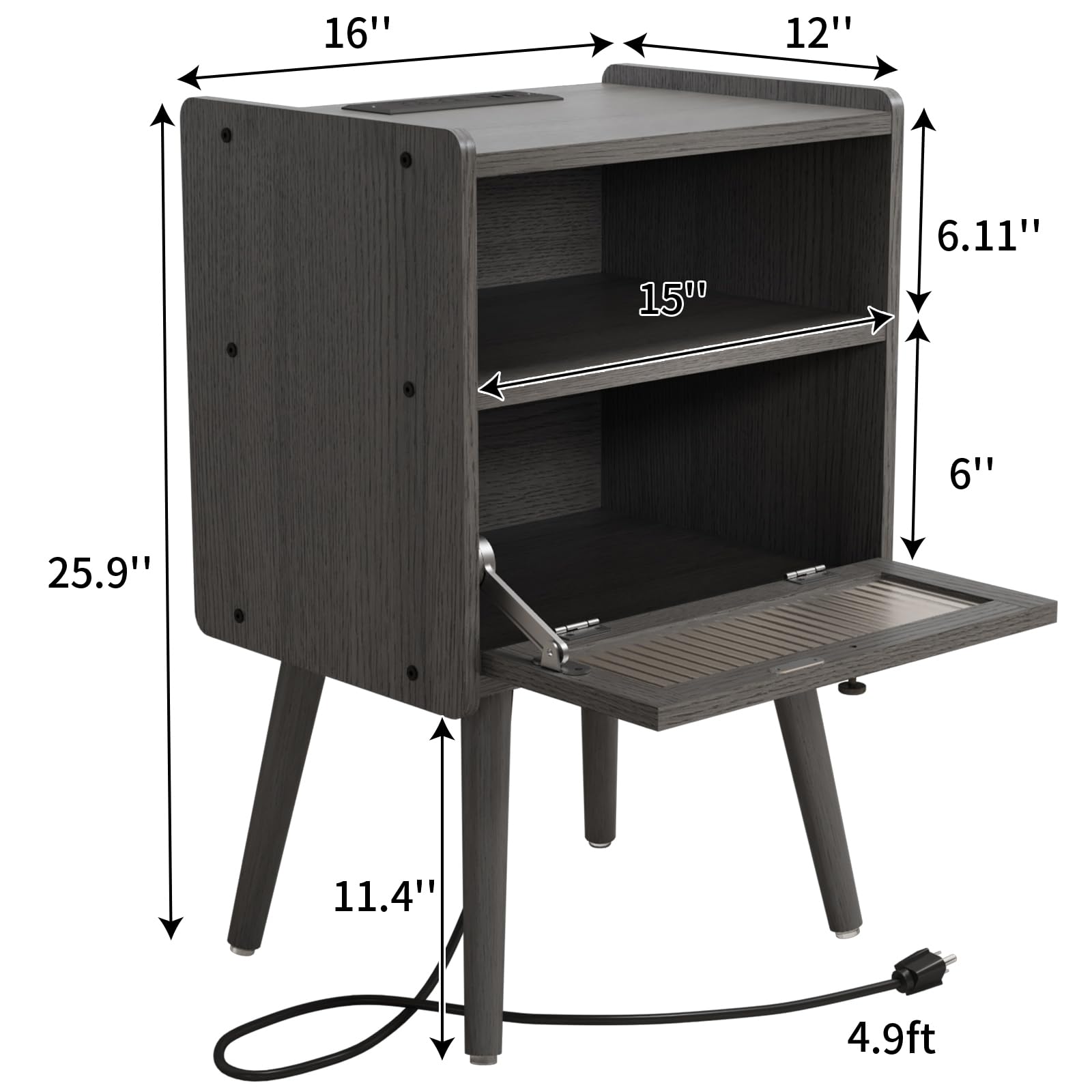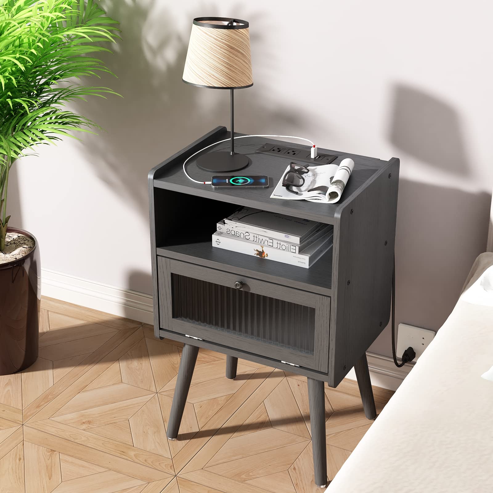 Mid Century Moderner Nachttisch mit Ladestation, Nachttische mit Glastür, Beistelltisch mit 2 Etagen Stauraum, für Schlafzimmer, Wohnzimmer, Dunkelgrau