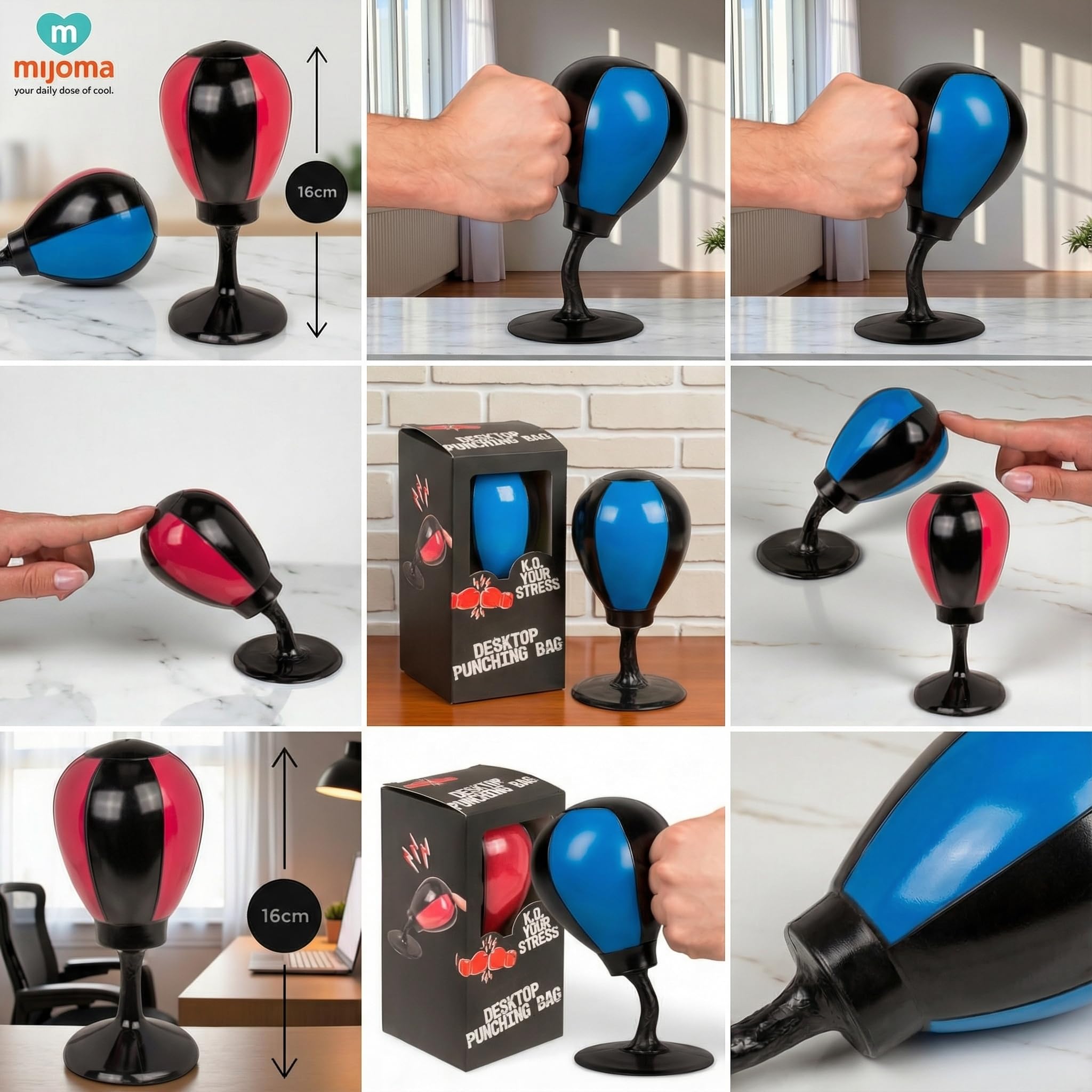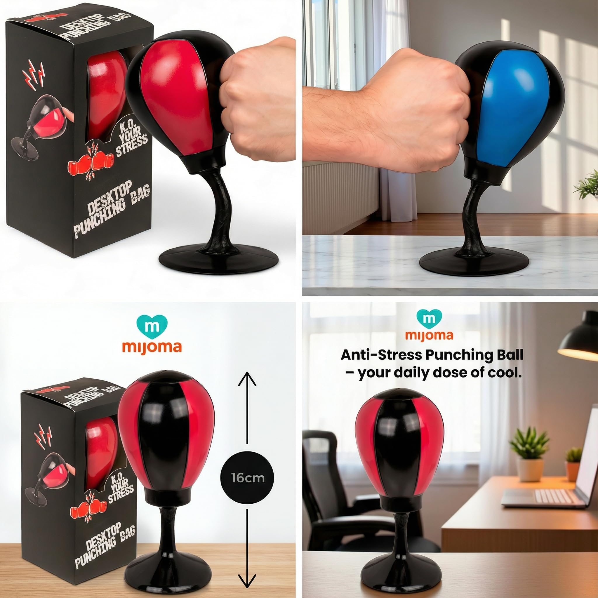 Der MIJOMA Schreibtisch Boxsack ist die stylische Lösung für stressige Momente im Alltag! Ob im Büro, im Homeoffice oder im Jugendzimmer – der 16 cm grosse Punching Ball sorgt für schnelle Entlastung bei Frust, Nervosität und Anspannung. Dank des starken Saugnapfes haftet der Boxball sicher auf glatten Oberflächen und federt nach jedem Schlag zurück – für ein realistisches Boxgefühl im Mini-Format. Die Farbe (rot oder blau) wird per Zufall geliefert und bringt Abwechslung auf jeden Schreibtisch. Ein ideales Geschenk für Kolleg:innen, Schüler:innen oder einfach dich selbst – wenn der Stress mal wieder zuschlägt. Hole dir jetzt ein Stück Humor, Bewegung und Spannung direkt an den Arbeitsplatz. Der MIJOMA Desktop Punching Ball – klein, effektiv, überraschend befreiend. Wenn der Büroalltag zuschlägt, schlag zurück – mit dem MIJOMA Schreibtisch Boxsack. Stress gehört zum Alltag – sei es durch Deadlines, schwierige Meetings oder einfach durch das ständige Piepen neuer E-Mails. Genau für diese Momente wurde der MIJOMA Desktop Punching Ball entwickelt: ein 16 cm grosses Ventil für deinen Ärger. Mit einem festen Schlag auf den kleinen Boxsack baust du Stress ab, bringst dich in Bewegung und sorgst ganz nebenbei für ein Schmunzeln im Büro. Dank seines starken Saugnapfs bleibt der Boxball da, wo du ihn brauchst – auf dem Schreibtisch, dem Küchentisch oder sogar auf deiner Werkbank. Er federt nach jedem Schlag zurück, als würde er sagen: „Na, das war alles?“. Und genau das macht ihn so besonders – er reagiert wie ein echter Sparringspartner, nur ohne blaue Flecken. Die Farben? Überraschung! Du erhältst entweder die rote oder blaue Variante – beide gleichermassen auffällig und energiegeladen. Der Boxsack ist nicht nur praktisch, sondern auch ein originelles Geschenk für Kolleg:innen, Freund:innen oder dich selbst. Ein kleines Gadget mit grosser Wirkung. Ob als Pausenaktivität, als Mini-Workout oder als humorvolle Deko – der MIJOMA Schreibtisch Boxsack erinnert dich daran, dass du die Kontrolle hast. Über deinen Schreibtisch. Über deinen Tag. Und über deinen Stress.