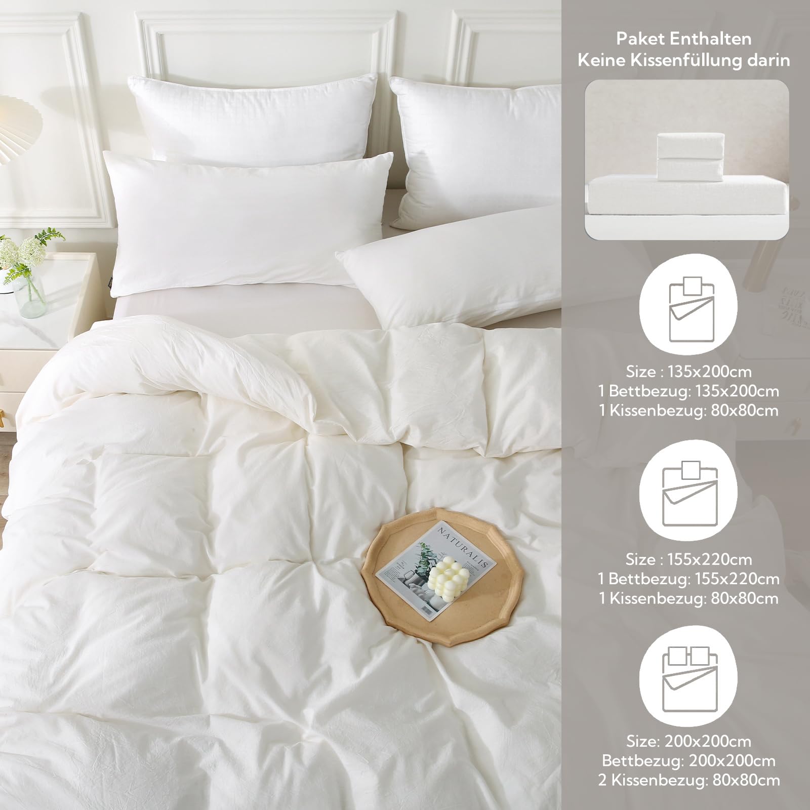 MILDLY Bettwäsche 200x200 Baumwolle 3 Teilig, Bettwäsche-Sets Milky White mit Reissverschluss, Ähnliche Textur wie Stone Washed Leinen, Enthält 1 Bettbezug 200x200 und 2 Kissenbezug 80x80