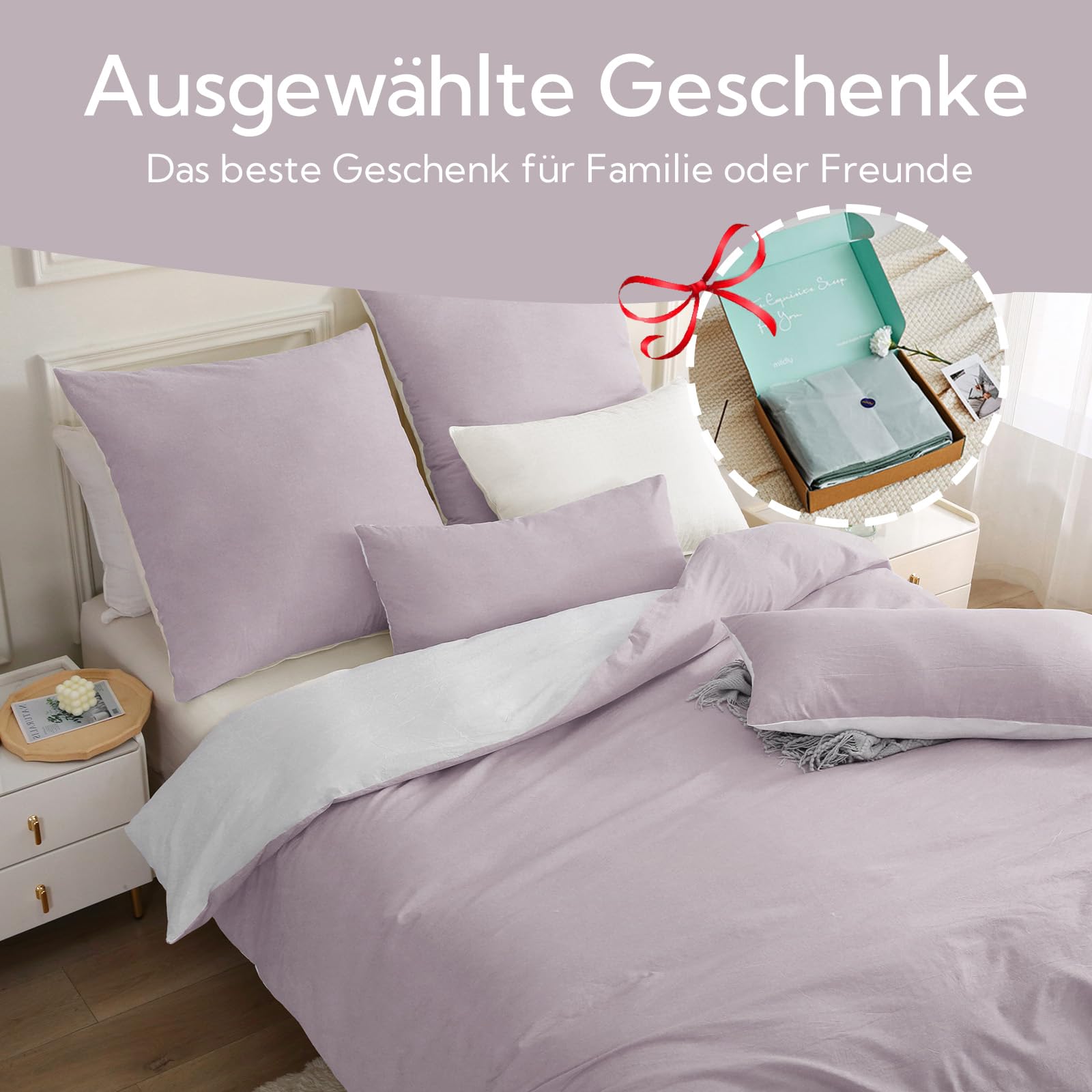 MILDLY Bettwäsche 200x200 Baumwolle, Bettwäsche-Sets Pastelllila 3 Teilig mit Reissverschluss Ähnliche Textur wie Stone Washed Leinen und Enthält 1 Bettbezug und 2 Kissenbezug 80x80