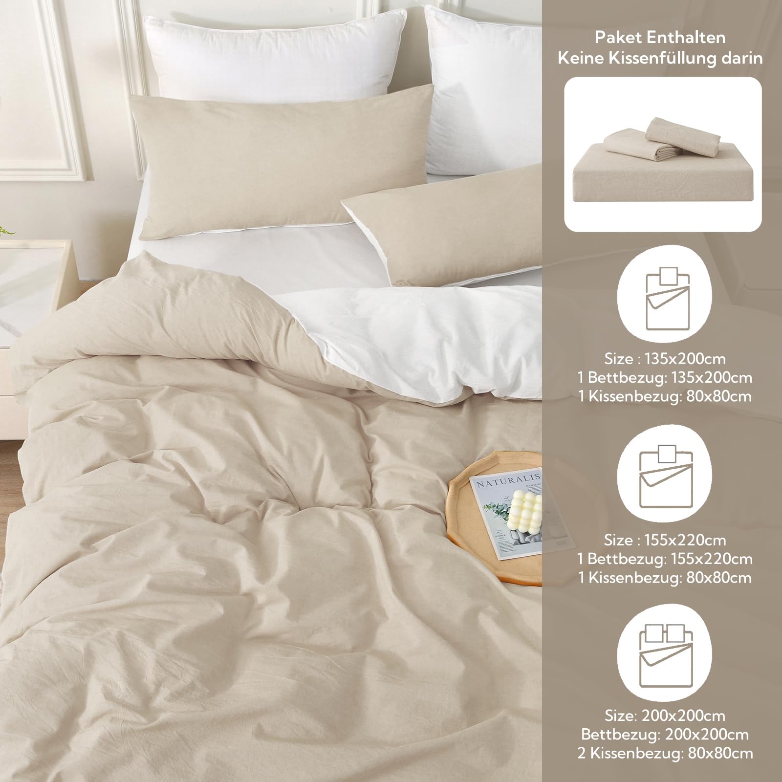 MILDLY Bettwäsche 155x220 Baumwolle, Bettwäsche-Sets Kamel Beige 2 Teilig mit Reissverschluss Ähnliche Textur wie Stone Washed Leinen und Enthält 1 Bettbezug und 1 Kissenbezug 80x80