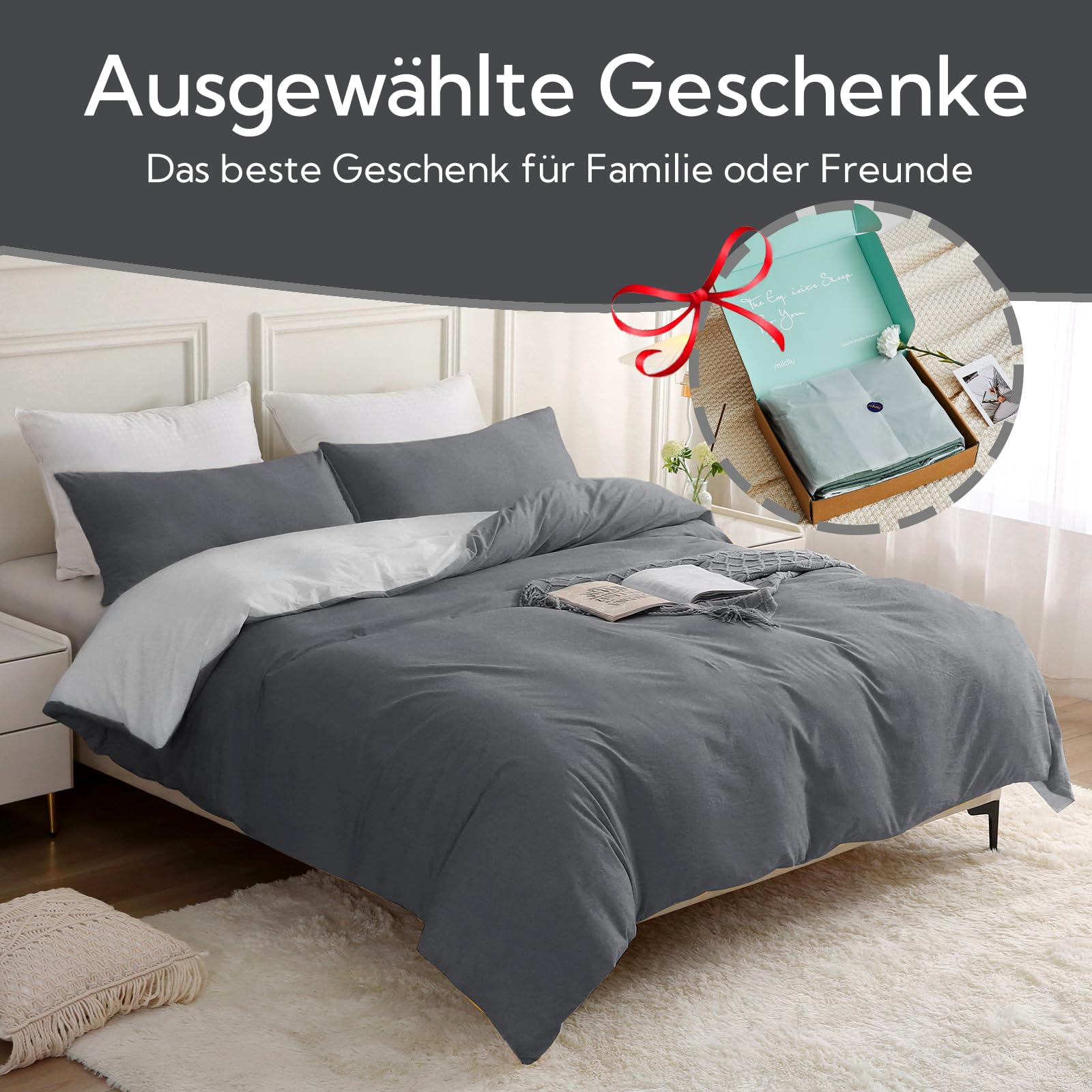 MILDLY Bettwäsche 220x240 Baumwolle, Bettwäsche-Sets Dunkelgrau2 3 Teilig mit Reissverschluss Ähnliche Textur wie Stone Washed Leinen und Enthält 1 Bettbezug und 2 Kissenbezug 80x80