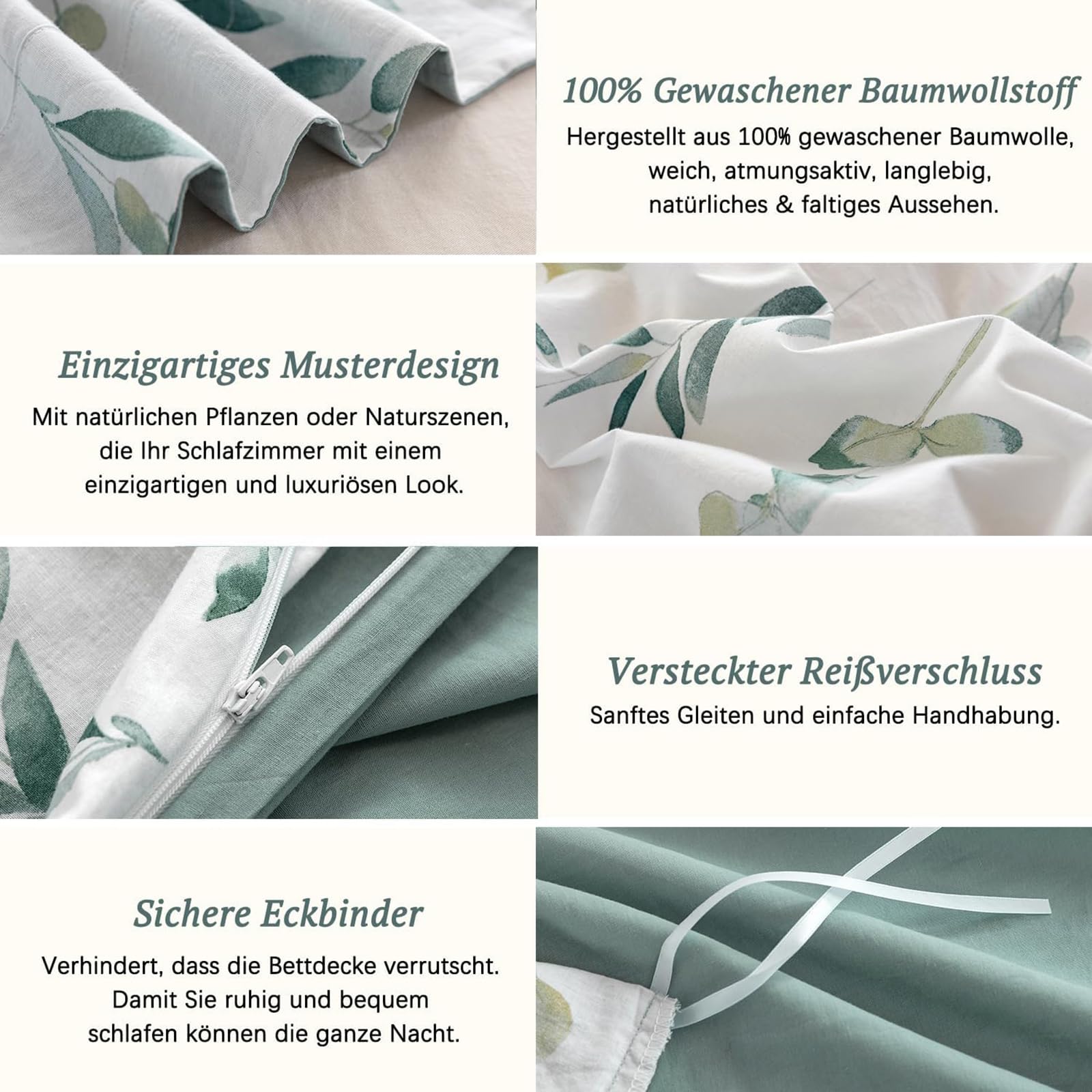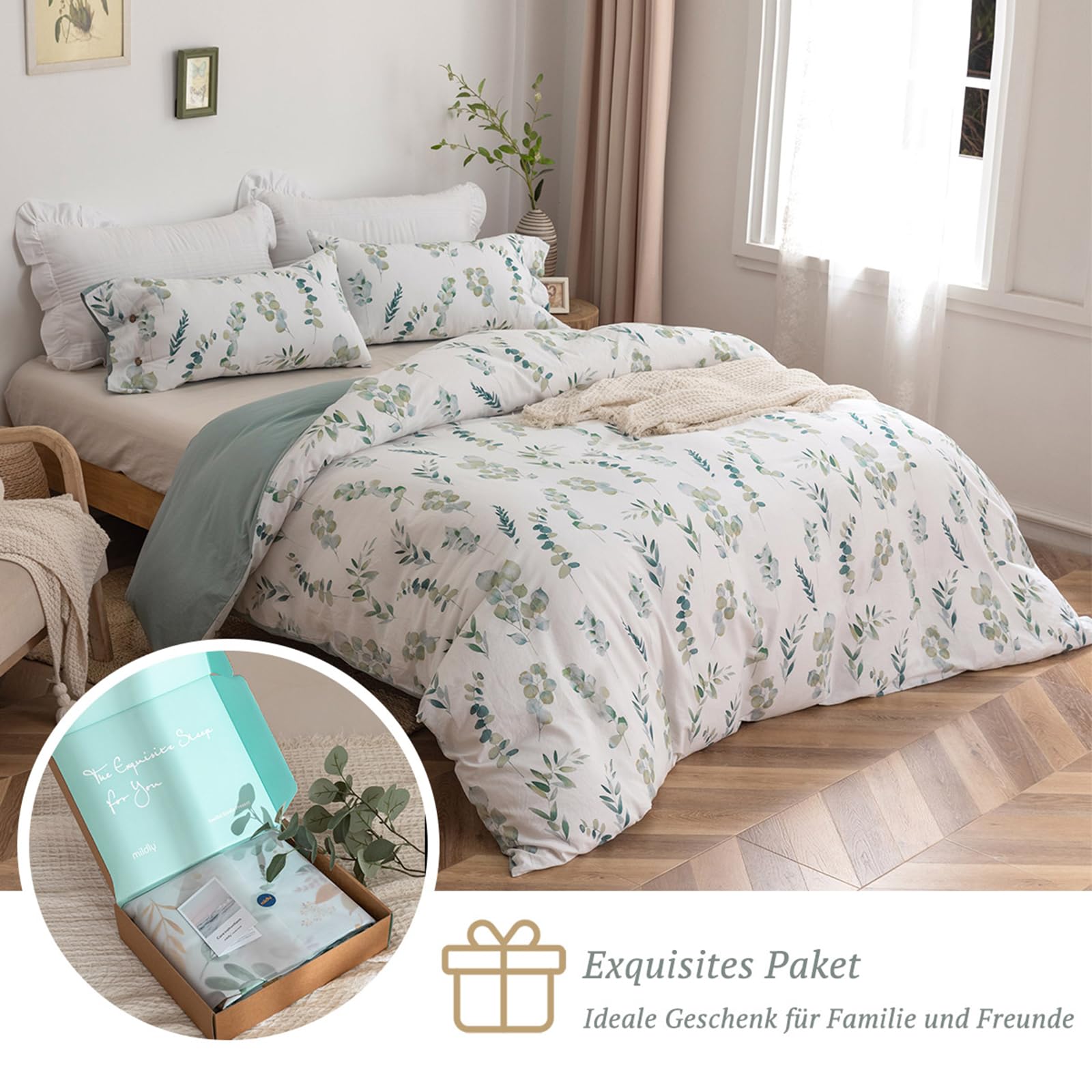 MILDLY Bettwäsche 135x200 Baumwolle, Bettwäsche-Sets mit Pflanzenmuster, Reissverschluss, ÖkoTex Zertifiziert, Enthält 1 Bettbezug 135x200 und 1 Kissenbezug 80x80, Grün(Katharina)