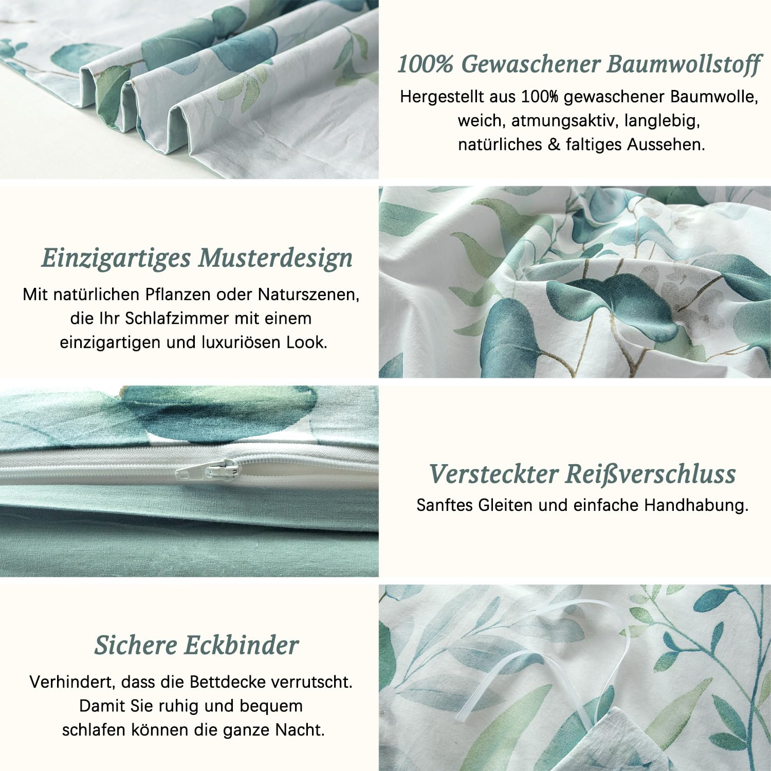 100 % gewaschene Baumwolle MILDLY-Bettwäsche besteht aus 100 % Baumwolle, nachdem der Stoff speziell behandelt wurde, ist weicher, bequemer, atmungsaktiv und nicht schwül, verformt sich beim Waschen nicht und verblasst nicht. Leinen-Touch Dieses Bettwäscheset ist „Stone Washed“, um ihm eine ähnliche Haptik wie Leinenbettwäsche zu verleihen. Der Falten-Look ist eine einzigartige Textur des gewaschenen Baumwollstoffs, die natürlicher und strukturierter ist. Verdeckter Reissverschluss und 4 Eckbänder. Der Reissverschluss ermöglicht ein einfaches Anbringen und Entfernen der Bettwäsche. Knopfabdeckungen aus Holz sind haltbarer und weicher. Vier Eckbänder sichern Ihre Bettdecke unter der Tagesdecke. Pflegeleicht und langlebig. Maschinenwäsche im Schonwaschgang oder Handwäsche separat in kaltem Wasser. Bitte nicht bleichen oder chemisch reinigen. Bei niedriger Temperatur (unter 60°) trocknen. MILDLY Bettwäsche ÖkoTex zertifiziert und für Allergiker geeignet. Die Bettwäsche wird in einer schönen Verpackung geliefert und eignet sich auch hervorragend als Geschenk für Hochzeiten, Geburtstage und Feste.