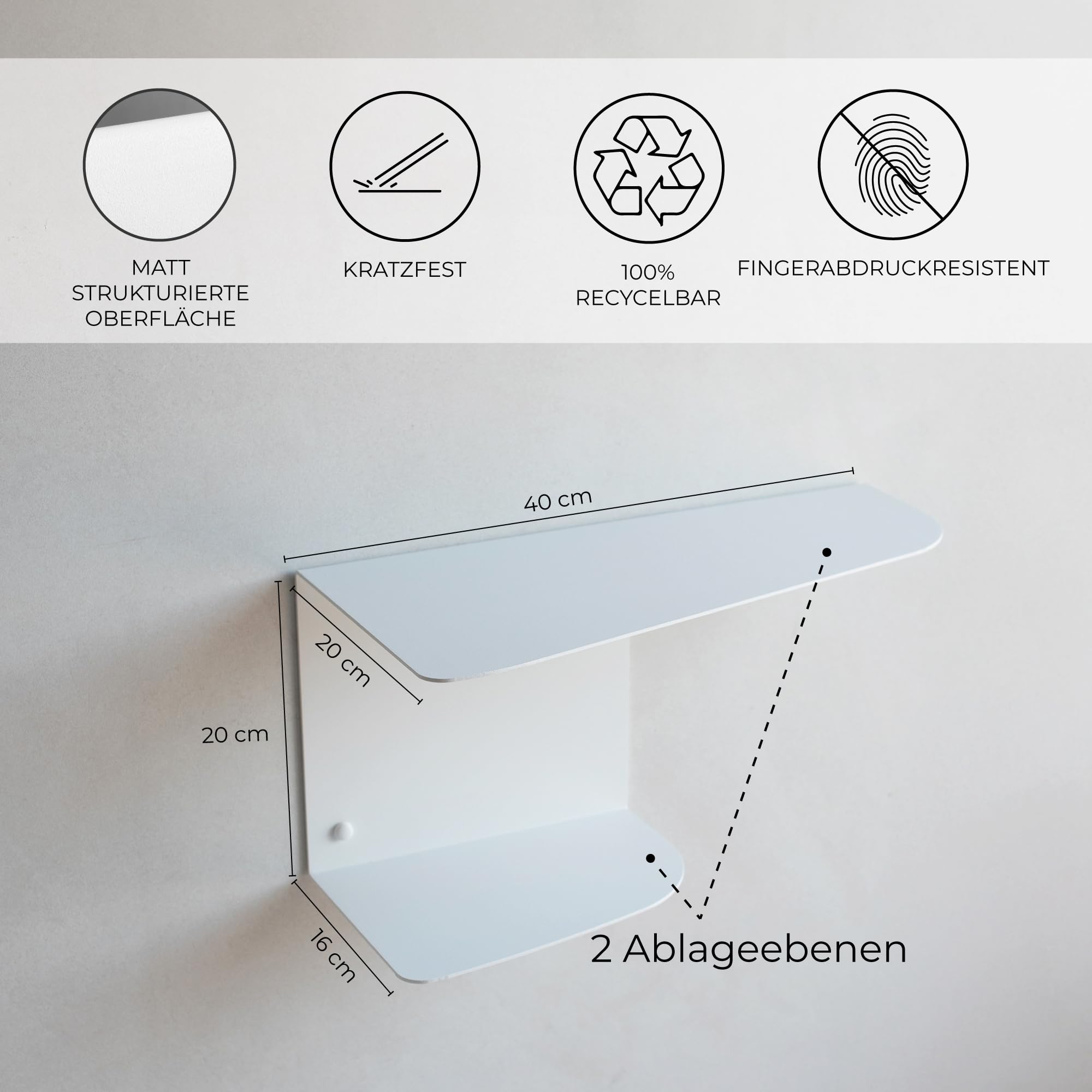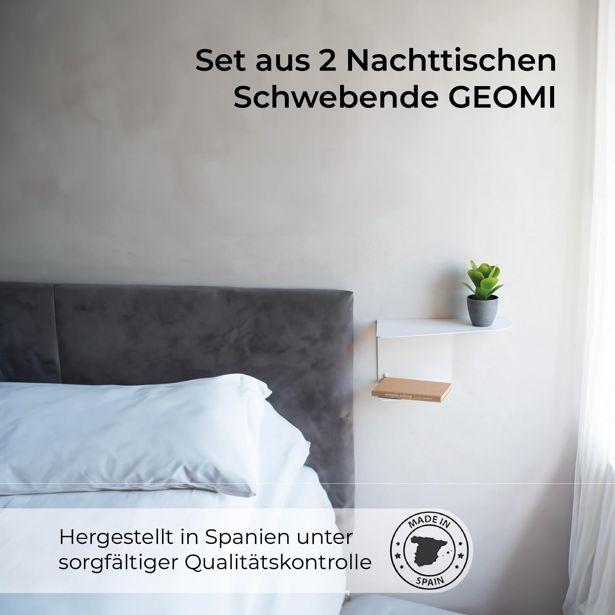 Die MILUKA Nachttische sind die perfekte Lösung, wenn Sie einen modernen und praktischen Begleiter für Ihr Schlafzimmer suchen. Dieses Nachtschrank 2er-Set wird aus 2 mm starkem, pulverbeschichtetem Stahl gefertigt und überzeugt mit einer matten, strukturierten Oberfläche, die kratzfest, pflegeleicht und unempfindlich gegen Fingerabdrücke ist. Mit den Massen von 40 x 20 x 20 cm ist jeder Nachttisch klein, kompakt und ideal für Räume, in denen jeder Zentimeter zählt. Als schmaler Nachttisch passt er perfekt in kleine Schlafzimmer, Gästezimmer oder Apartments und schafft zusätzlichen Stauraum, ohne wertvolle Bodenfläche zu beanspruchen. Die hängende Konstruktion macht ihn vielseitig einsetzbar: Ob als Nachttisch Kinderzimmer, als schwebende Nachtkonsole im Schlafzimmer oder als praktisches Wandregal im Flur – die Einsatzmöglichkeiten sind nahezu unbegrenzt. Auch im Wohnzimmer als Beistelltisch oder im Badezimmer als Ablage eignet er sich hervorragend. Das durchdachte Design aus einem Stück ermöglicht eine einfache Wandmontage mit nur wenigen Schrauben. Das notwendige Zubehör ist im Lieferumfang enthalten, sodass die Installation schnell und unkompliziert gelingt. Gefertigt in Spanien unter strenger Qualitätskontrolle, stehen die MILUKA Nachttische für Langlebigkeit und zeitloses Design. Jedes Nachtschrank 2er-Set wird sorgfältig verpackt – zu 100 % nachhaltig und plastikfrei – damit Ihr Produkt sicher und umweltfreundlich bei Ihnen ankommt.