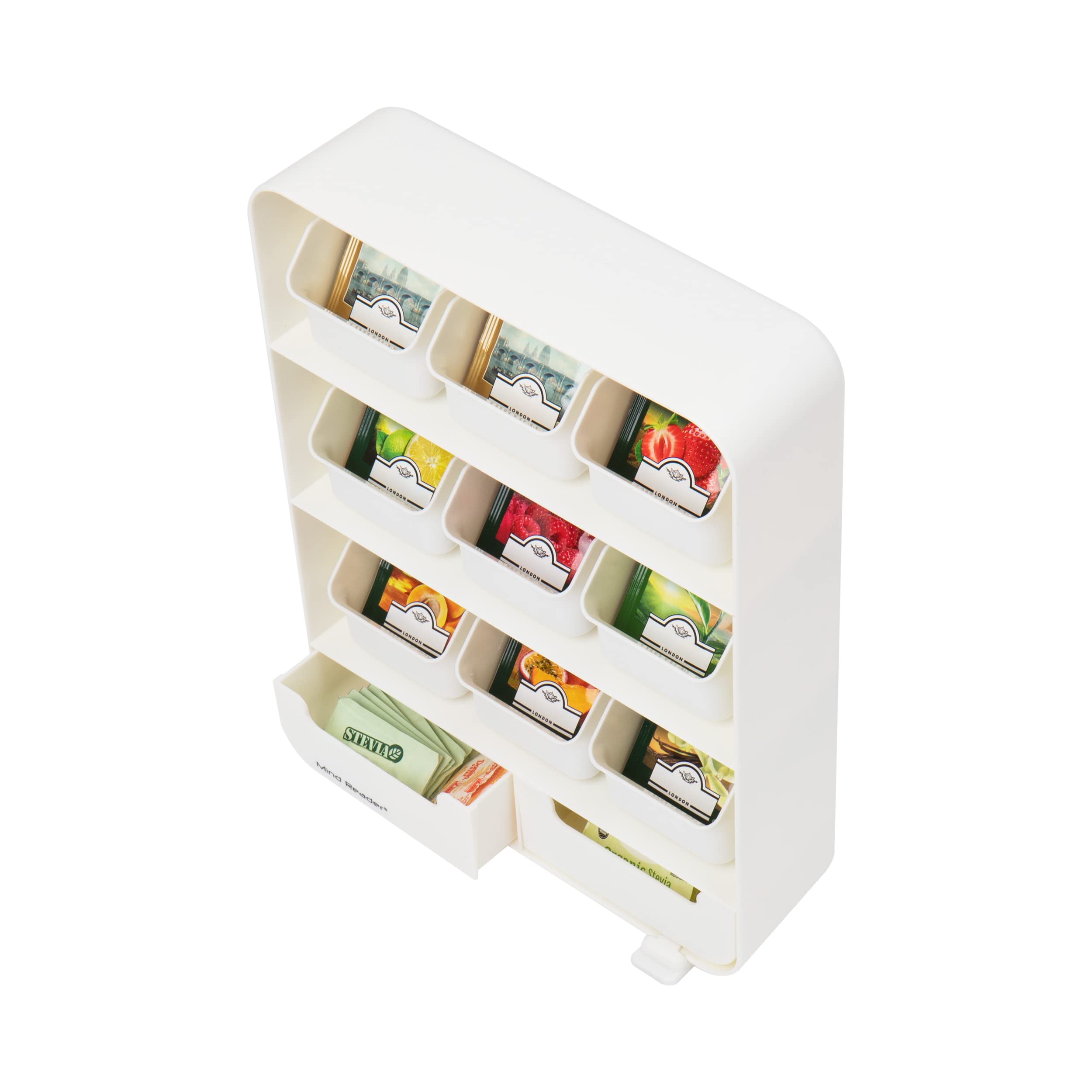 Ausgestattet mit 9 herausnehmbaren Schubladen zur Aufbewahrung von Teebeuteln aller Art und Grösse. Geeignet für alle Teemarken wie Bigelow, Tazo, Starbucks, uvm. Die Teeschubladen sind für Ihre Bequemlichkeit vollständig herausgeschoben.