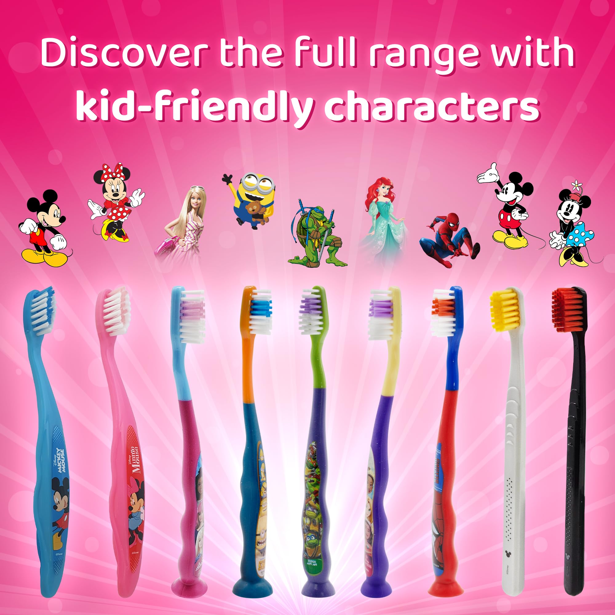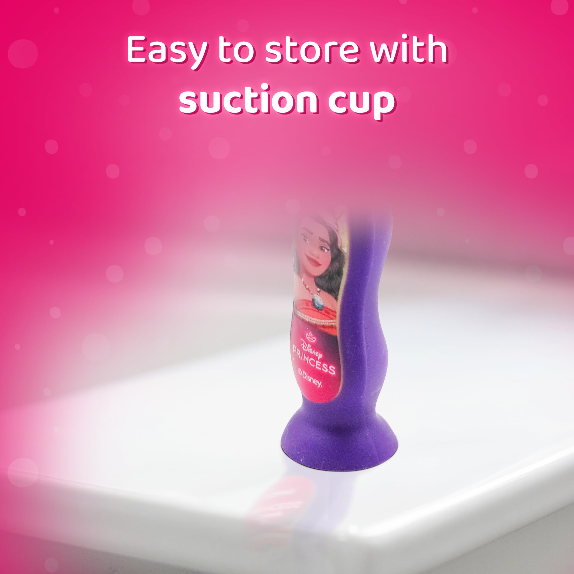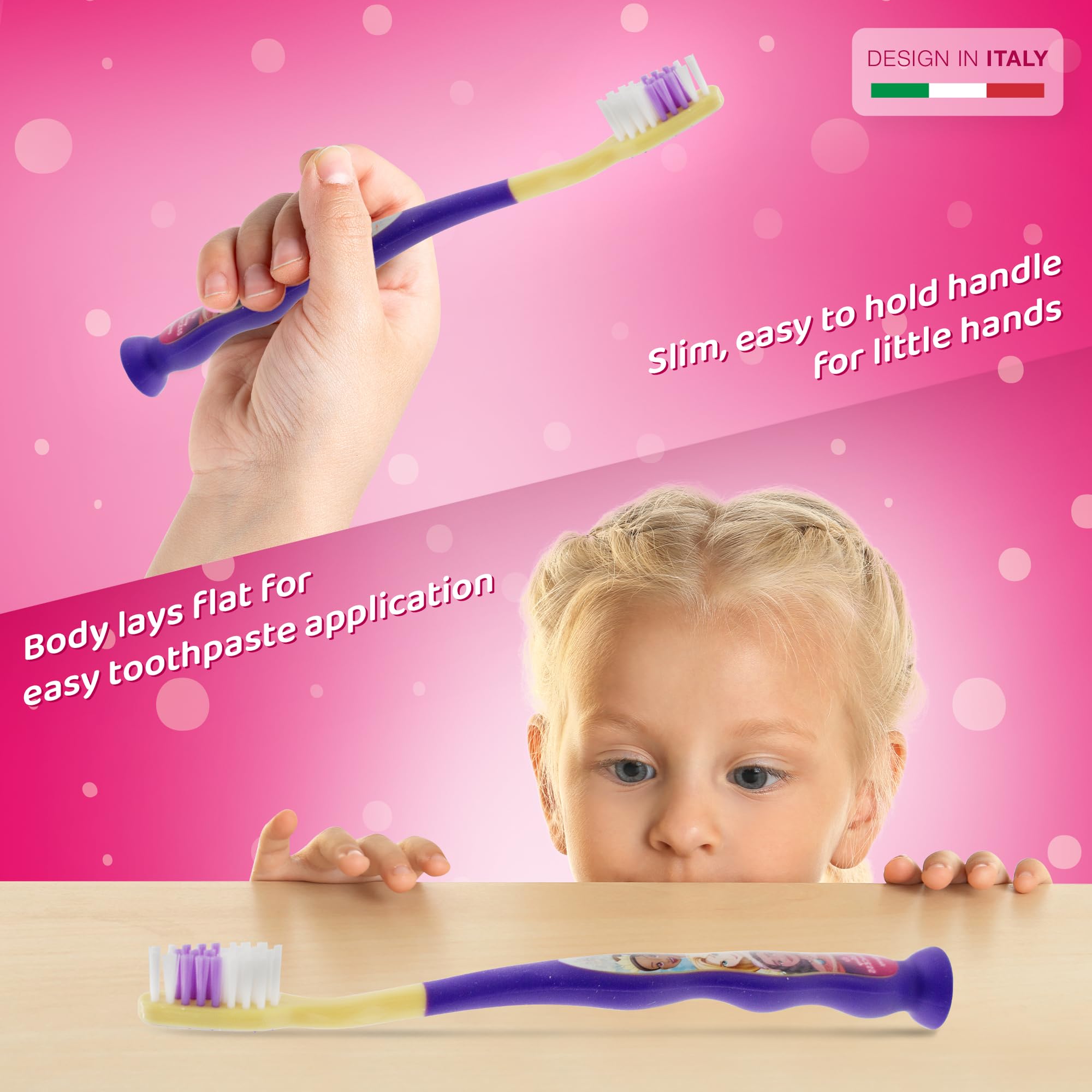 Mr. White Princess Kids Zahnbürste mit Schutzkappe, Saugnapf, bequemem Griff und weichen Borsten für Kinder - Pink