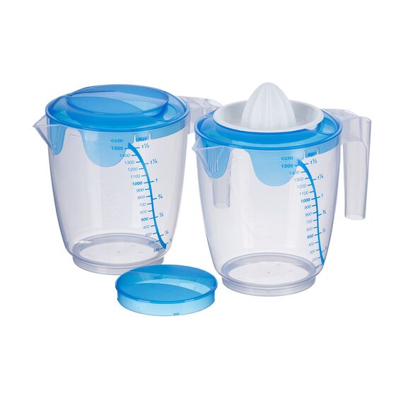Mit diesen transparenten Messbechern mit blauen Deckeln wird Kochen und Backen viel einfacher. Sie erhalten 2 grosse Messbecher mit einem Fassungsvermögen von 1500 ml oder ccm. Alle Messbecher sind in Milliliter und Kubikzentimeter. Beide Becher haben einen Deckel mit einem kleinen Deckel, der sich zum Rühren öffnen lässt. Der Boden hat einen rutschfesten Ring. Zusätzlich erhalten Sie einen Zitruspressenaufsatz, der auf beide Messbecher passt. Die Deckel können gedreht werden, um ein einfaches Ausgiessen zu ermöglichen. Alle Tassen haben einen praktischen Griff und einen Ausgiesser. Die Messbecher sind stapelbar. Qualität aus Australien. Aussenmasse: 21 x 14,2 x 16,5 cm. Innenmasse oben 13,3 x 13,3 cm (L x B). Innenmasse unten: 9 x 9 cm (L x B). Nutzbare Innenhöhe 14 cm Farbe: blau Temperaturbeständig von -40 bis +100 Grad Celsius. Spülmaschinenfest im oberen Geschirrkorb. Mikrowellengeeignet ohne Deckel. Nicht für den Ofen geeignet. Nicht einfrieren. Material: PP Polypropylen (BPA-frei), hergestellt in der EU
