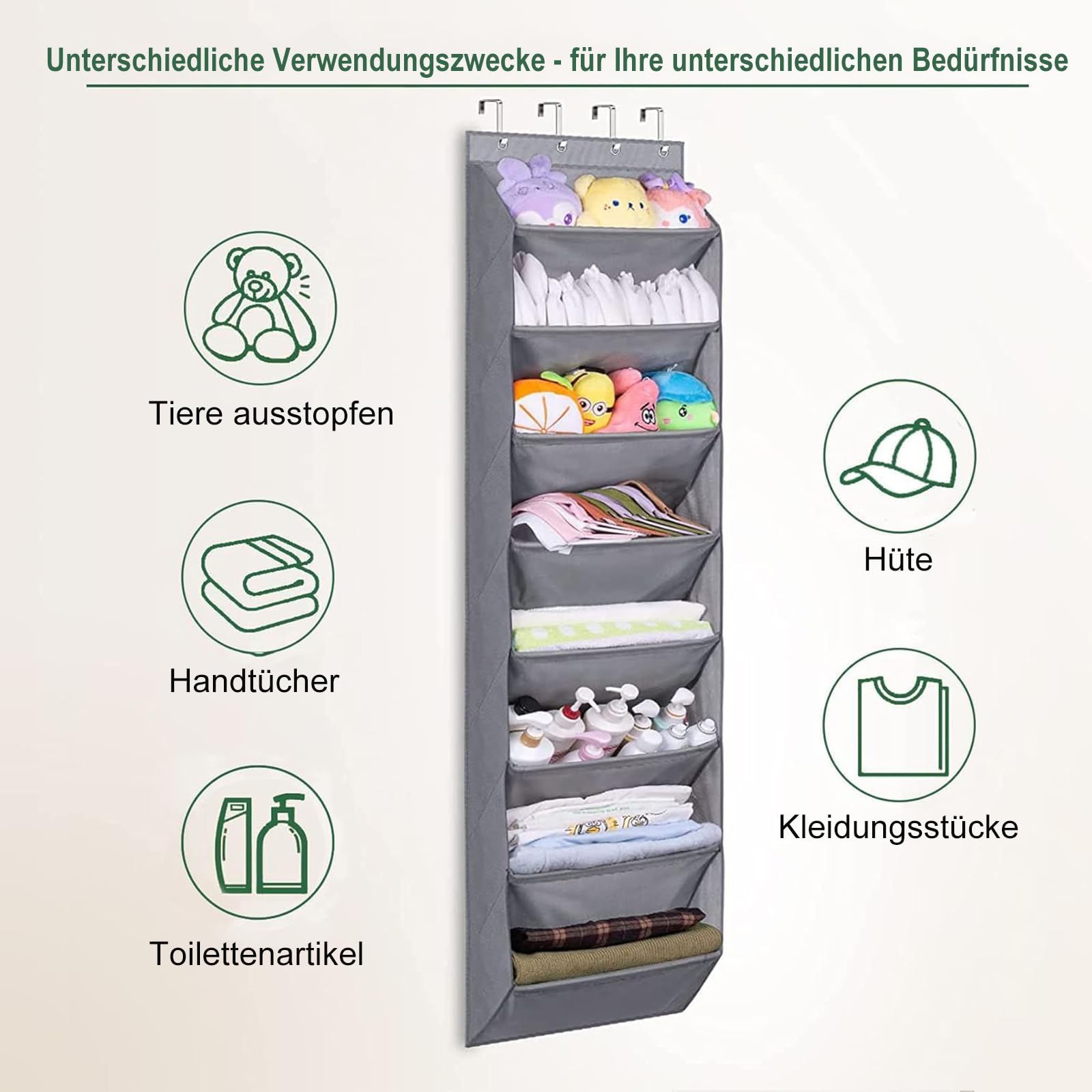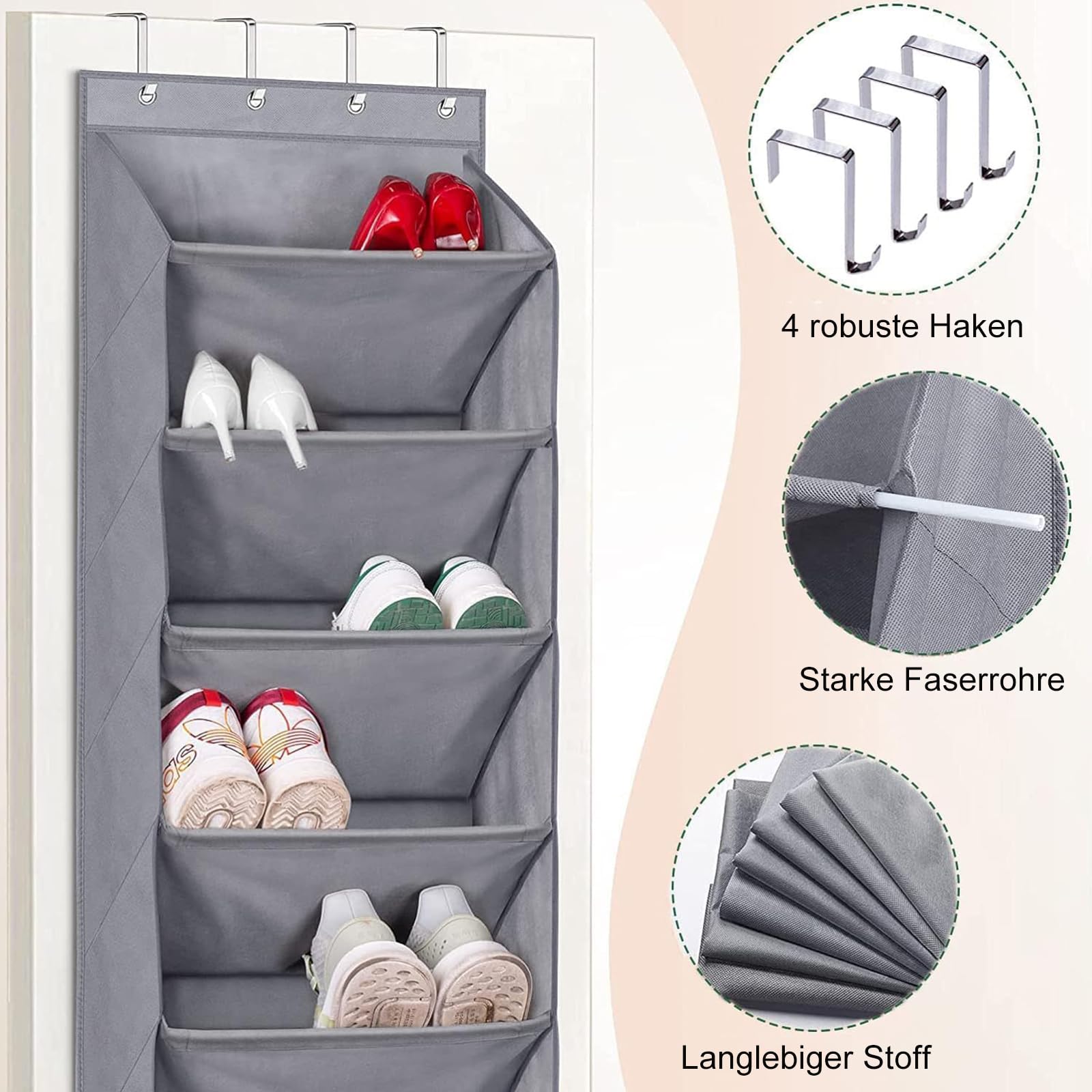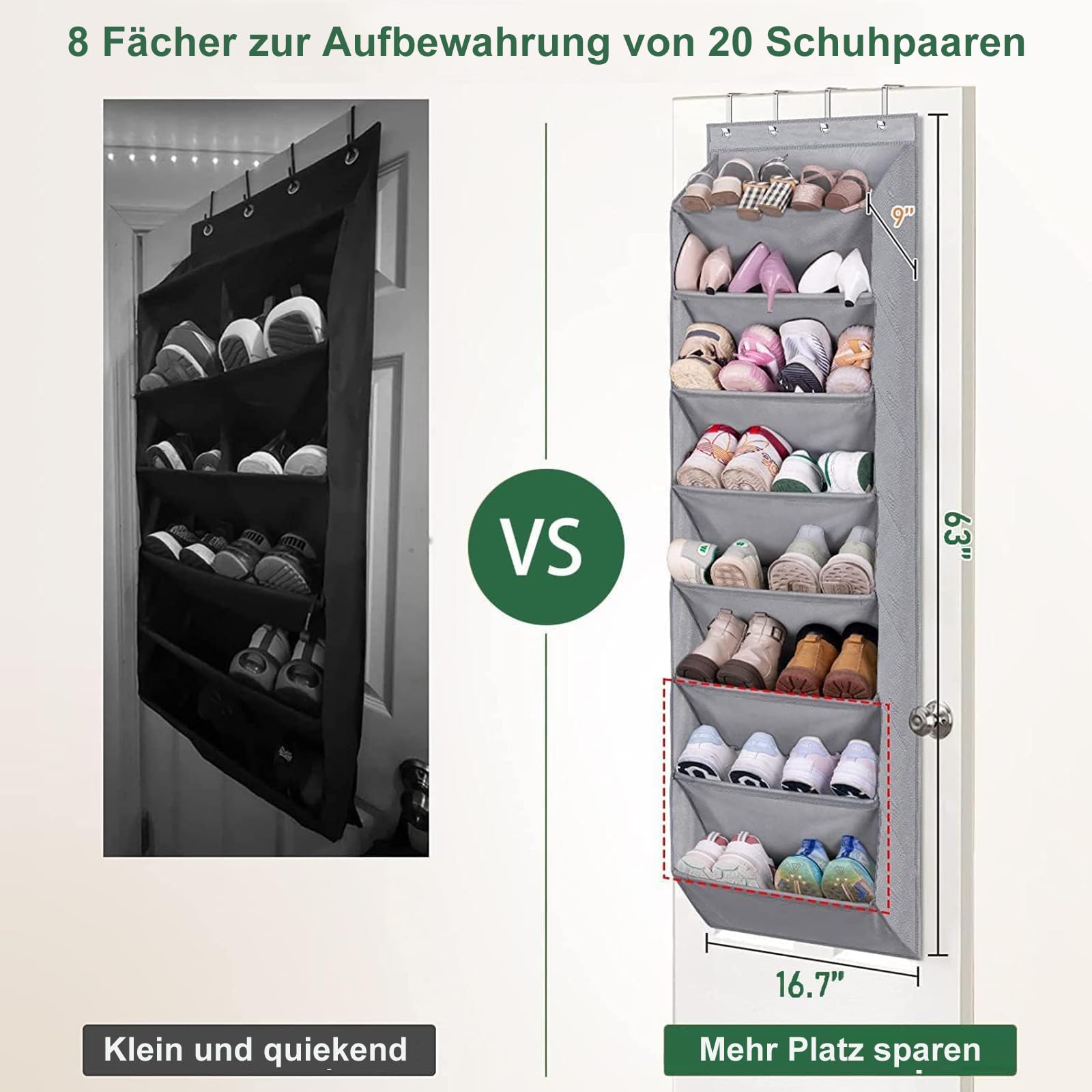 Wie löst man das Problem, Schuhe ohne Falte, Falte, Beschädigung und zu wenig Platz zu lagern? Jetzt kann MISSLO schuhregal zum hängen tür-organizer mit grosser Kapazität sie besser schützen und Ihr Zimmer aufräumen! 8 Regal Vorteile: 8-Regal mit breiter Tasche für mehr Platz Jedes Fach ist tief, so dass die Schuhe nicht auffallen, auch lange Stiefel. Darüber hinaus ist der Schuhaufhänger gross genug, um Herrenschuhe in der Grösse 13 zu verstauen. Und diese platzsparend schuhregal tür hängend kann bis zu 20-Paar Erwachsenenschuhe insgesamt speichern; Starke Faserrohre erhöhen die Stabilität Der Faserrohreinsatz könnte starke Unterstützung bieten und hält die Schuhform herausfallen. Offenes Design lässt Sie alles sehen und einfach herausnehmen, was die Zeit beim Finden der Schuhe reduziert; MISSLO schuh organisierer über der Tür 4 Stark über den Türhaken, einfach zu hängen Kommen Sie mit vier massiven Metallhaken, um über Ihre Tür zu hängen, die 45-lbs hält, ohne zu hängen. Der schuhorganizer tür passt zu den meisten Hausstandardtüren zwischen 1,37" bis 1,65" Dicke. Robustes Material für lange Nutzung Der Stoff des schuhorganizer hängend ist gut gemacht und sehr langlebig, der nicht leicht zu reissen und langlebig ist; Vielseitiger Organizer, Anzug für viele Palces, Mehrfachverwendungen Diese schuhe organizer passt für die meisten Tür des Schrankes, Speisekammer, Schlafzimmer, Baby- oder Kinderzimmer, Badezimmer, Waschküche, College Schlafsaal, Kreuzfahrt, Duschraum, Küche, Wohnzimmer, Kinderzimmer, Garage etc. Verwenden Sie schuhregal hängend, der Ihre Badezimmertür aufhängt, um Handtücher, Haarprodukte und Haarglätter, Toilettenpapier zu halten. Hängen Sie im Schlafzimmer Schuhe, Socken zu speichern. Im Kinderzimmer Spielzeug und Windeln zu organisieren. Auch in Speisekammer, um alle Arten von Flaschenwein, Gewürze, Trockenkost, verpackte Snacks usw. zu speichern.