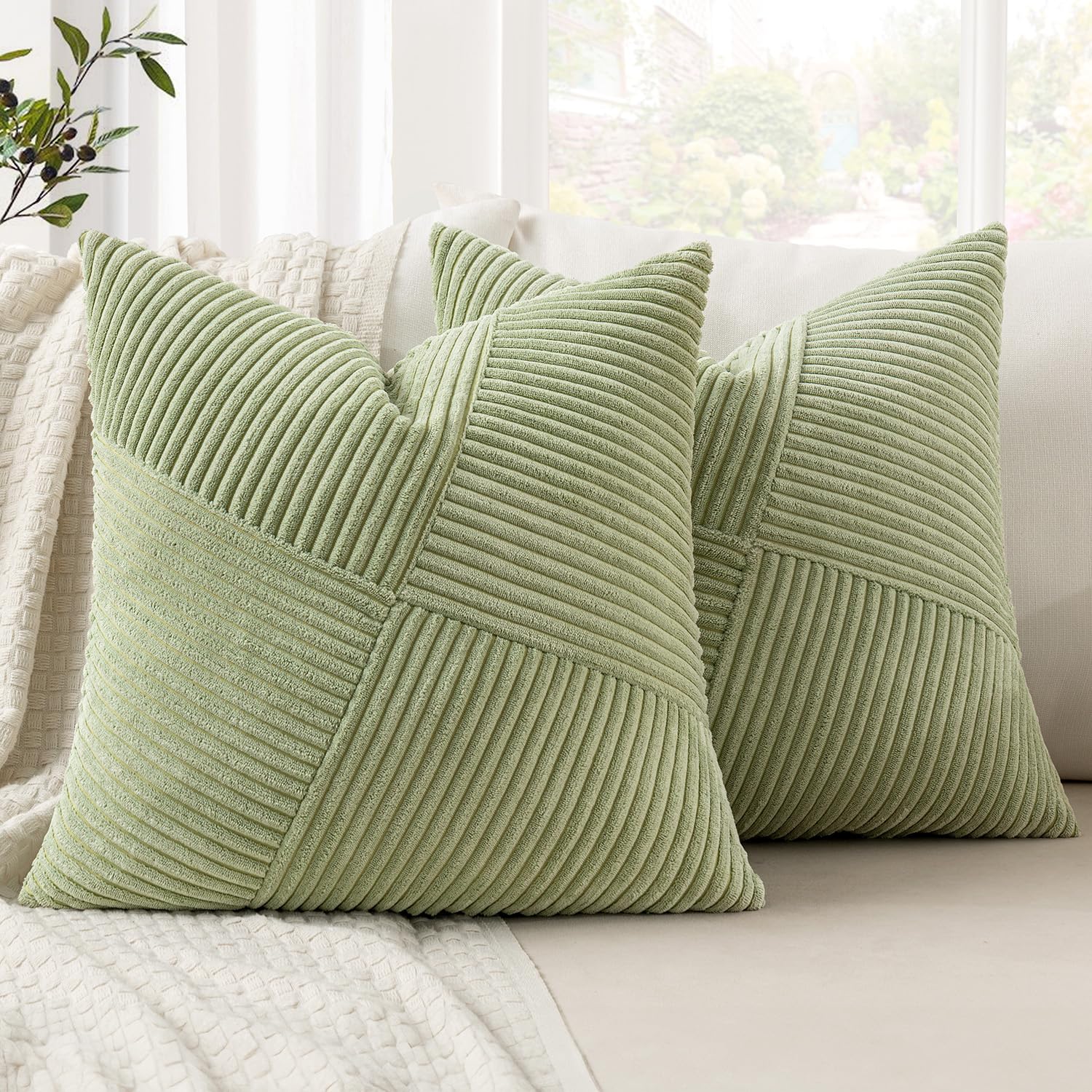 MIULEE Kissenbezug 45x45 Bohnengrün frühling Sofakissen Kordsamt 2er Set Kissenbezüge Zierkissenbezug Kissenhülle Dekokissen Streifen Muster Patchwork Design für Wohnzimmer