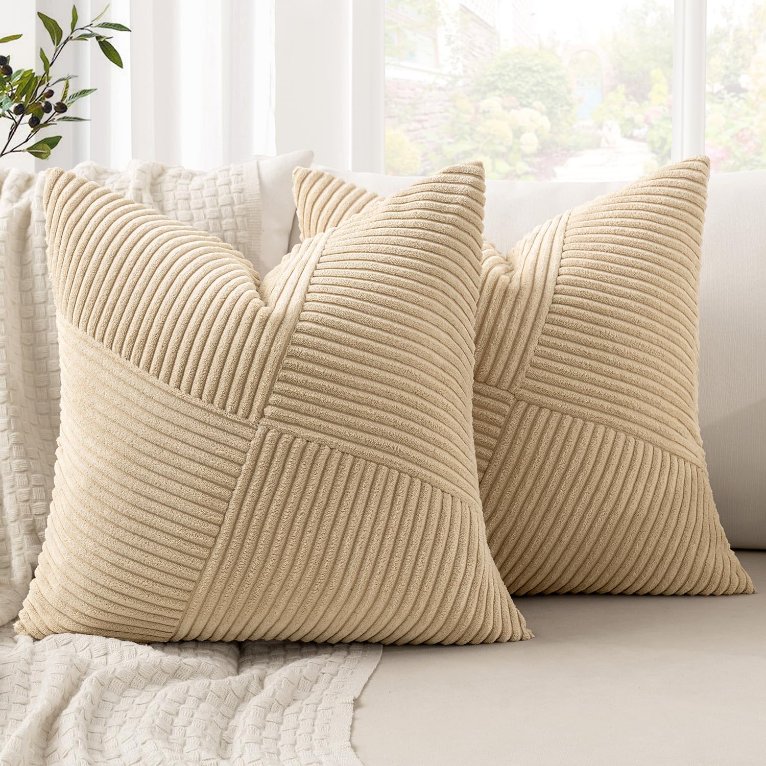 MIULEE Kissenbezug 50x50 Beige Kordsamt 2er Set Kissenbezüge Zierkissenbezug Kissenhülle Sofakissen Dekokissen Streifen Muster Patchwork Design für Wohnzimmer