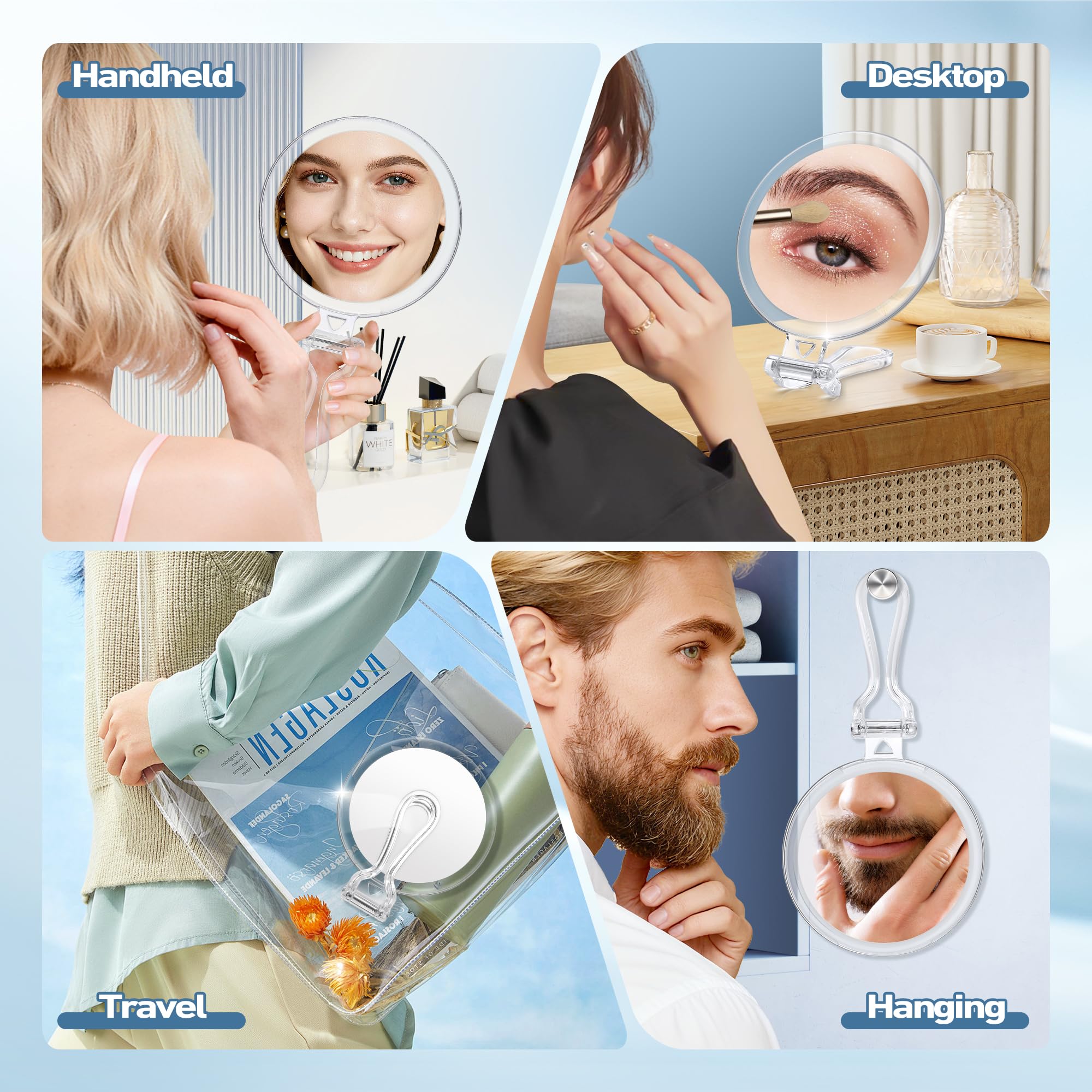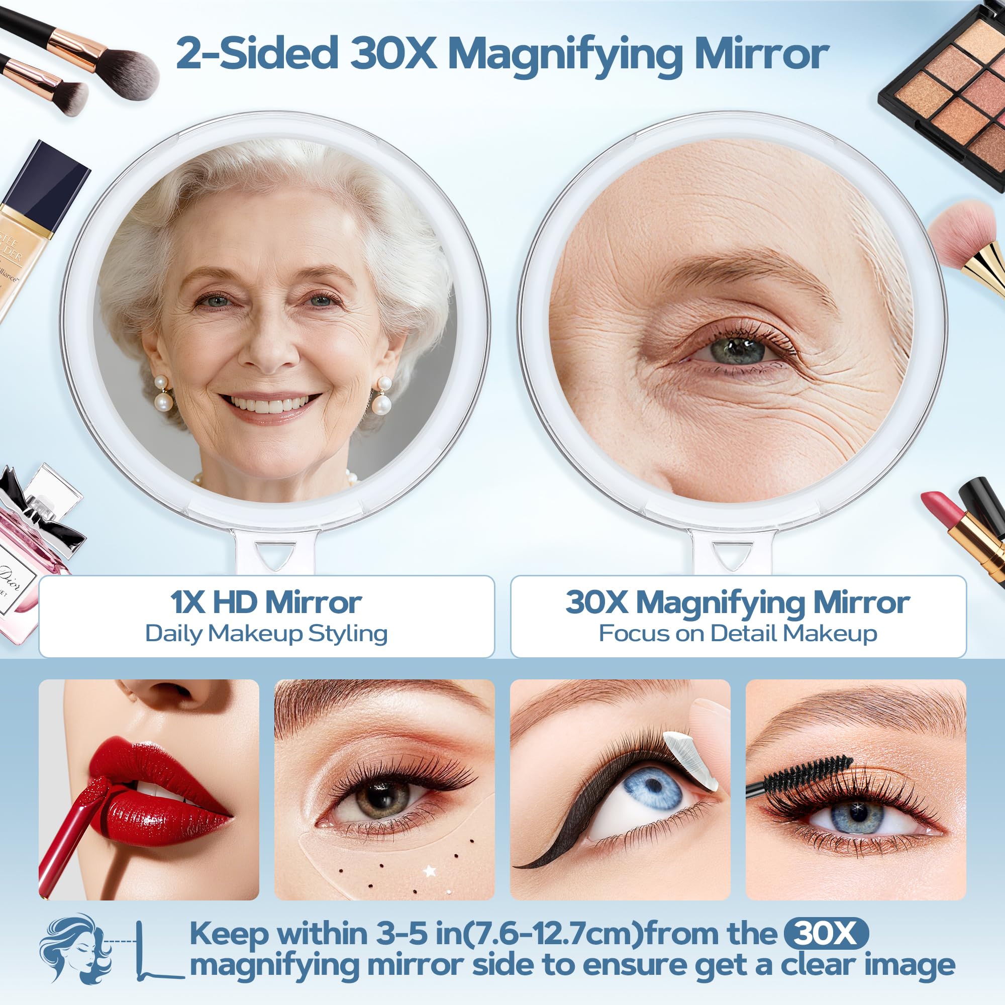 30x/1x Doppelseitiger Handspiegel: Zeigt selbst kleinste Fältchen, Mitesser oder Make-up-Unregelmässigkeiten – ideal für präzise Make-up-Anwendungen.