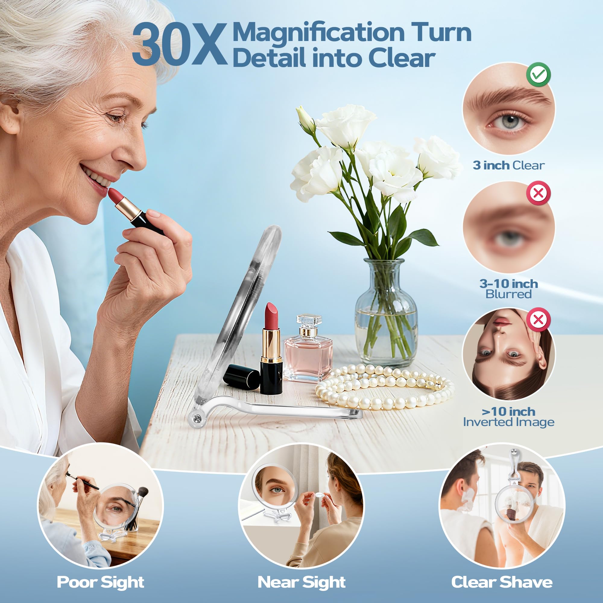 Richtige Anwendung: Halten Sie den 30x-Spiegel etwa 5 cm von den Augen entfernt; bei Verzerrungen langsam Abstand anpassen, bis das Bild klar ist.