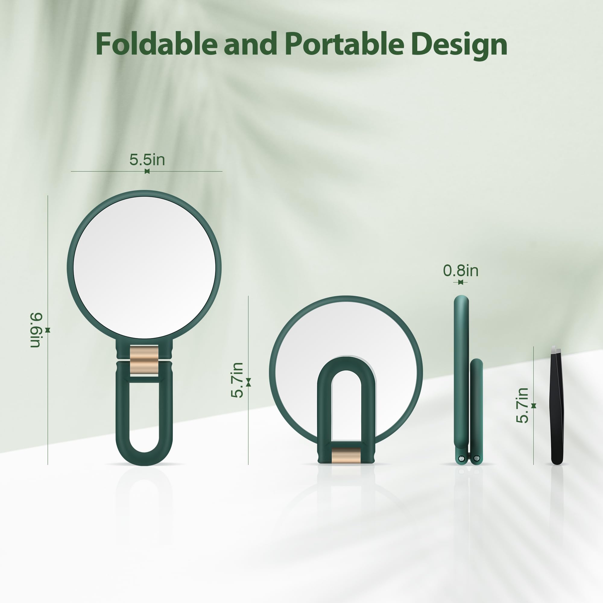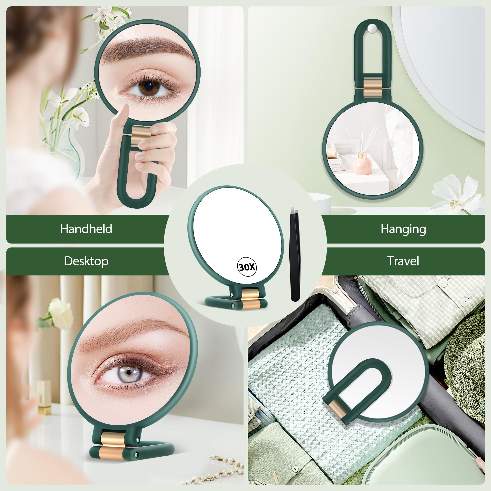 MIYADIVA Handlicher Vergrößerungsspiegel, doppelseitiger Vergrößerungsspiegel mit 30-facher/1-facher Vergrößerung, Verstellbarer Griff und Pinzette, tragbarer Mehrzweck-Makeup-Spiegel smaragdgrün