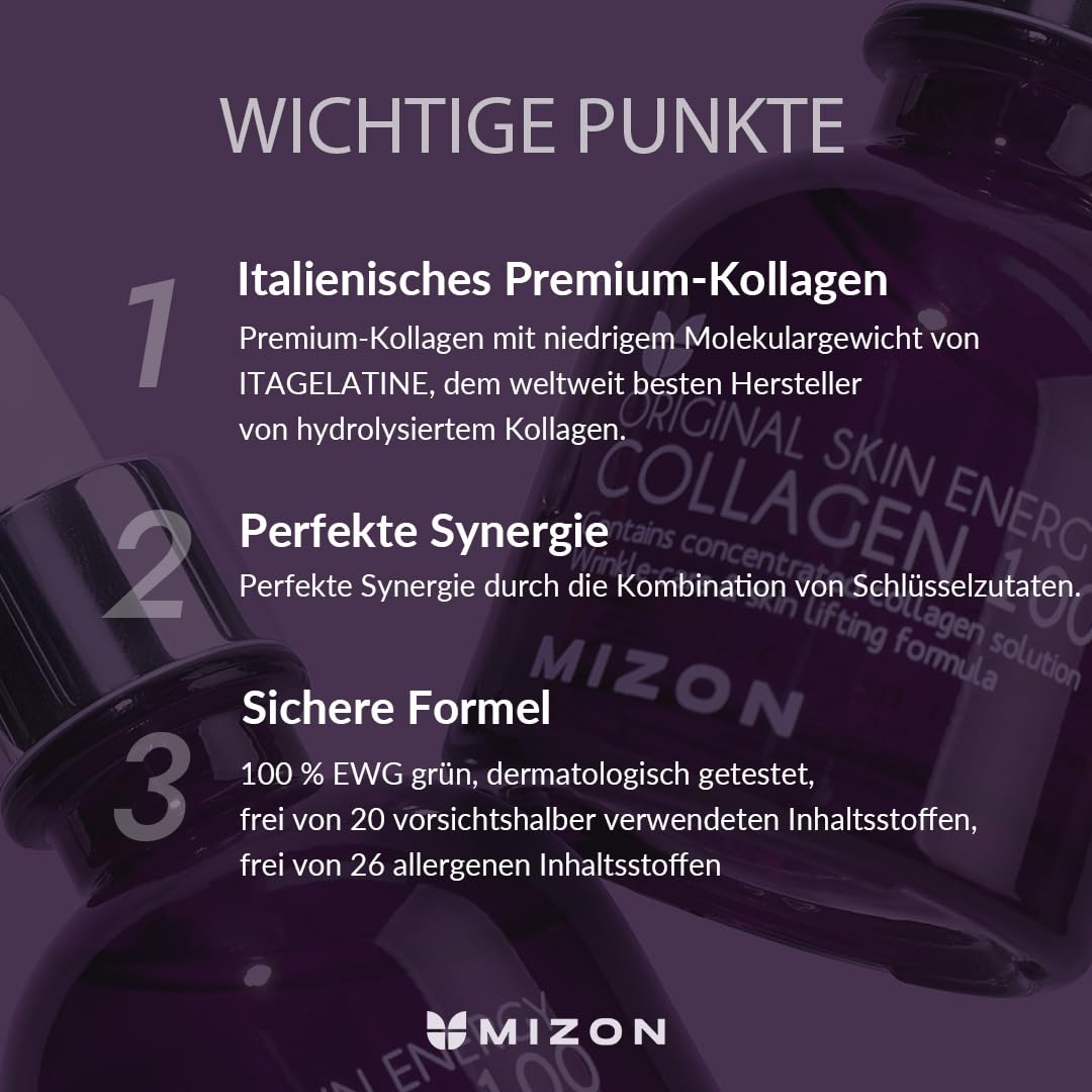 Das Mizon Collagen 100 Serum ist ein hochkonzentriertes koreanisches Kollagenserum, das speziell entwickelt wurde, um die Haut zu straffen, zu glaetten und intensiv mit Feuchtigkeit zu versorgen. Die minimalistische, wirkungsvolle Formulierung eignet sich besonders gut fuer empfindliche und anspruchsvolle Haut, die erste oder bereits sichtbare Zeichen der Hautalterung zeigt.