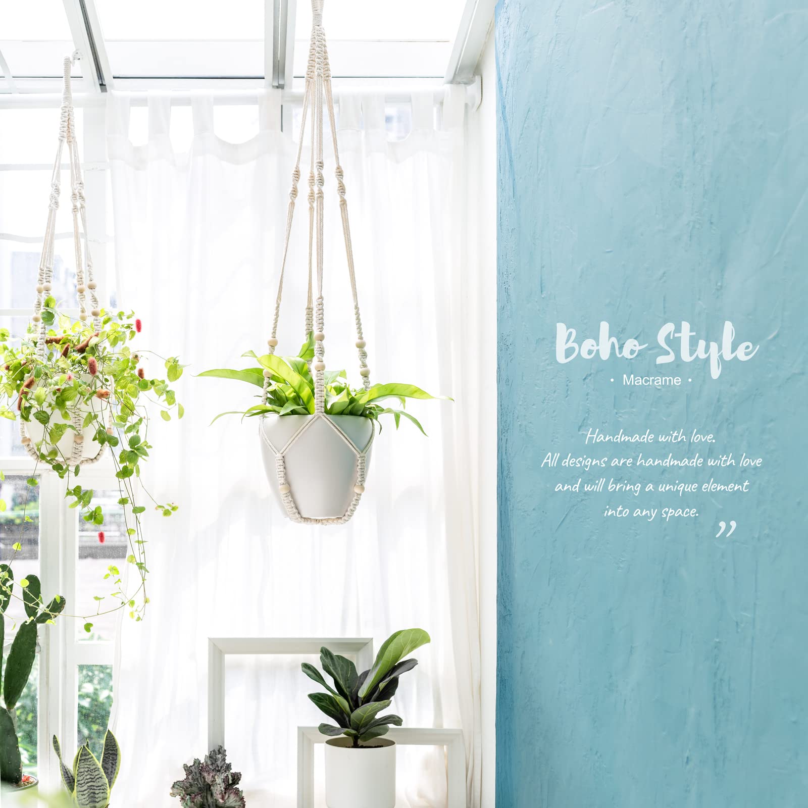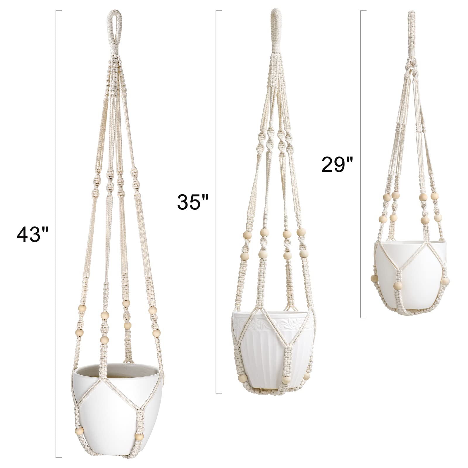 Mkouo 3er Set Makramee Blumenampel Pflanzenhänger Innen Pflanzkorb Hängender Blumentopfhalter Baumwollseil mit Perlen ohne Quasten, 73cm/89cm/109cm, Weiss
