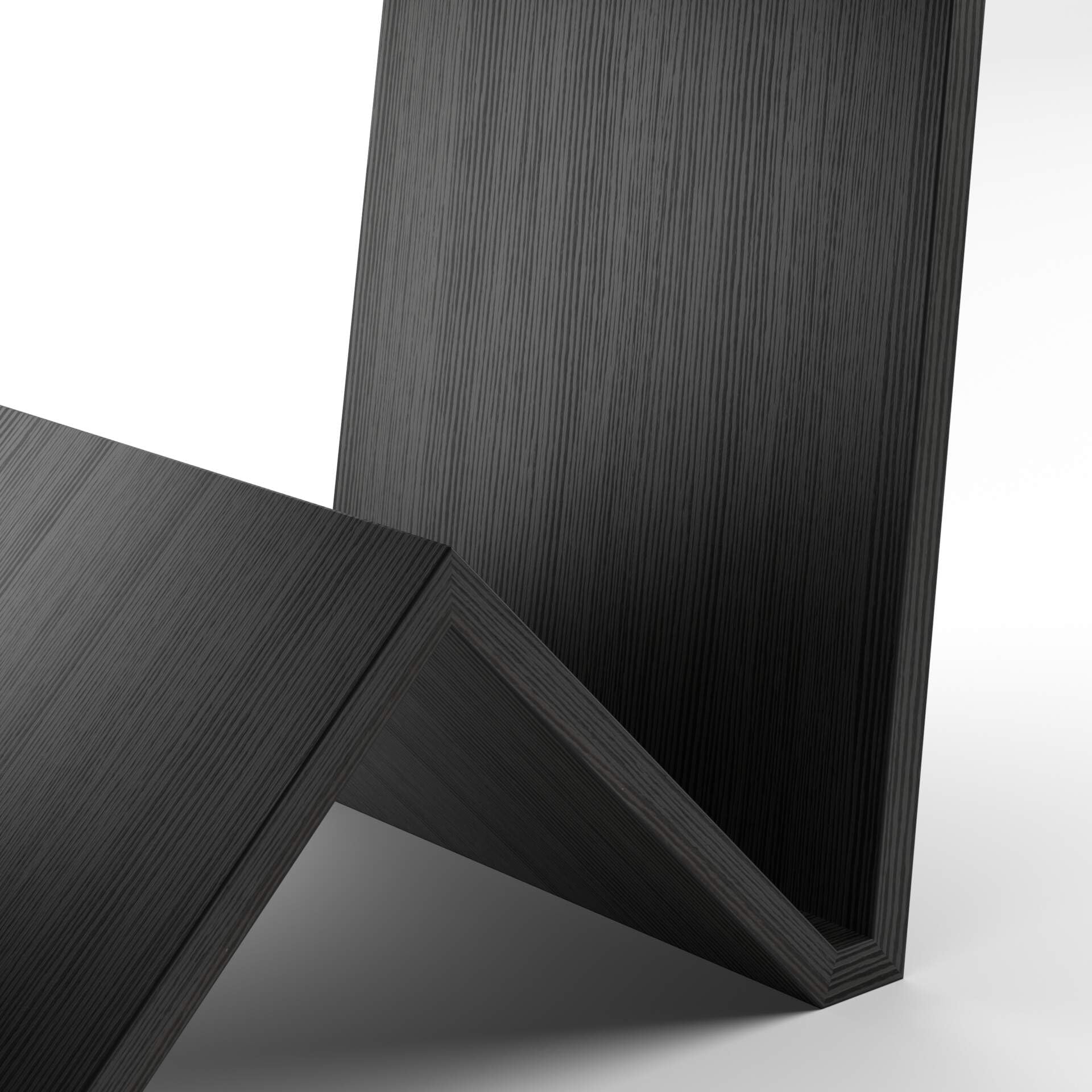 Couchtisch mit Bodenplatte "gefaltet" Der Couchtisch ist aus Melamin in Holzoptik, schwarze Esche gefertigt. Die Oberfläche ist leicht rau, die Holzmaserung ist geprägt. Der Boden ist 40 cm breit.