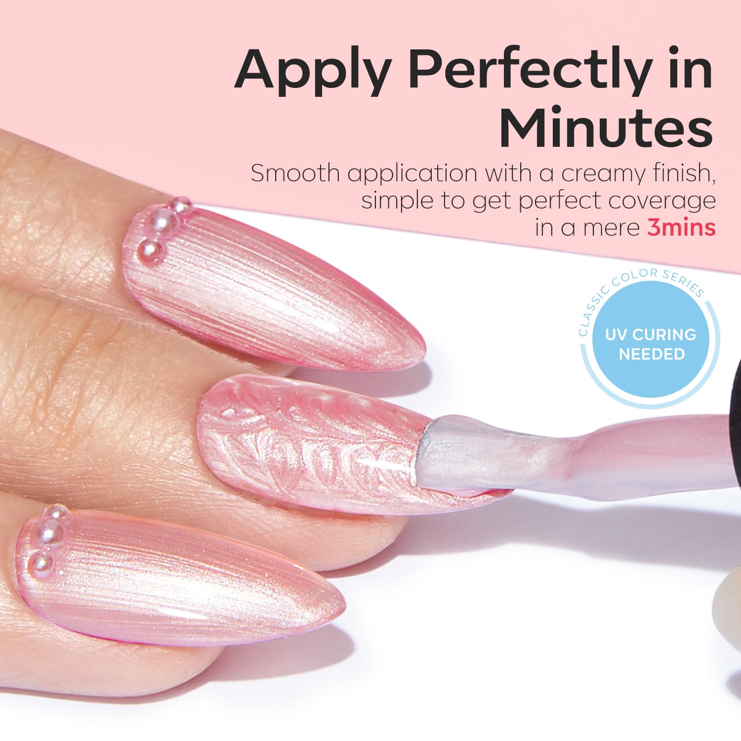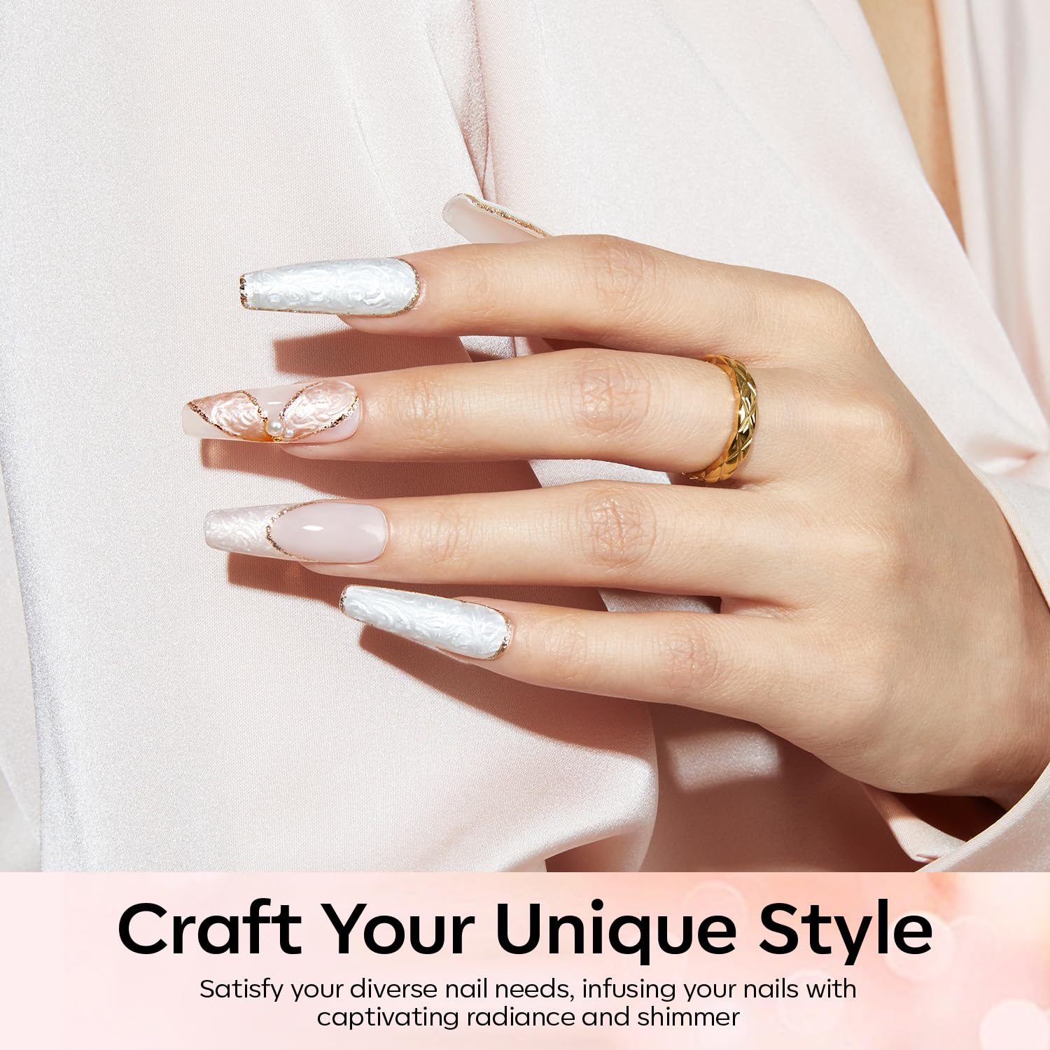 Die Farbauswahl kombiniert sanfte Nude-Nuancen mit fein glitzernden Rosatoenen und ermoeglicht vielseitige Nageldesigns von dezent bis leicht schimmernd. Die Gel-Lacke sind fuer die Haertung unter UV- oder LED-Lampen vorgesehen und lassen sich gleichmaessig auftragen.