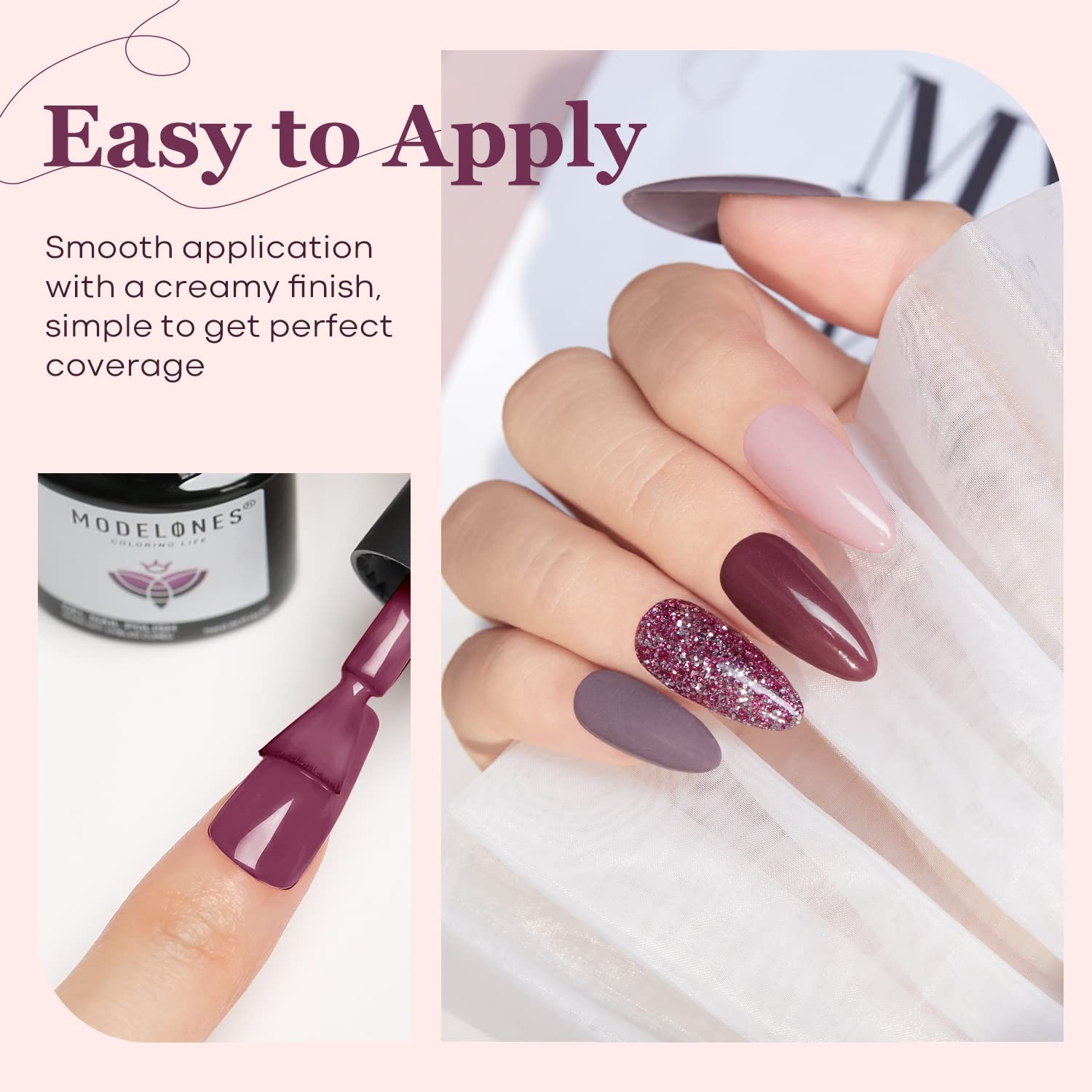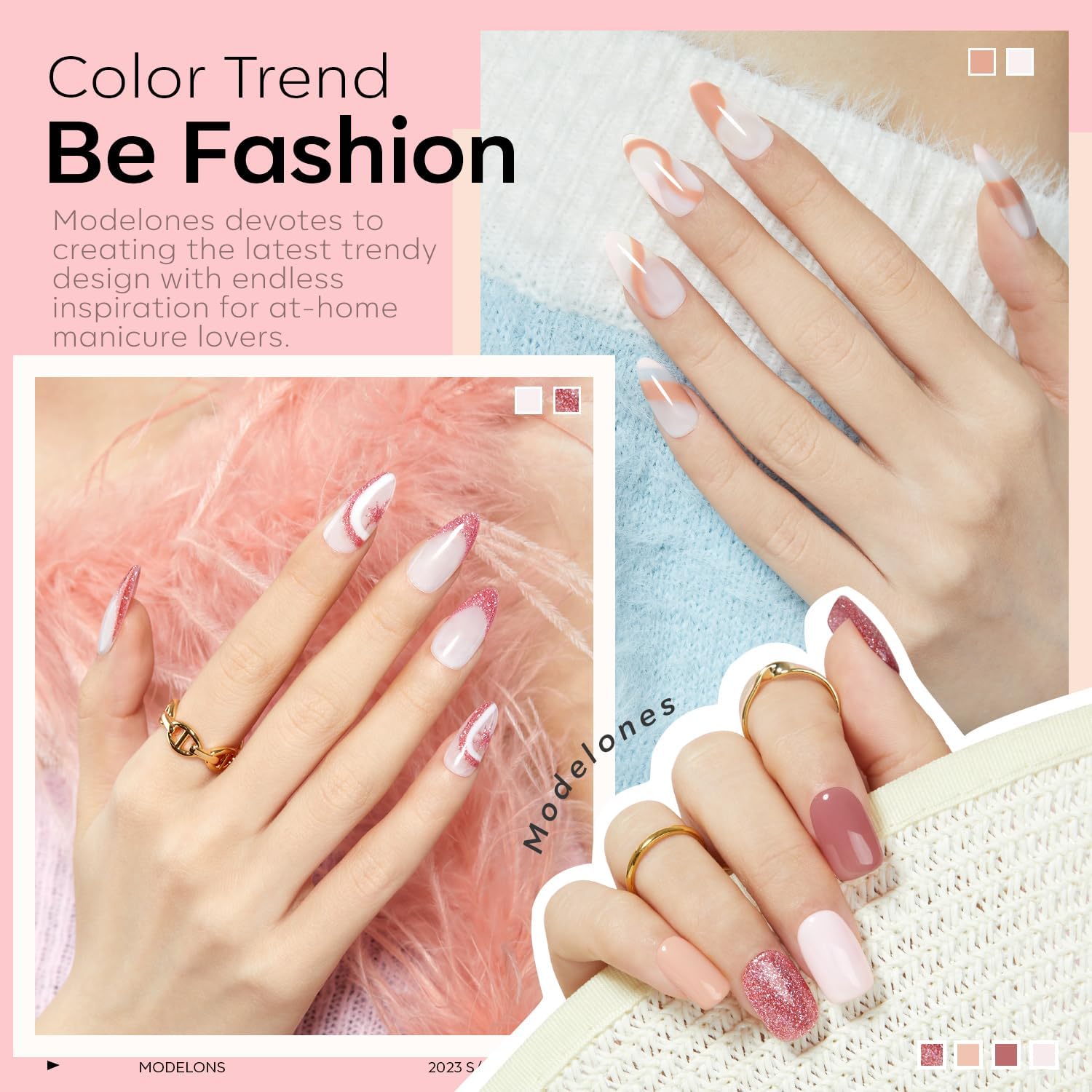 Das Modelones UV Gel Nagellack Set enthaelt sechs aufeinander abgestimmte Farbtoene in Rosa-, Nude-, Weiss- und dezenten Glitzer-Nuancen. Das Set eignet sich fuer elegante, zeitlose Nageldesigns und kann zu verschiedenen Anlaessen und Jahreszeiten verwendet werden.