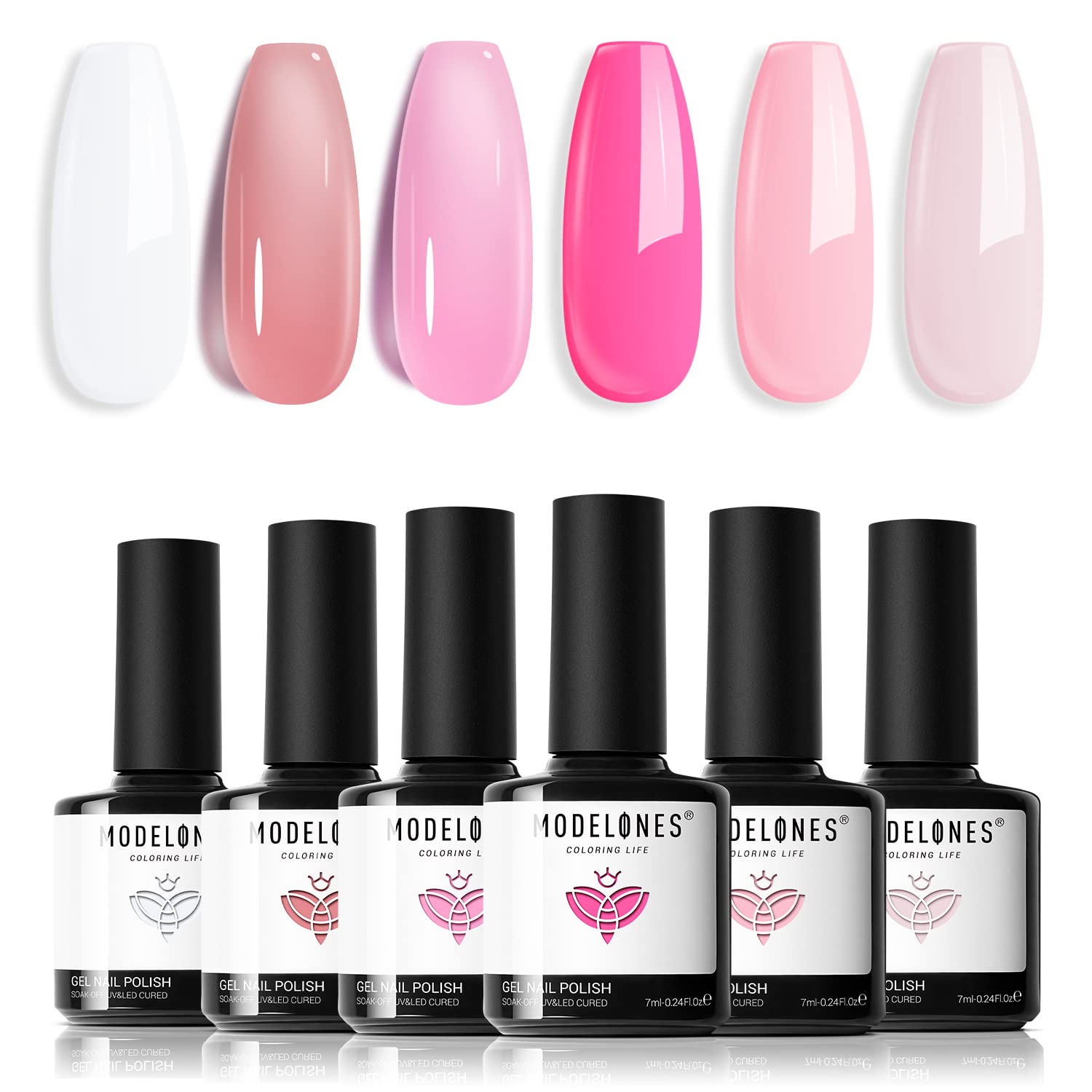 Modelones UV Gel Nagellack Set Nude Rosa Weiss, transparent Pink, 6 Farben, mit Nail Art Liner Brush, Soak-Off