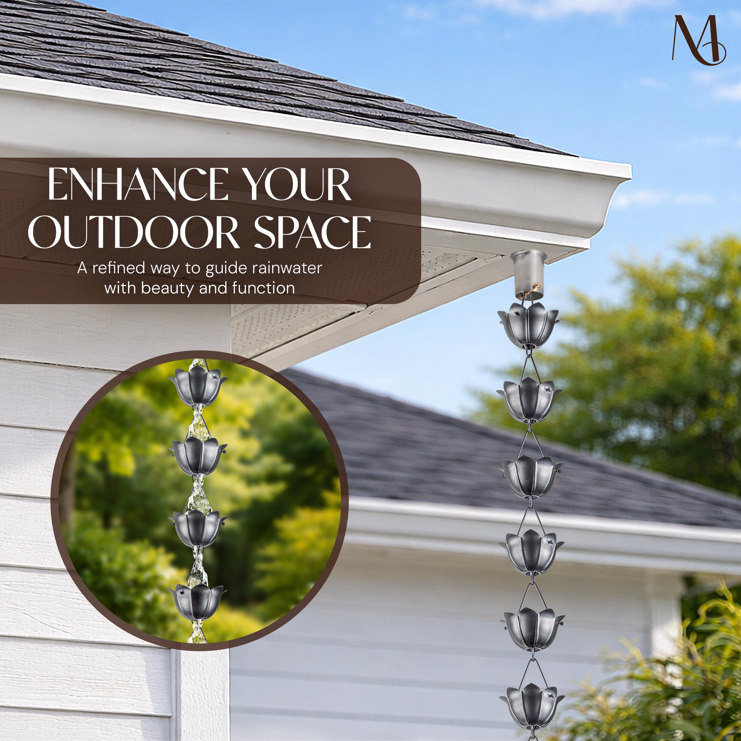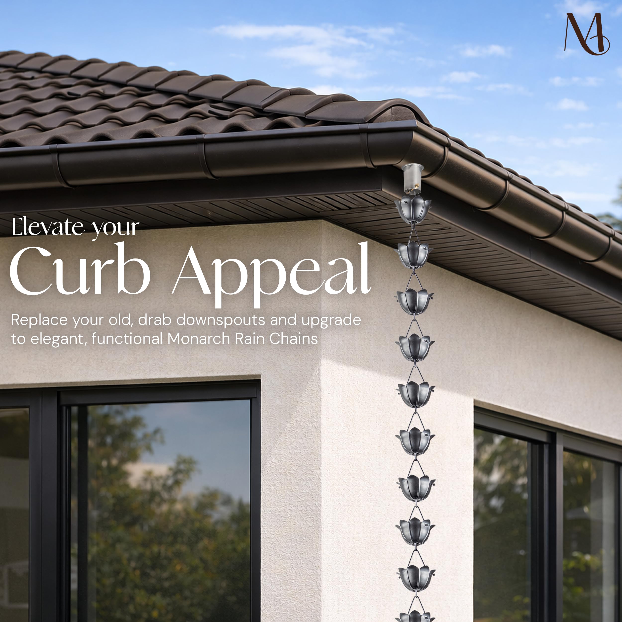 Verwenden Sie dieses Stück als Blickfang in Gärten, Terrassen, Eingängen oder Veranden. Egal, ob Sie die Entwässerung aufwerten oder die Aussendekoration verbessern, Monarch bietet Premium-Regenketten für Dachrinnen, von Tassen- und Gliederstilen bis hin zu auffälligen Statement-Designs. Wählen Sie Monarch für wunderschön gearbeitete dekorative Regenketten, die Stil, Nachhaltigkeit und Leistung vereinen.
