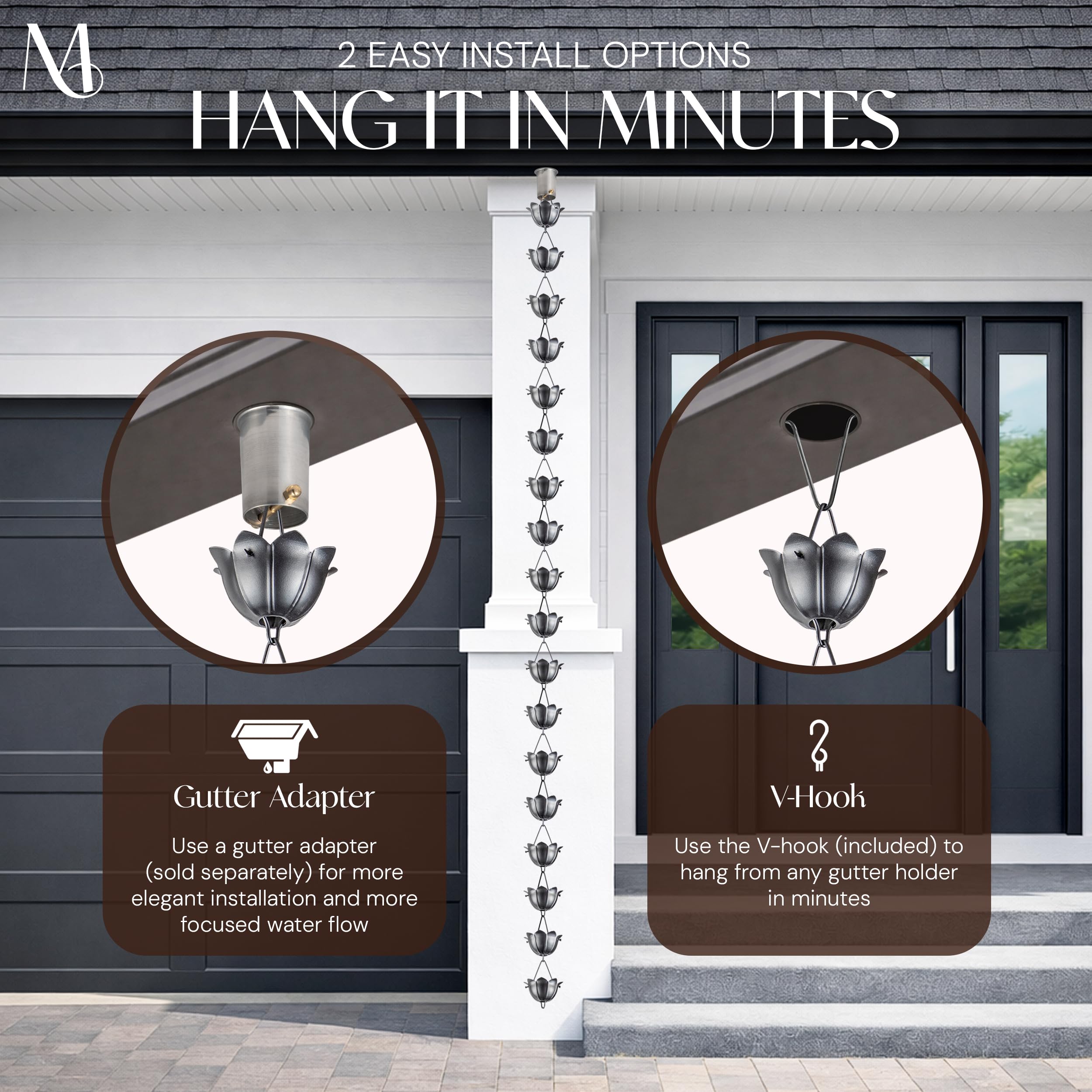 Die Installation ist schnell und einfach. Legen Sie einfach den mitgelieferten 12,7 cm dreieckigen Aufhänger in Ihre Dachrinnenöffnung und hängen Sie die Kette auf – kein Werkzeug erforderlich. Diese hängende Regenkette ist vollständig erweiterbar, sodass Sie zusätzliche Abschnitte verbinden oder Glieder entfernen können, um die perfekte Länge zu erreichen. Durch sein grösseres Gliederprofil eignet er sich für grosse Regenketten für Dachrinnen und grössere Dachlinien.