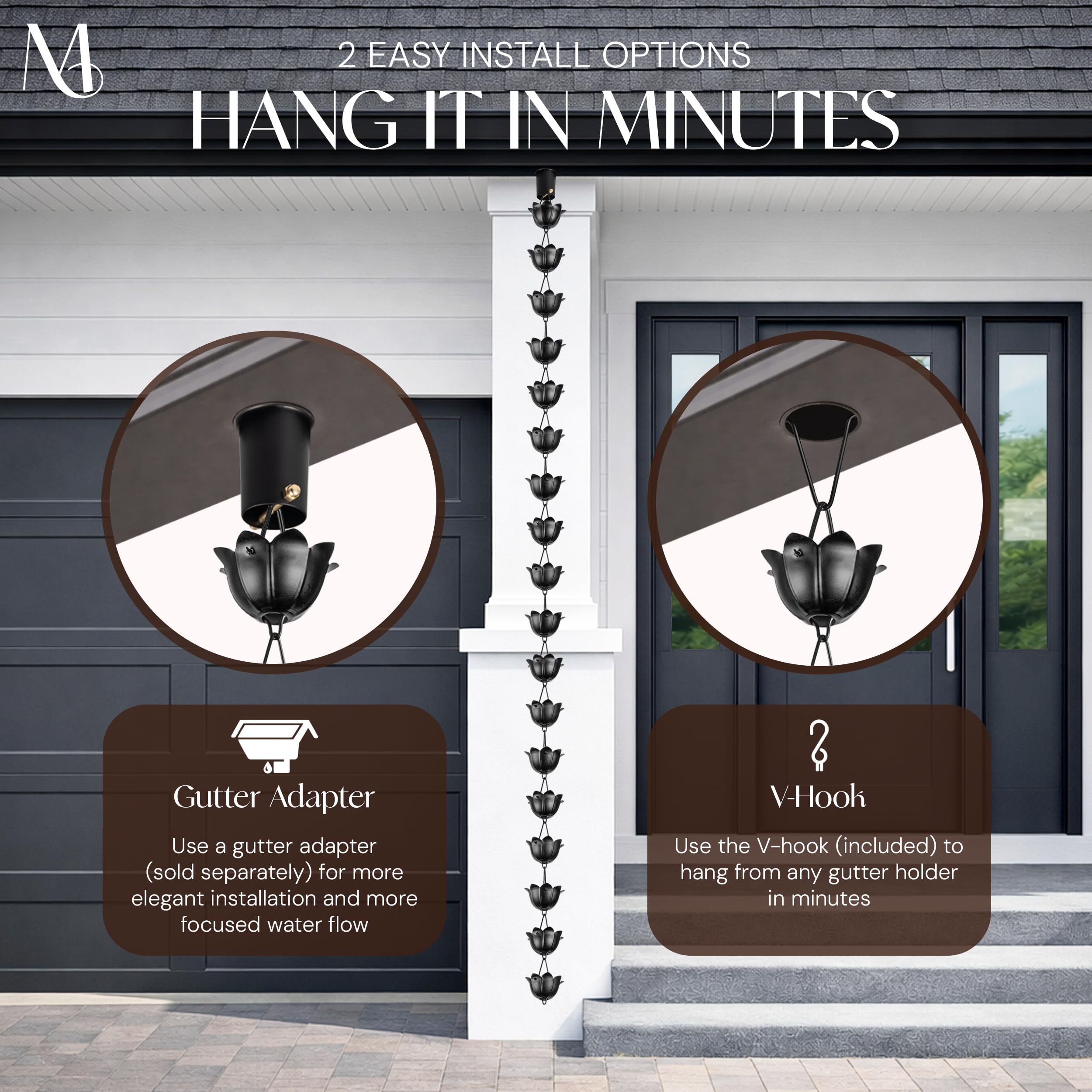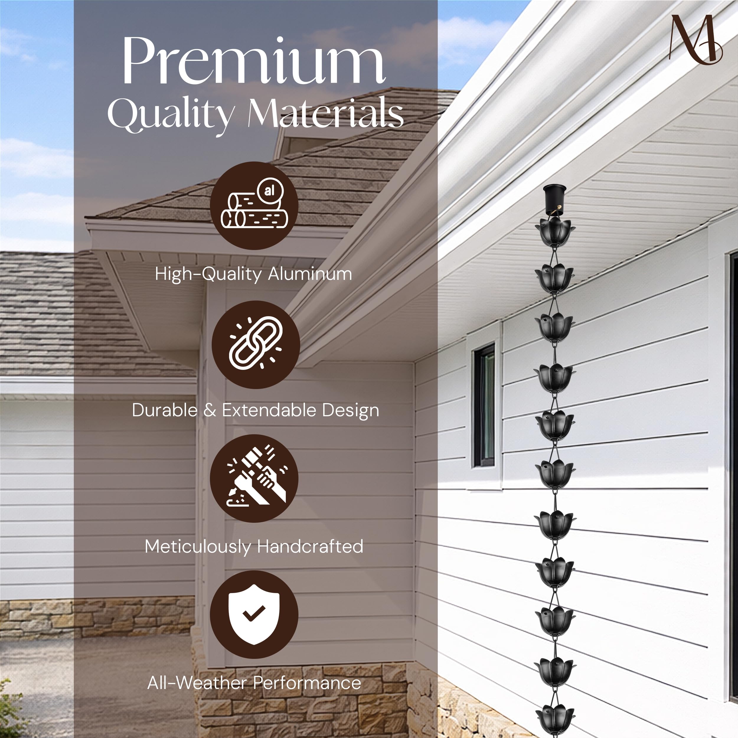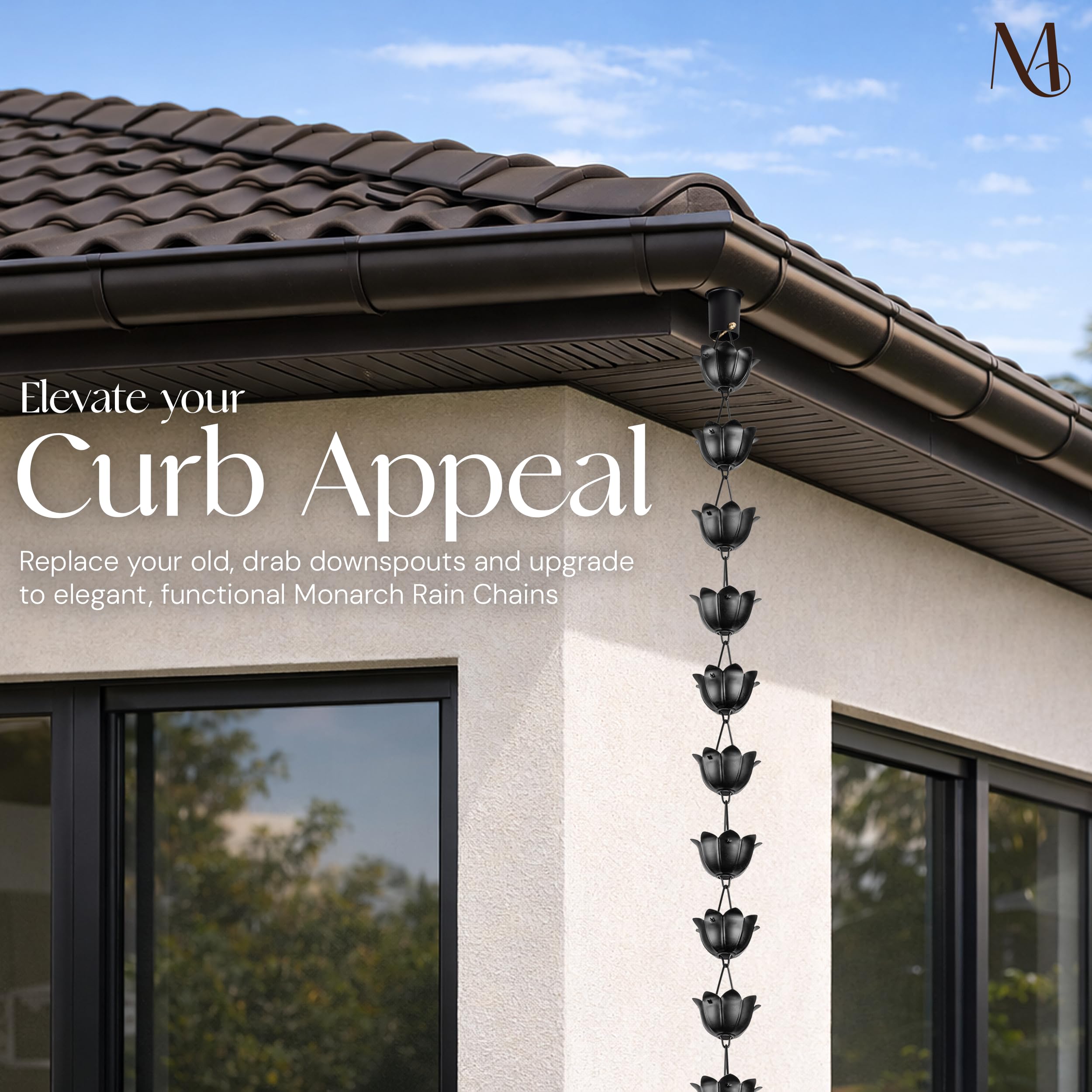Verwandeln Sie das Äussere Ihres Hauses mit dieser Aluminium-Lotus-Regenkette, inspiriert von der exotischen Lotusblüte. Sie wurde entwickelt, um die alltägliche Aufgabe, Regenwasser zu leiten, in ein schönes Erlebnis zu verwandeln. Mit ihrem stilvollen mattschwarzen Finish ist diese Regenkette in Perfektion handgefertigt. Die grossen Becher fangen Regenwasser effizient auf und leiten es ab, was diese Regenkette für Dachrinnen sowohl zu einem funktionalen als auch dekorativen Stück macht. Der Besitz dieses Regenketten-Fallrohrs bedeutet, die Ästhetik Ihres Gartens zu verbessern und gleichzeitig das Regenwasser effizient zu verwalten. Jeder der 18 lotusförmigen Becher ist so gefertigt, dass er Regenwasser effektiv einfängt und kanalisiert, um sicherzustellen, dass Ihre Dachrinnen nicht nur funktional, sondern auch optisch ansprechend sind. Stellen Sie sich vor, wie der Regen den Topfpfahl herunterfällt und ein beruhigendes Wasserspiel schafft, das Ihre Bordstein-Attraktivität erhöht. Diese dekorative Regenfangkette bietet eine künstlerische und zugleich praktische Alternative zu traditionellen Dachrinnen-Fallrohren Perfekt für leichte Schauer und starken Regen, diese Regenkette für Dachrinnen leitet das Wasser effizient vom Dach zum Boden. Wenn Sie es satt haben, mit rostigen, unschönen Regenrinnen-Fallrohren umzugehen, ist diese Regenkette ein Spielwechsler. Hergestellt aus hochwertigem Aluminium, rostfrei und langlebig. Das bedeutet, dass Sie seine Schönheit und Funktionalität jahrelang geniessen können, ohne sich Gedanken über Verschleiss machen zu müssen. Ausserdem ist es eine grüne Alternative zu traditionellen Fallrohren und ermöglicht es Ihnen, Regenwasser zur Wiederverwendung zu sammeln. Einfach zu installieren mit dem mitgelieferten 12,7 cm dreieckigen Aufhänger – kein Werkzeug erforderlich – diese Regenkette ist ein Kinderspiel zu installieren. Verlängern Sie die Länge, indem Sie zusätzliche Regenketten verbinden, oder vervollständigen Sie den Look mit kompatiblen Zubehörteilen wie Becken, Dachrinnenadaptern oder Ankerpfähle. Hauptmerkmale: • Inklusive 12,7 cm dreieckigem Aufhänger für schnelle, werkzeuglose Montage. • Schwer, mit ihrem stilvollen mattschwarzen Finish ist diese Regenkette bis zur Perfektion handgefertigt. • Inspiriert von der exotischen Lotusblüte, besteht sie aus hochwertigem Aluminium und ist rostbeständig. • Kompatibel mit Regenkettenadapter für Dachrinnen und Verankerungszubehör • Erweiterbar mit zusätzlichen grossen Regenketten für Dachrinnen Verwenden Sie es als Blickfang in Gärten, Terrassen oder Veranden oder verschönern Sie Ihren Eingangsbereich mit dem beruhigenden Klang von fliessendem Wasser. Ideal für moderne Häuser, traditionelle Hütten oder minimalistische Räume. Entscheiden Sie sich für Monarch - der vertrauenswürdige Name in dekorativen Regenketten für Dachrinnen. Von Regenkettenbechern oder Gliederstilen bis hin zu auffälligen Statement-Stücken bieten wir hochwertige Regenfänger für Dachrinnen, die sowohl für Schönheit als auch für Langlebigkeit gefertigt wurden. Jetzt in den Warenkorb legen und Ihr Regenwassersystem neu erfinden!