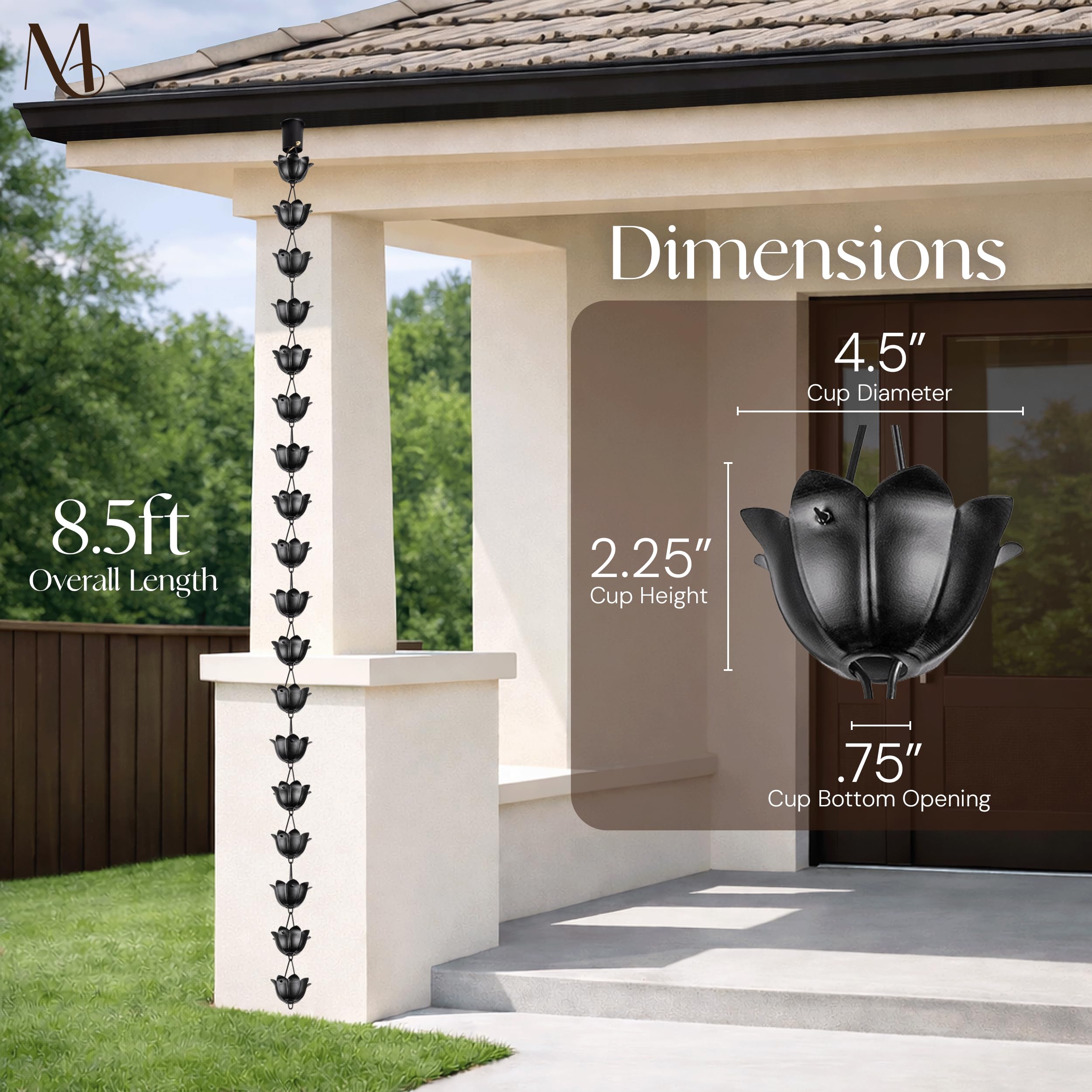 Monarch Rain Chains 18022 Aluminium-Fallrohr für Dachrinnen, grosse Tasse, Lotus, 2,5 m Länge, Ersatz-Fallrohr für Dachrinnen, Regenkette, 2,5 m, Schwarz