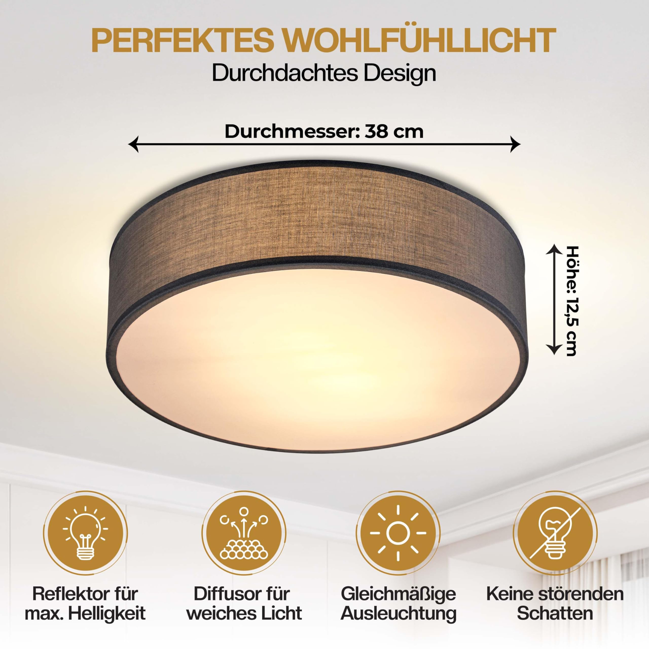 Design-Auswahl: Grau, Taupe, Schwarz, weissLieferumfang: 1x Stoffdeckenlampe nach Wahl, inkl. Montagematerial (3 Dübel und 3 Schrauben)