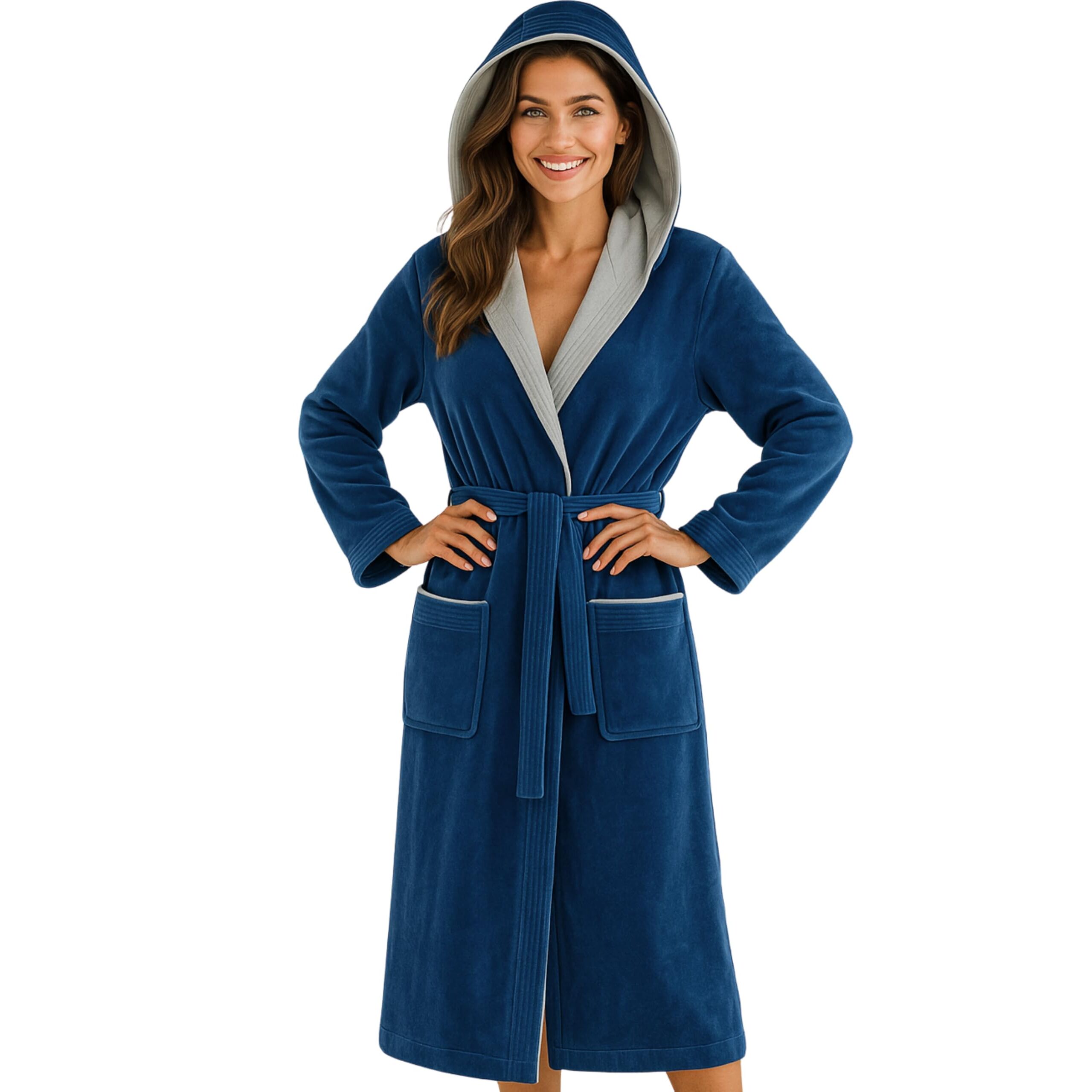 • DETAILS – Der Damenbademantel überzeugt mit einer bequemen Kapuze und zwei geräumigen Taschen für wichtige Utensilien. In einer der Taschen befindet sich zusätzlich eine kleine Reissverschlusstasche, in der Wertsachen sicher verstaut werden können. Ein Bindegürtel sorgt für eine perfekte Passform, und dank der praktischen Aufhängeschlaufe lässt sich der Bademantel einfach an einem Haken aufhängen. So wird er zum perfekten Begleiter.
