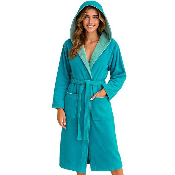 • DETAILS – Der Damenbademantel überzeugt mit einer bequemen Kapuze und zwei geräumigen Taschen für wichtige Utensilien. In einer der Taschen befindet sich zusätzlich eine kleine Reissverschlusstasche, in der Wertsachen sicher verstaut werden können. Ein Bindegürtel sorgt für eine perfekte Passform, und dank der praktischen Aufhängeschlaufe lässt sich der Bademantel einfach an einem Haken aufhängen. So wird er zum perfekten Begleiter.