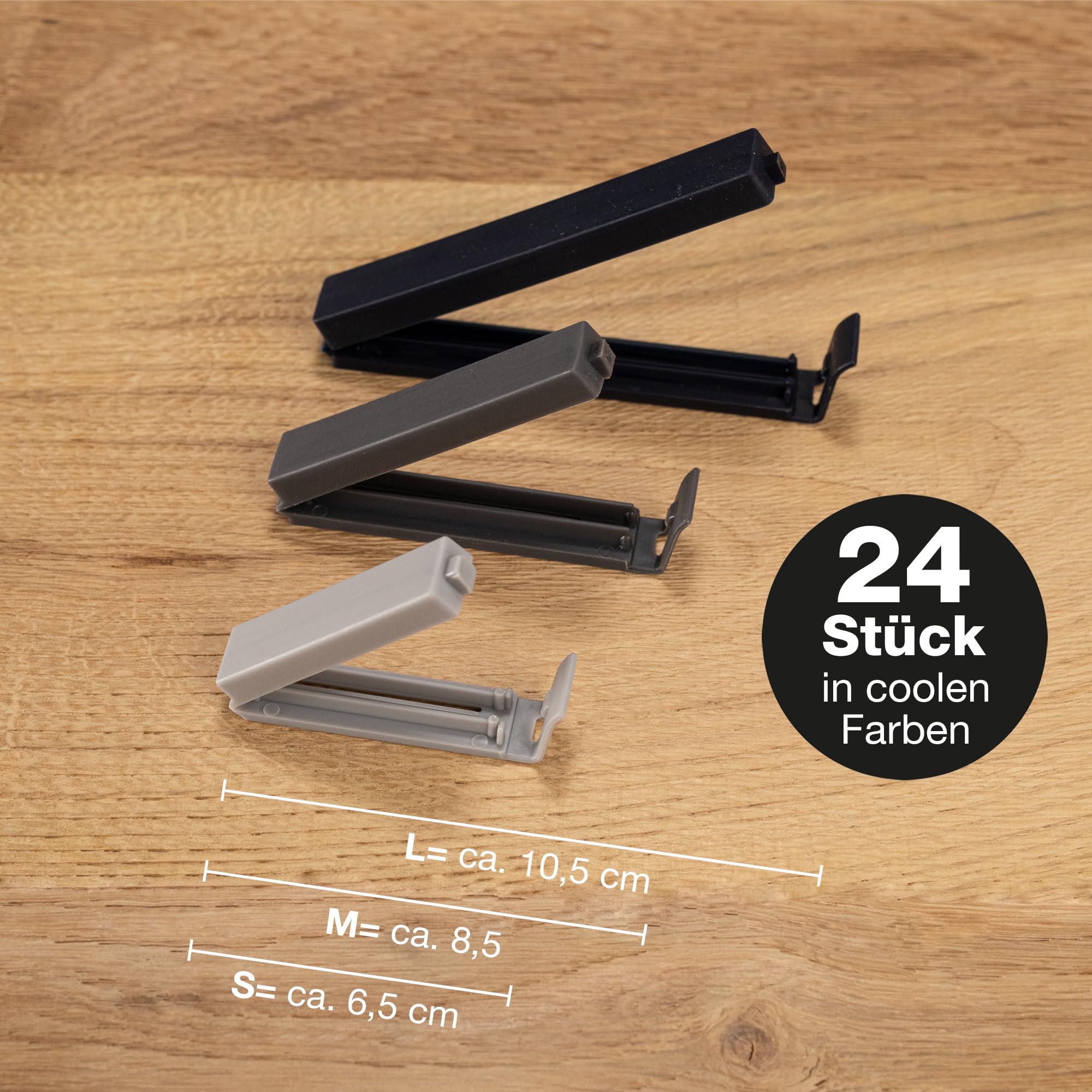Moritz & Moritz 24 Verschlussclips – inkl. praktischer Box – Clips für Tüten – Tütenclips für Lebensmittelaufbewahrung – auch als Gefrierbeutel Clips geeignet