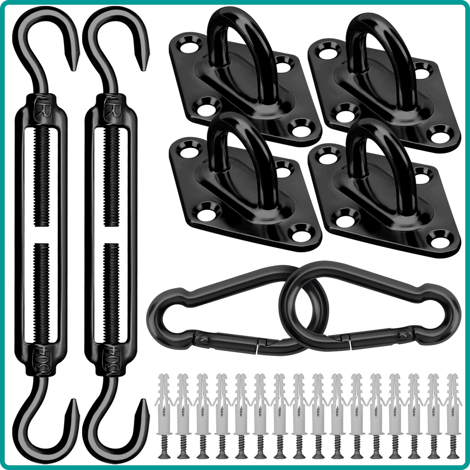 Sonnensegel-Set: enthält 2 x M8-Federhaken, 2 x M8-Spannschlösser, 4 x Wandhalterungen, 16 x Schrauben, 16 x Kunststoffanker, Schattensegel-Hardware-Kit, 40-teiliges robustes Segelbefestigungsset für die Installation von rechteckigem Gartensegel, quadratisch und dreieckig auf Terrassenmarkise, 304 Edelstahl