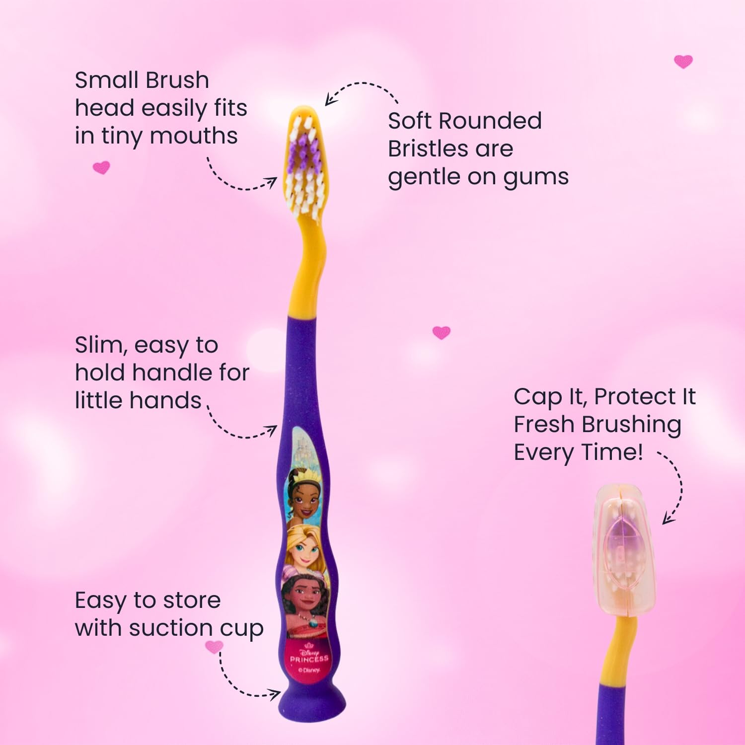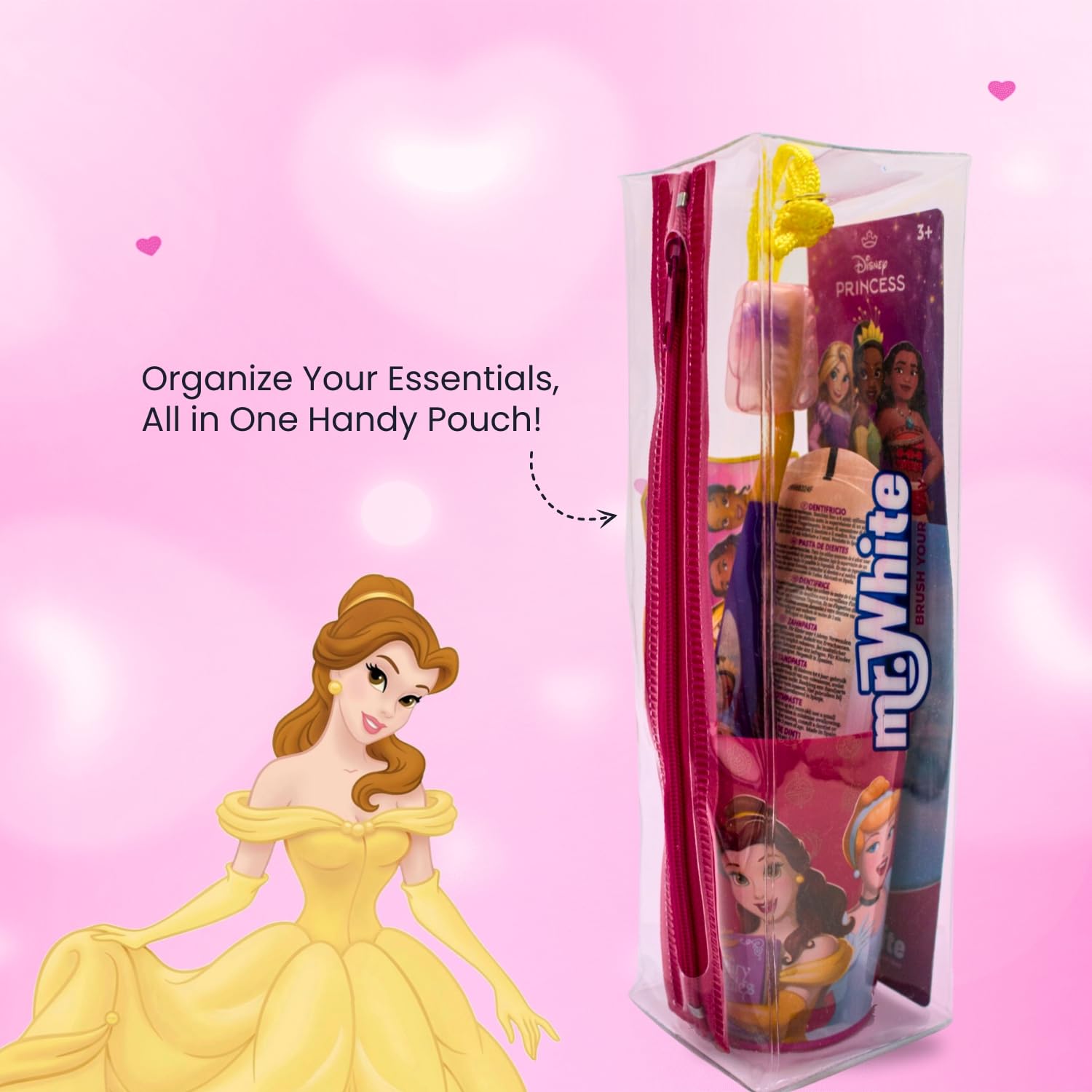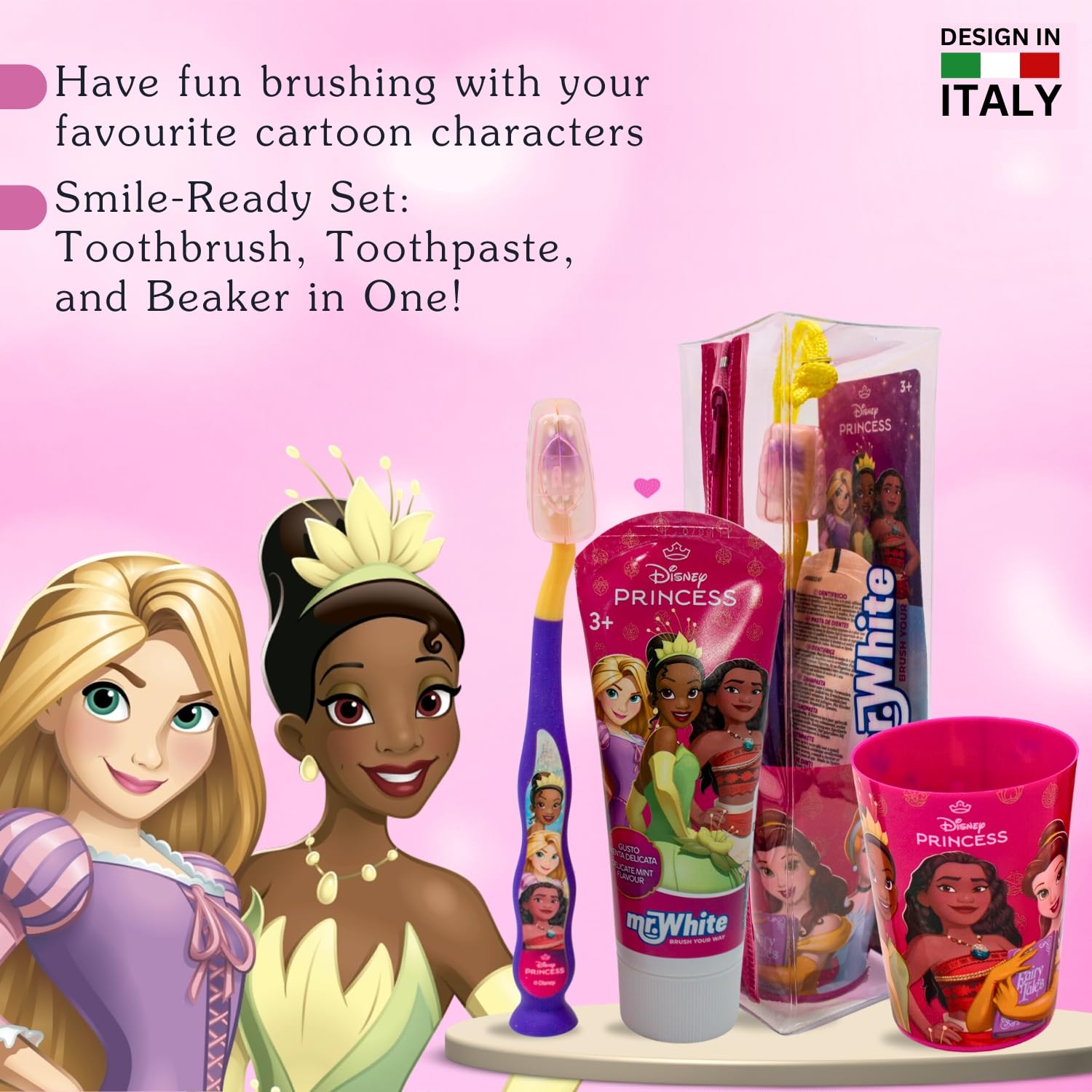 Mr.White Prinzessinnenbeutel Set für Kinder - Zahnbürste mit Saugnapf am Boden, Borstenabdeckung, zarte Kinderzahnpasta mit Minzgeschmack, Format 75 ml und Glas