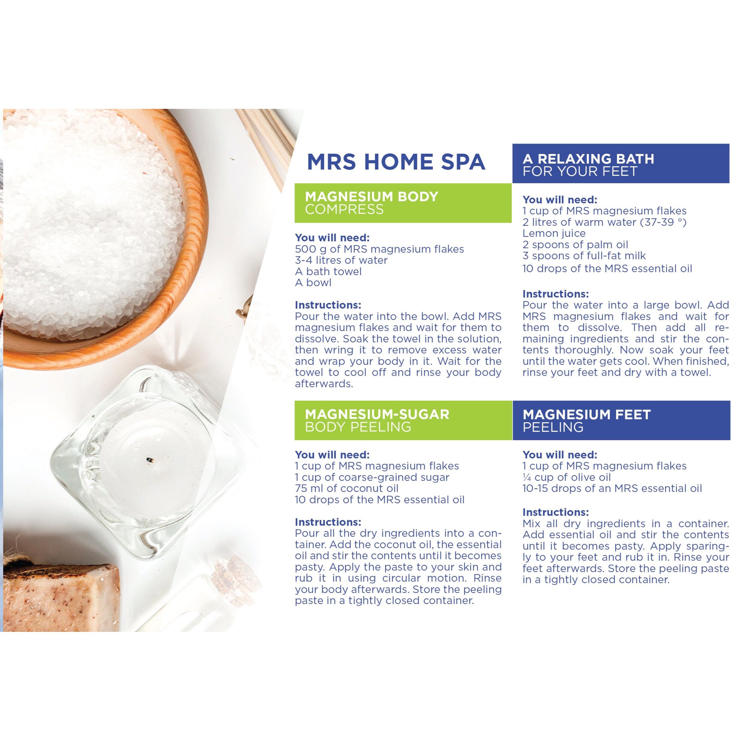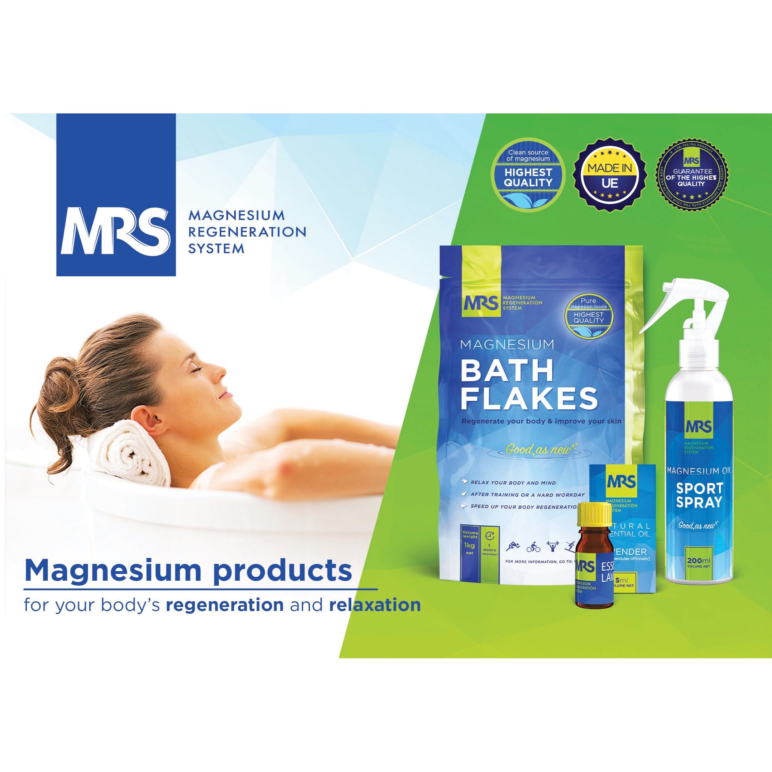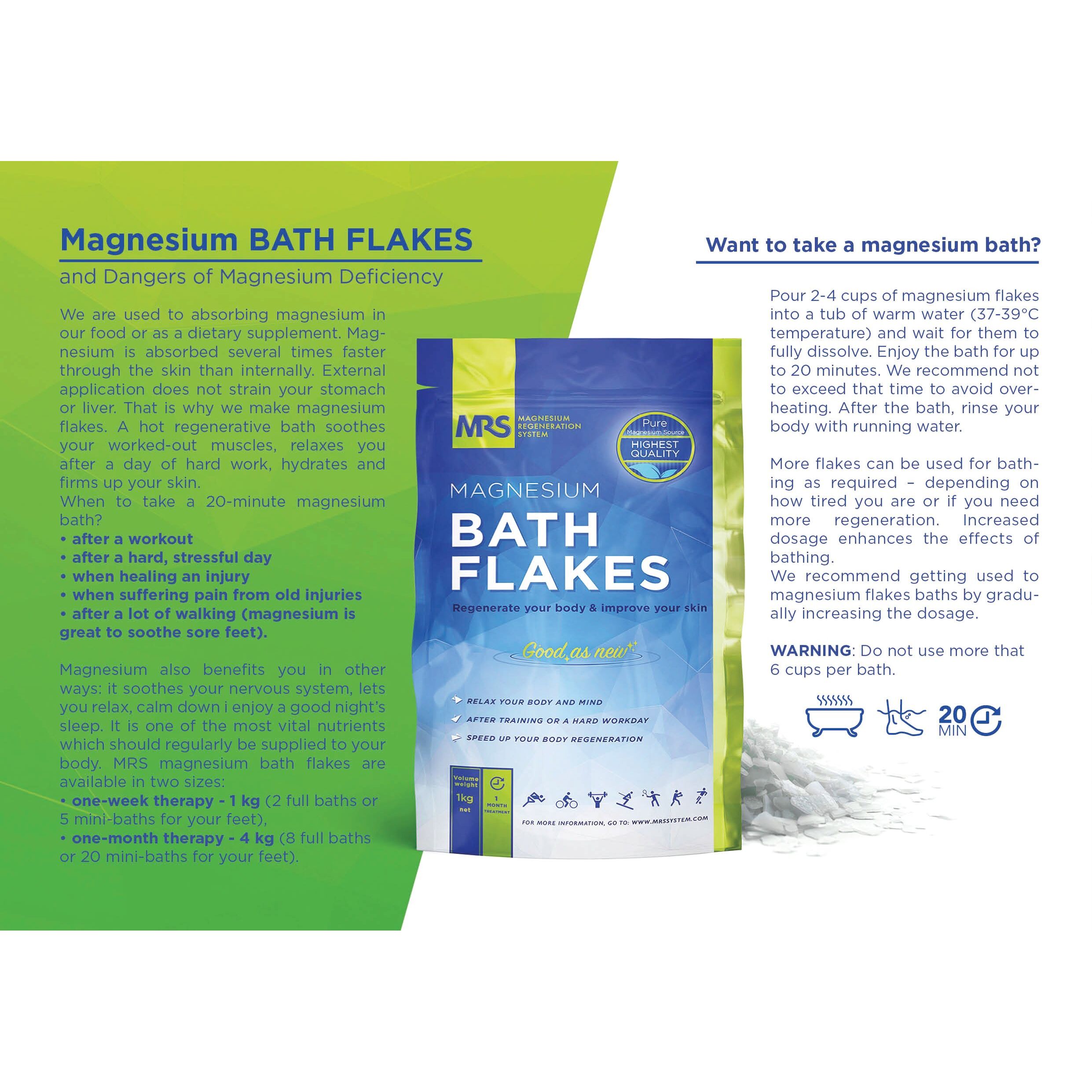 Die heilende Kraft des MagnesiumsMagnesium ist das zweitwichtigste Nährstoffelement für den menschlichen Organismus und schützt vor einer Cholesterinbildung, Bluthochdruck, Muskelkrämpfen, Stress und schützt auch den Herzmuskel vor Sauerstoffmangel, lindert Allergien und Entzündungserscheinungen.Hervorragende Regeneration von Körper und GeistDa Magnesium zur Energiegewinnung und Muskelkontraktion unerlässlich ist, kann sich ein Mangel negativ auf die Gesundheit auswirken. Ein Magnesiummangel, aufgrund einer erhöhten sportlichen Aktivität, kann zu einem Leistungsabfall und Muskelkrämpfen führen. Magnesium wird um ein Vielfaches schneller über die Haut aufgenommen als über das VerdauungssystemWie wird es optimal eingesetzt?2-4 Wassergläser der Flocken (250ml) in einer Badewanne auflösen. Das Bad sollte nicht zu heiss sein, idealerweise sollte die Temperatur 37-39 Grad betragen. Bei Bedarf können Sie die Flockenmenge weiter anpassen, je mehr Flocken Sie verwenden, desto intensiver wird Ihr Bad. Nicht mehr als 6 Wassergläser pro Bad verwenden. 20 Minuten baden, um eine Überhitzung zu vermeiden.Wie oft mit MRS baden? 1–2x pro Woche. Um Ihr Badeerlebnis zu verbessern, verwenden Sie die natürlichen und duftenden MRS ätherischen Öle zum Baden.Wichtig: Möglicherweise wird anfangs ein leichter Juckreiz auf Ihrer Haut spürbar sein, machen Sie sich bitte keine Sorgen, das ist normal. Wenn ein Hautausschlag und Irritationen auftreten, beenden Sie die Anwendung. Wenn einige Flocken nicht schneeweiss, sondern gräulich oder dunkel erscheinen, ist das kein Grund zur Sorge, unsere Flocken sind ein Naturprodukt und werden nicht chemisch behandelt.Inhaltsstoffe: Magnesiumchlorid 1 kg Packung reicht für eine 1-wöchige Behandlung. 4 kg Packung reicht für eine 1-monatige Behandlung.