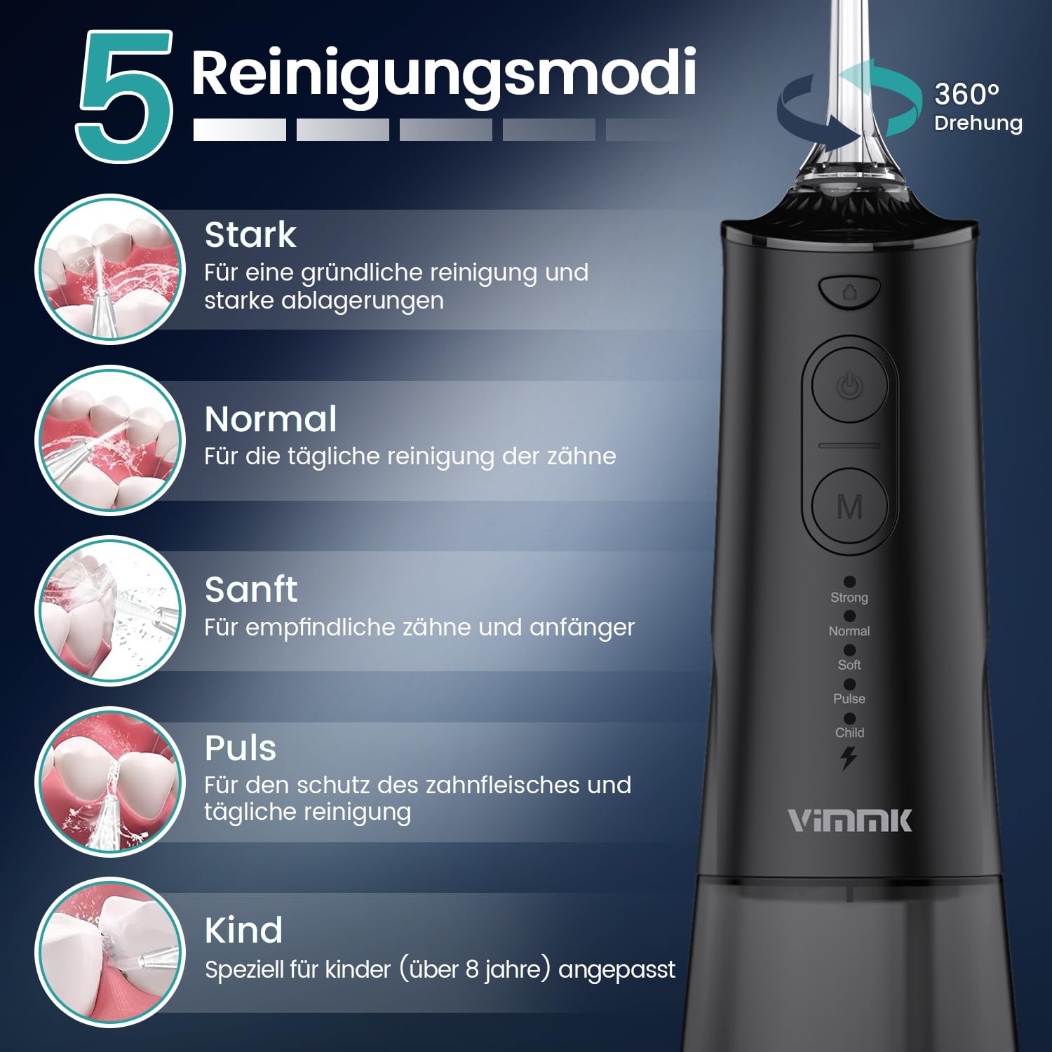 • ????【5 Modi & 8 Mundduschenzubehör】Die Kabellos Munddusche verfügt über 5 Modi (Stark, Normal, Weich, Puls, Kind).4 Standard-Spitzen, 1 Zungenreiniger-Spitze, 1 kieferorthopädische Spitze, 1 Plaque-Sucher Spitze und 1 Parodontal-Spitze erfüllen Ihre vielfältigen Bedürfnisse von der Standardreinigung bis zur Zahnfleischmassage. Mit der um 360 Grad drehbaren Düse können schwer zugängliche Stellen problemlos mit dem elektrischen Zahnreiniger gereinigt werden.